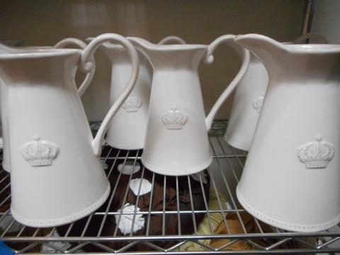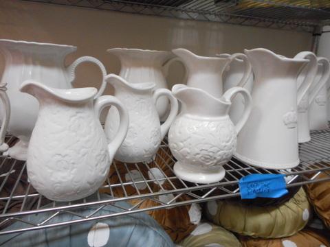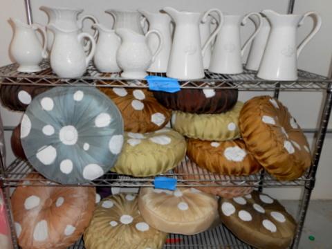 Lot of Ceramic Pitchers & Polka Dot Pillows. (Rack is not included)