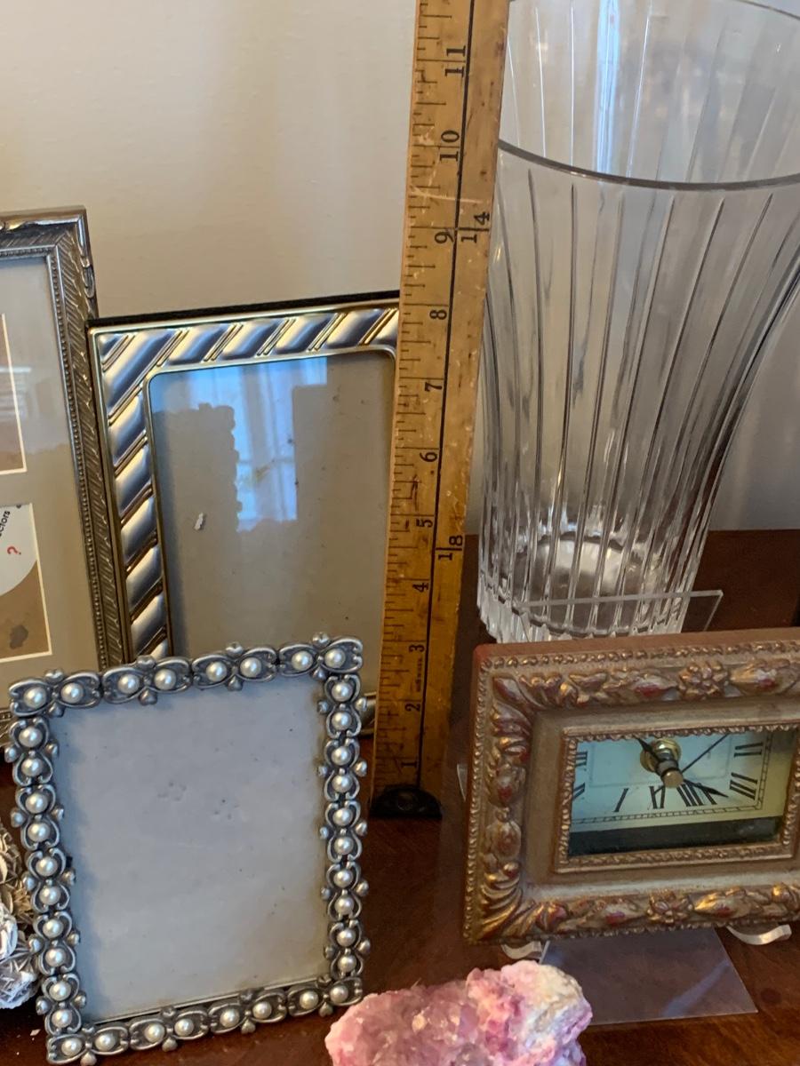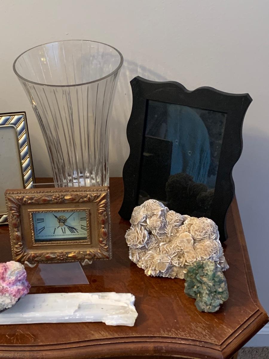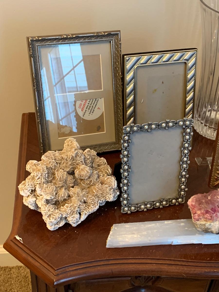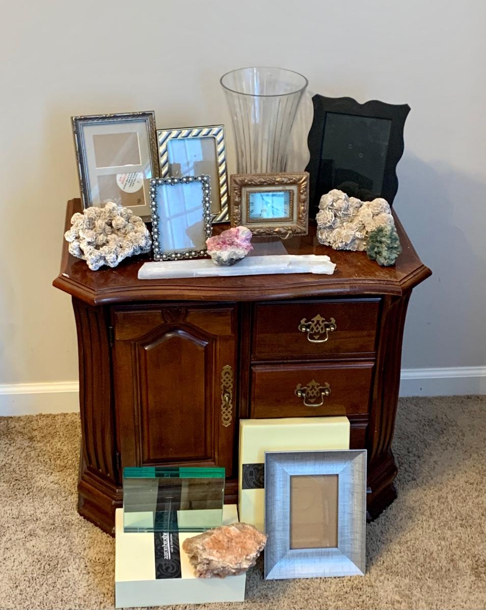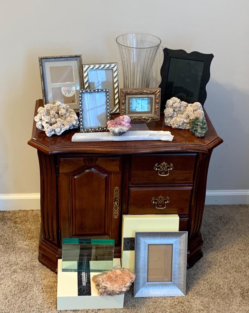 LOT 3R: Broyhill End Table, Frames, Crystal & Healing Stones, Frames, Etc.