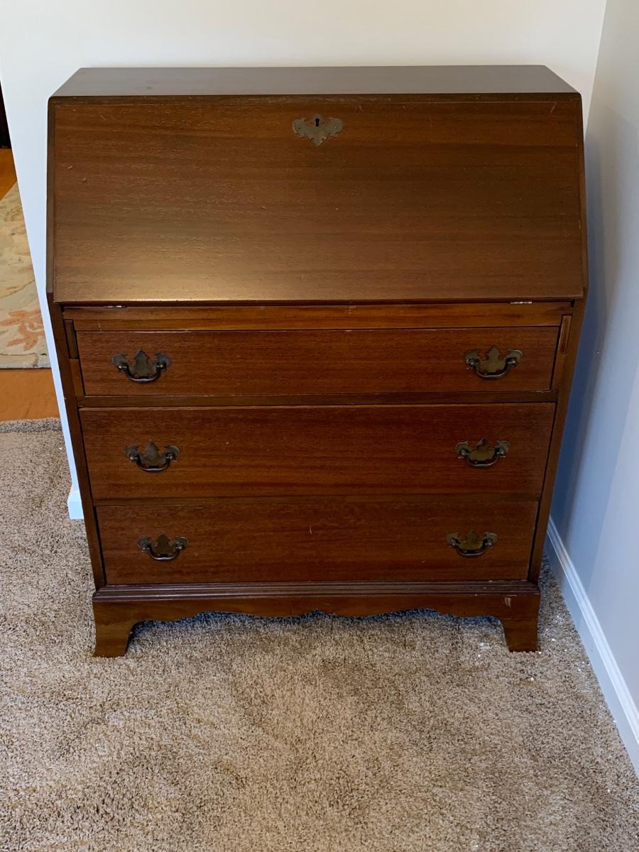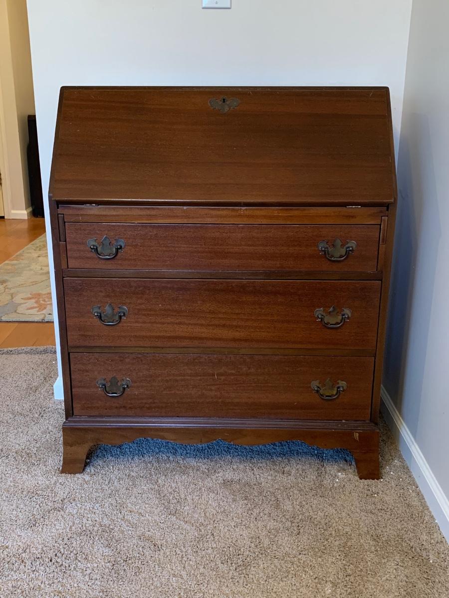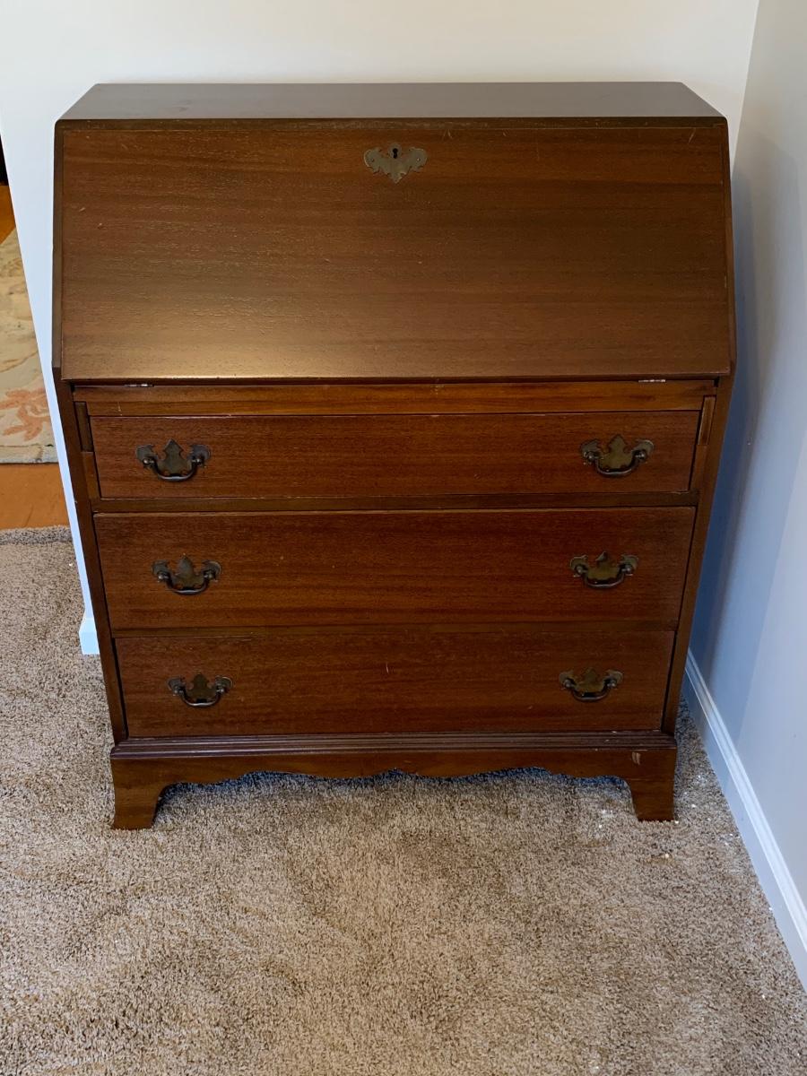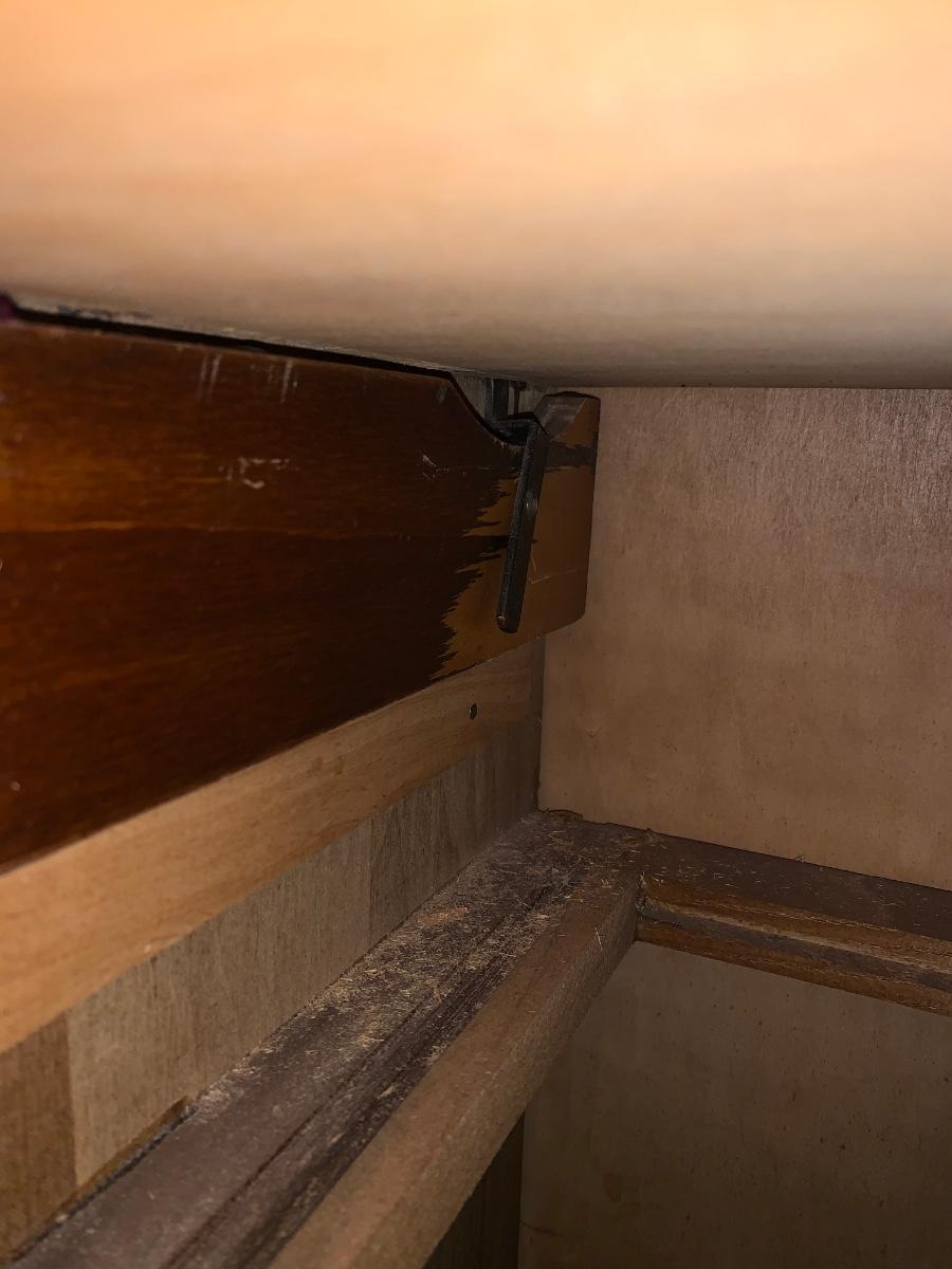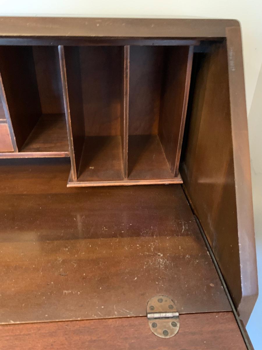Desk is in need of a very minor repair. There is a screw missing from the bracket which allows the desk top to fold up - as pictured.
