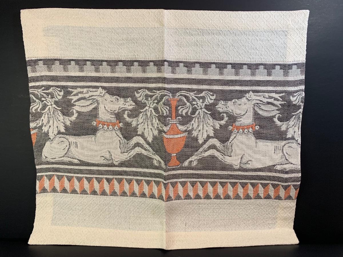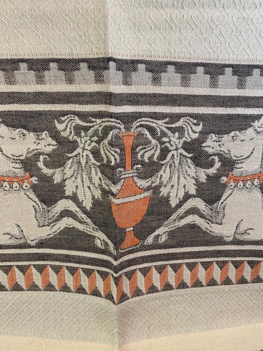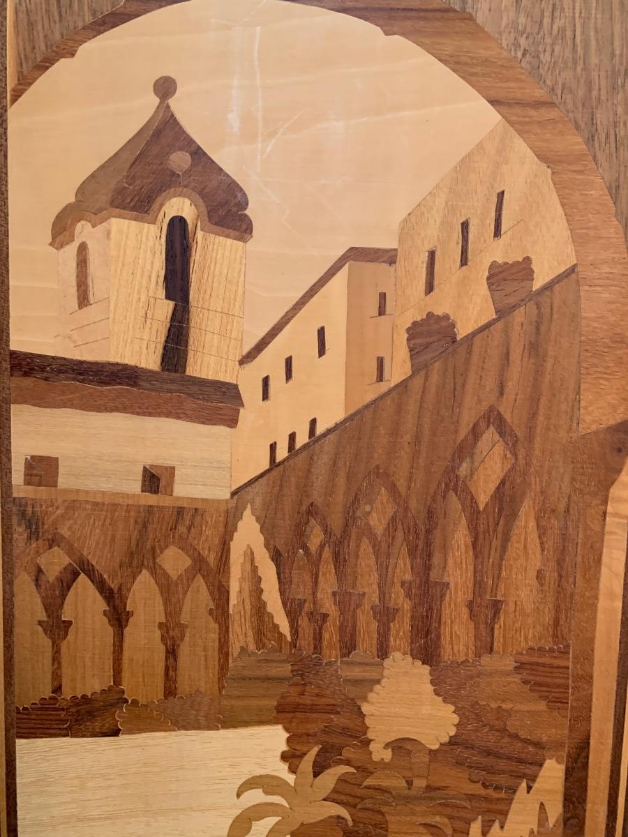 Per out client the inlaid are pieces are from Italy, 1970s. The cloth/ tea towel is designed after a church floor in Siena Italy.