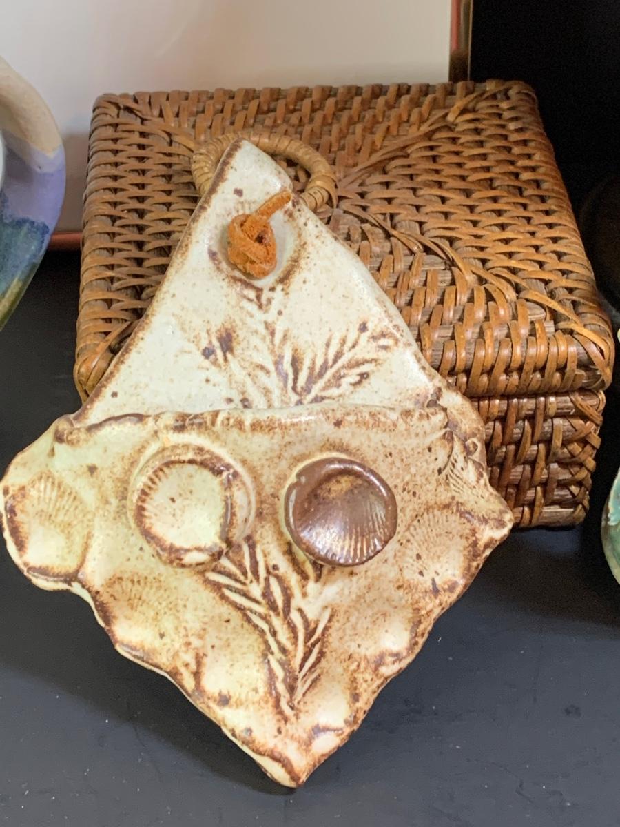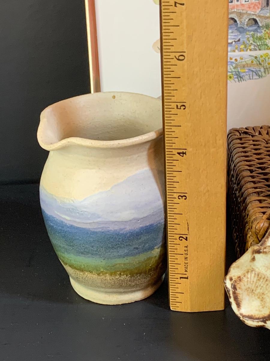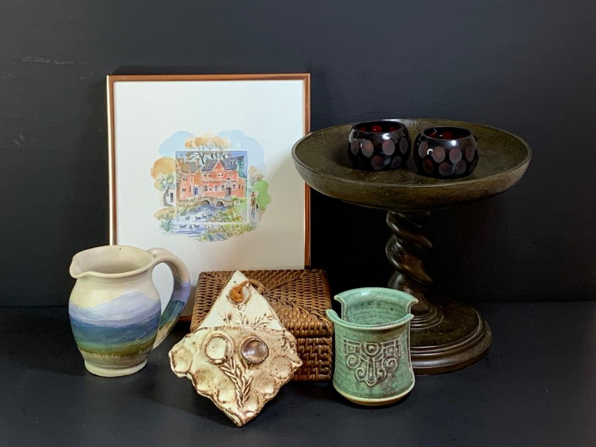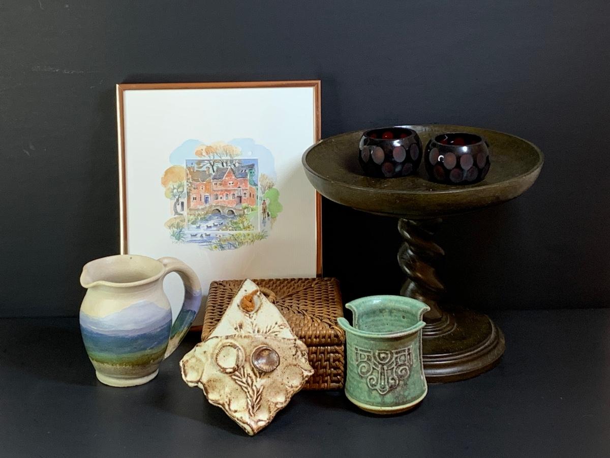 LOT 33R: Pottery: Sponge Holder, Pitcher, Wall Pocket, Signed Watercolor, Pedestal Fruit Dish & More