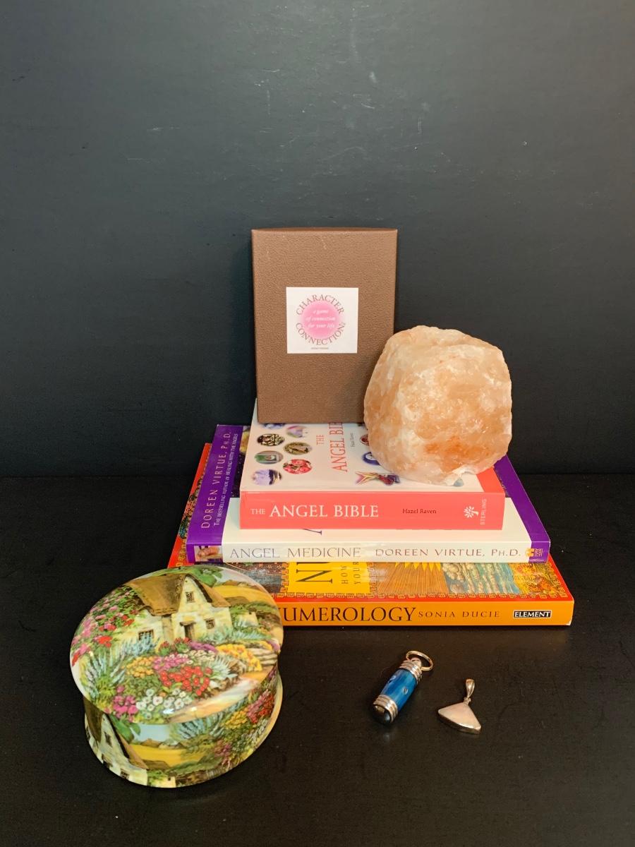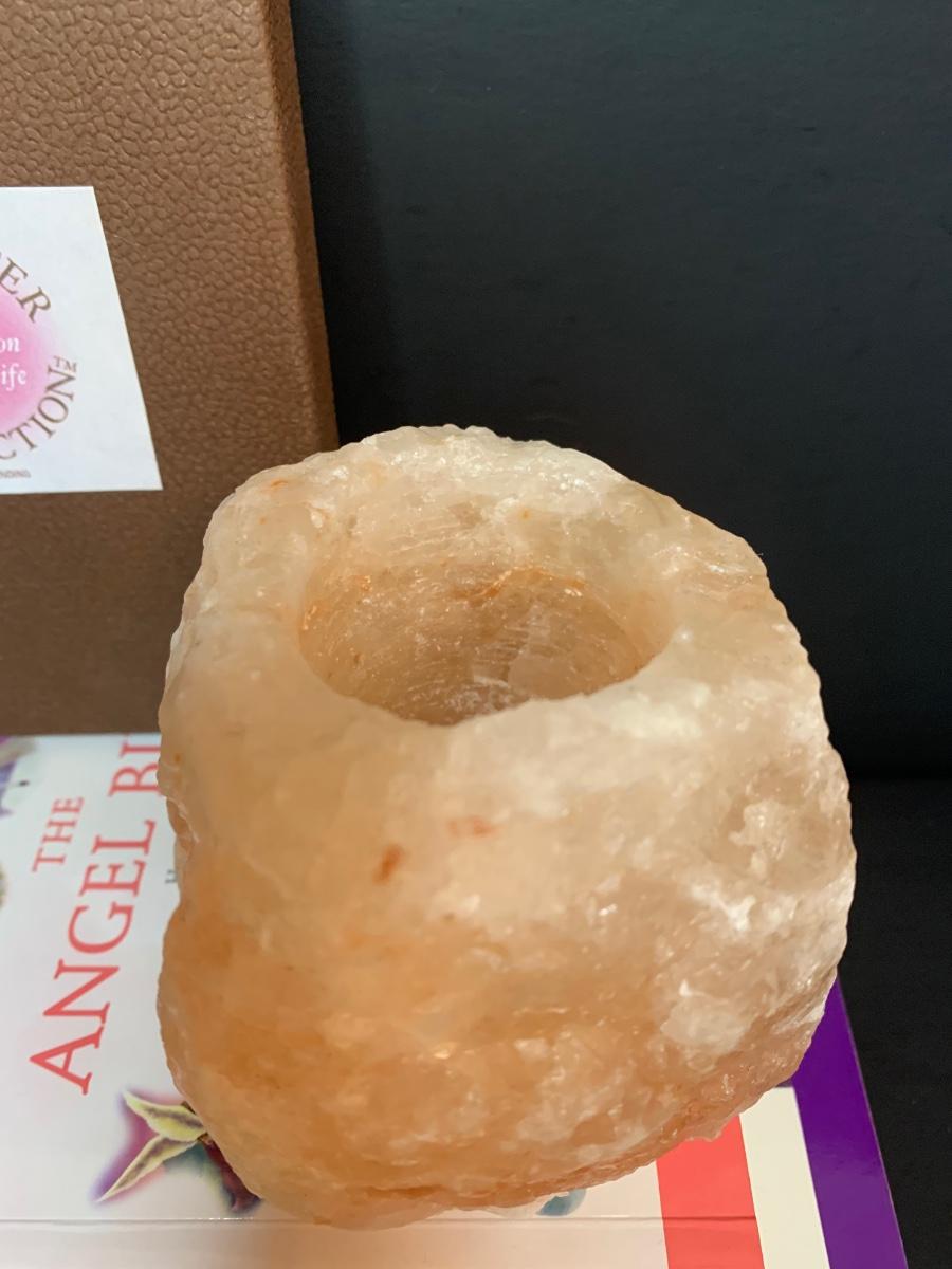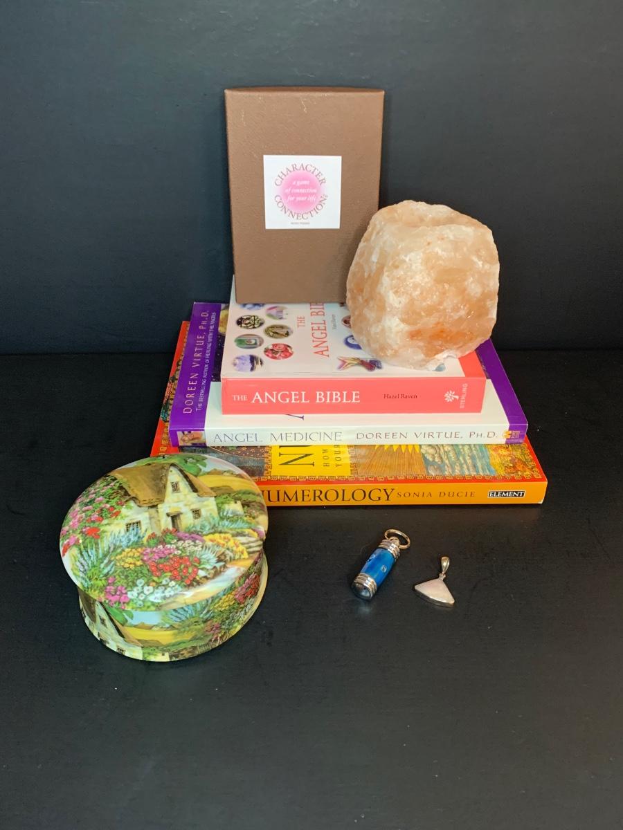 LOT 64R: Himalayan Salt Natural Rock Tea Light Candle Holder, Essential Oil Pendant. Healing Pendant, Trinket Box & Books