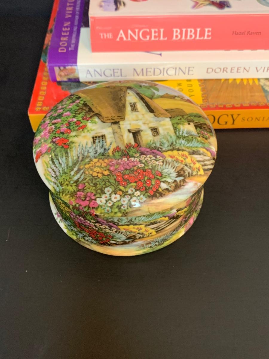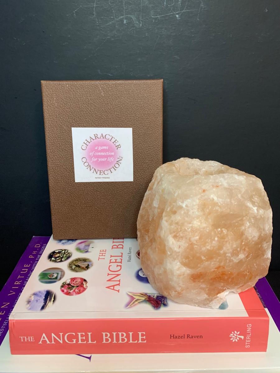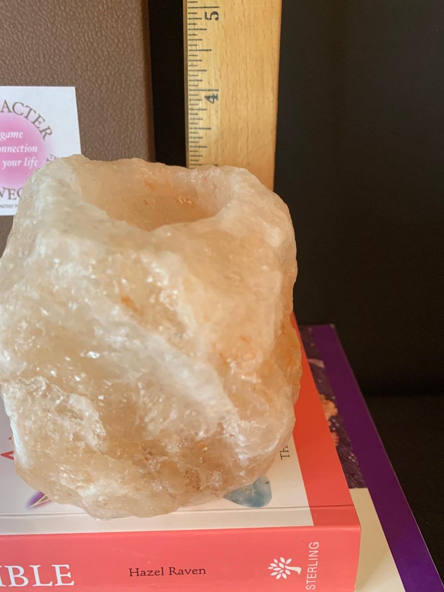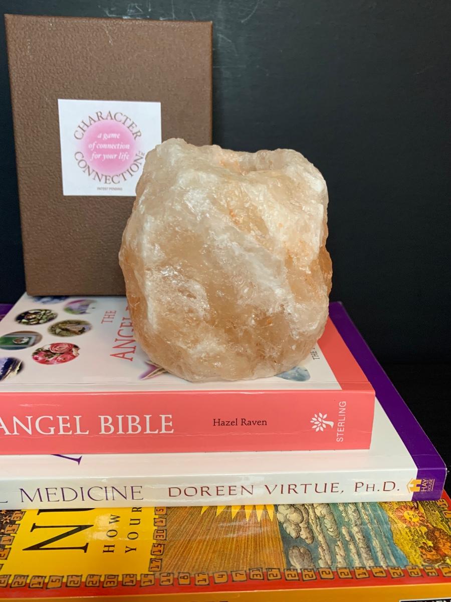 LOT 64R: Himalayan Salt Natural Rock Tea Light Candle Holder, Essential Oil Pendant. Healing Pendant, Trinket Box & Books