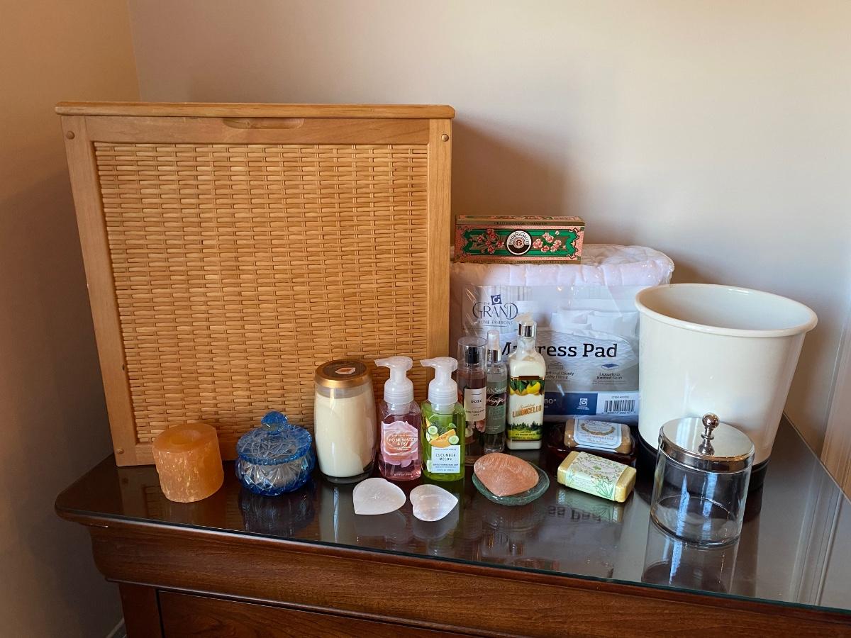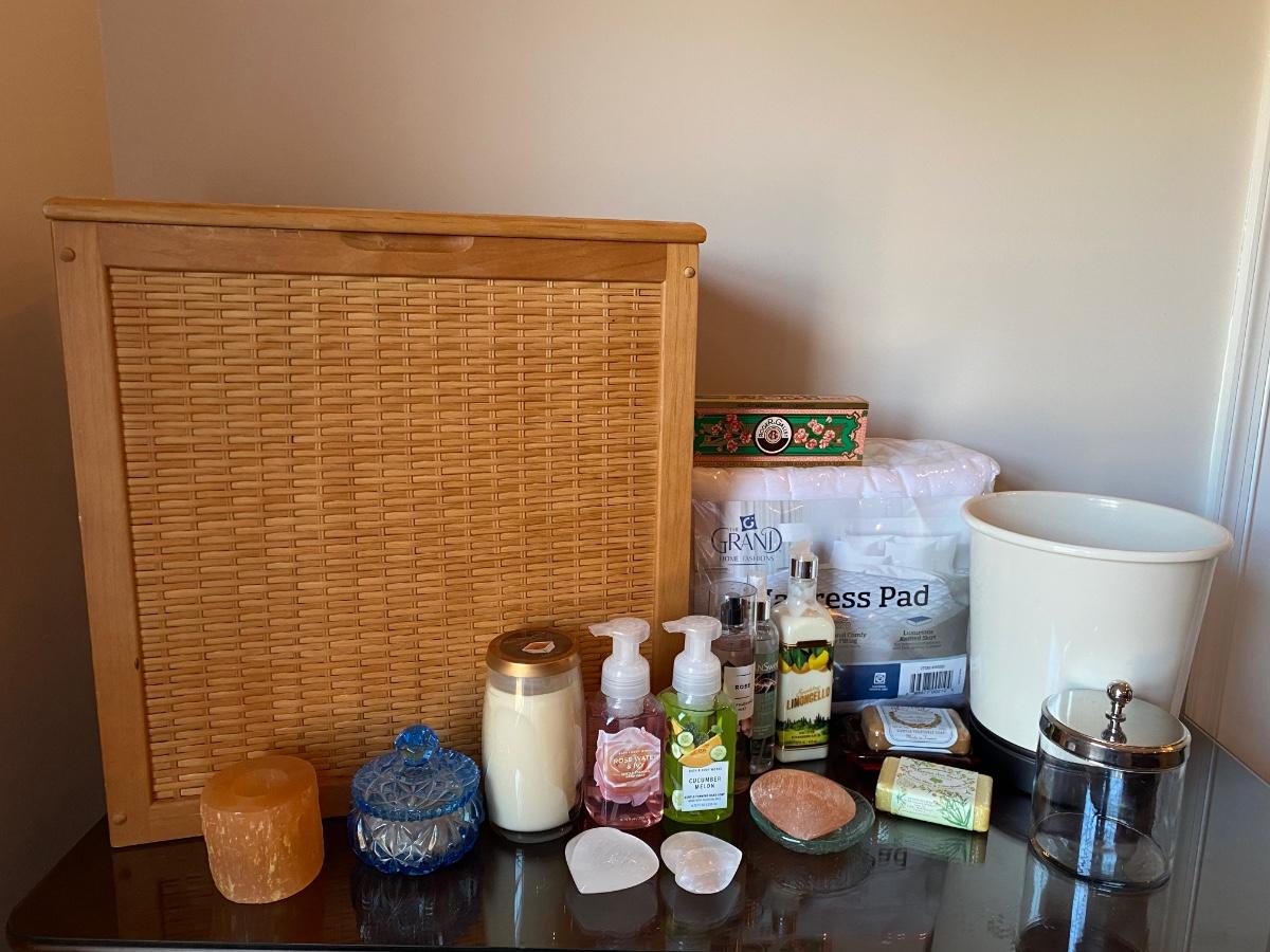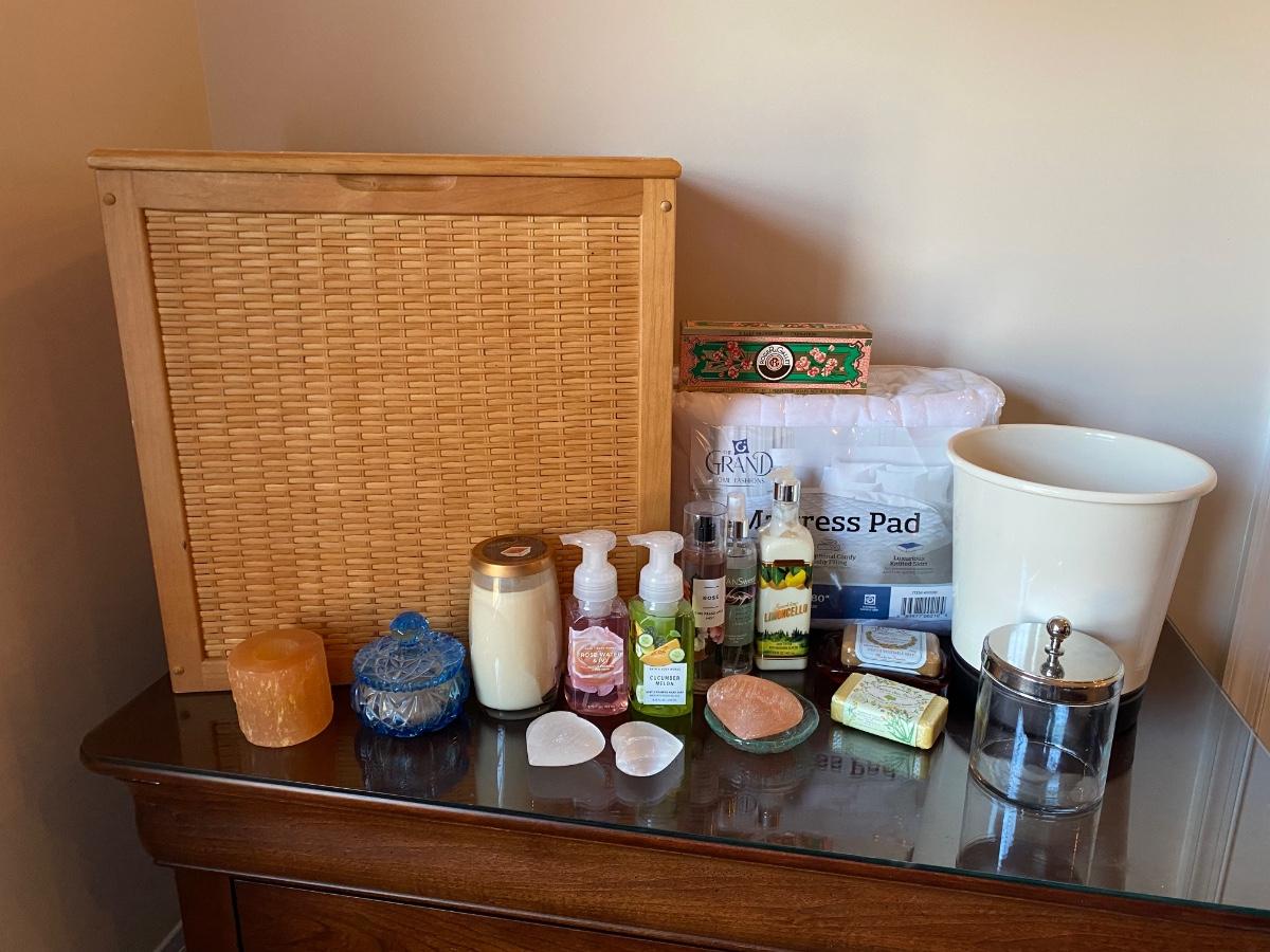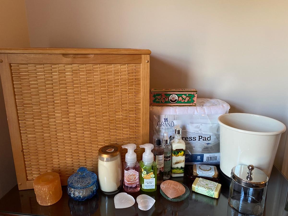 Hamper, candles, crystals, soaps, queen mattress pad and more. Please see all pictures as they are the best representation of the items. The pictures show condition, measurements if taken, and what is included in the lot. Due to the large amount that we photograph and the time frame, we are not always able to take measurements. All items unless noted, are pre-owned and have been used. If you purchased furniture, you must bring help. We do not allow one person to carry large furniture out on their own. Bring help, tools and a truck for the safety of our client’s homes, and your personal safety. Any damages that result to the property including walls, and floors due to moving of the furniture will be charged to the buyer. Company policy. Thank you.