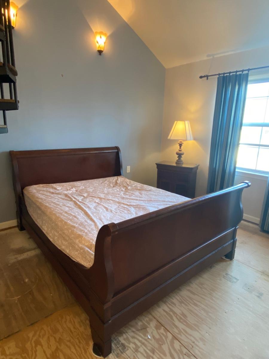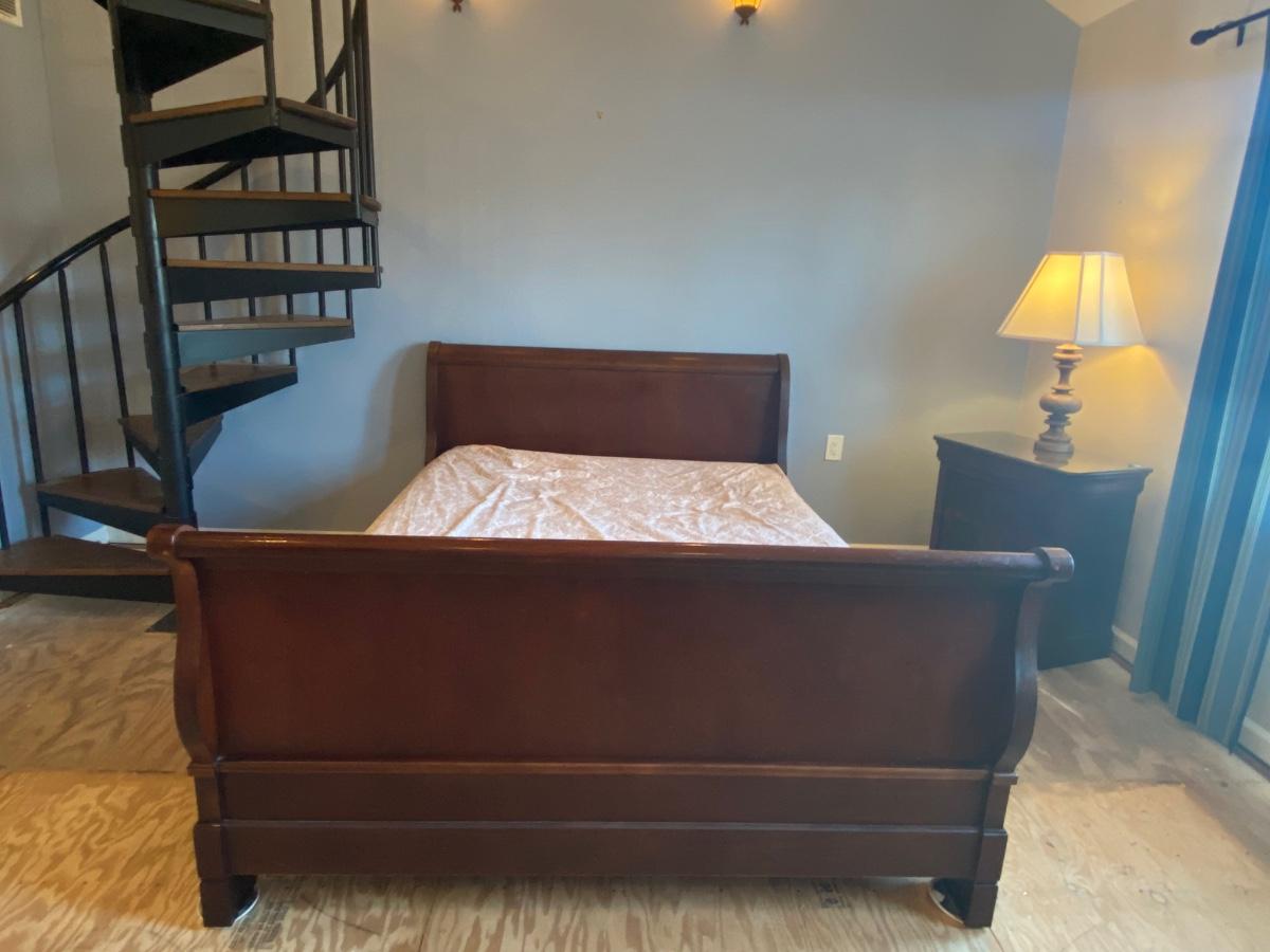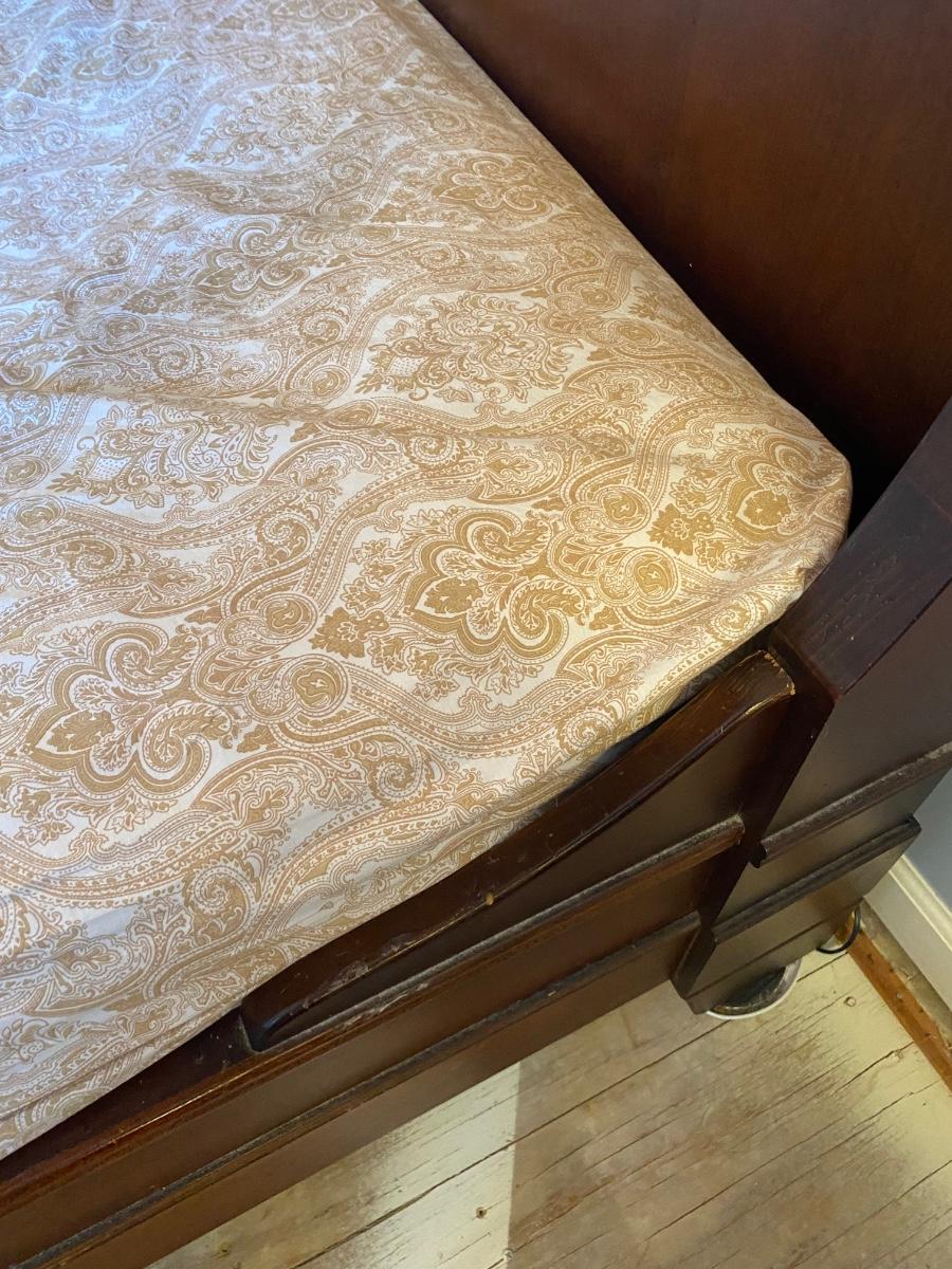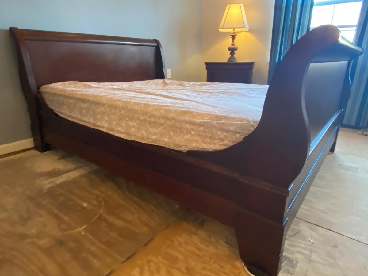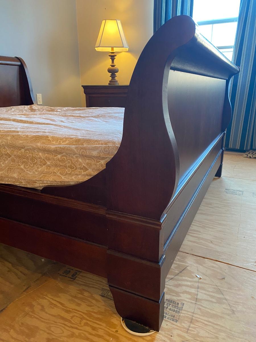 Queen Bed is in good-fair condition. Please notice chip in wood as pictured.