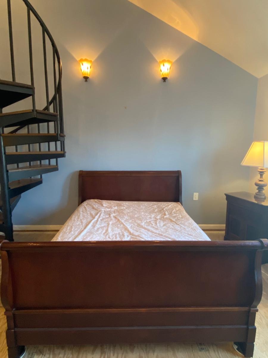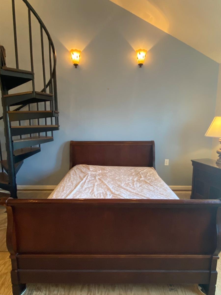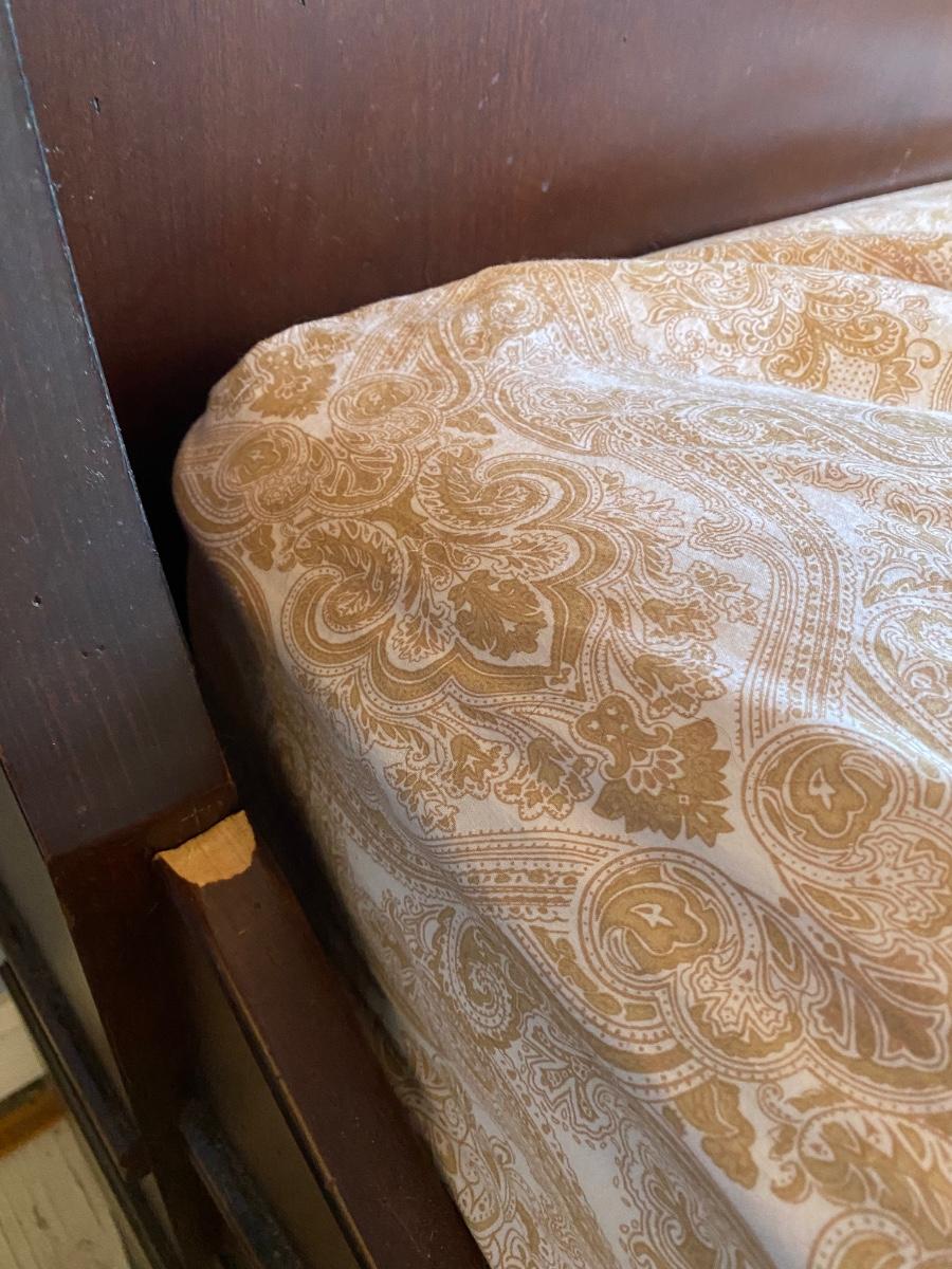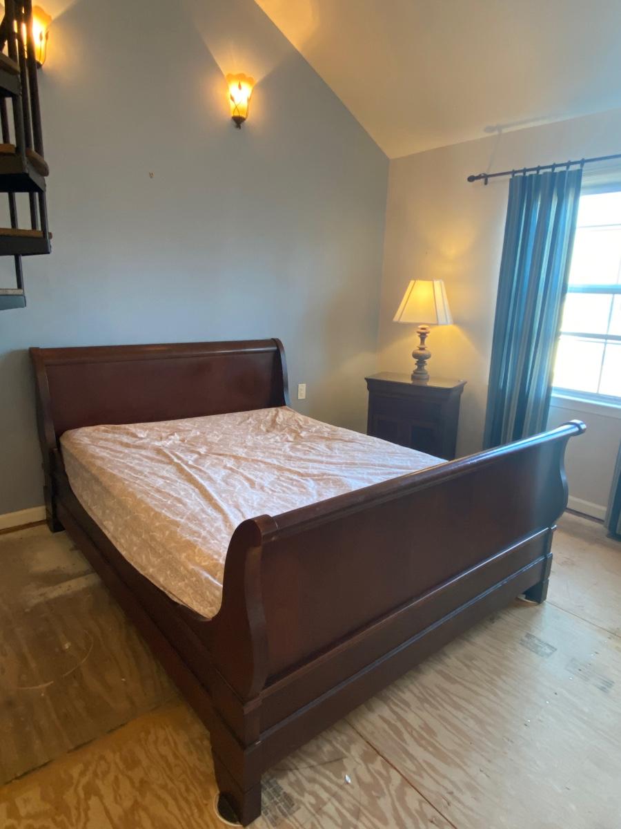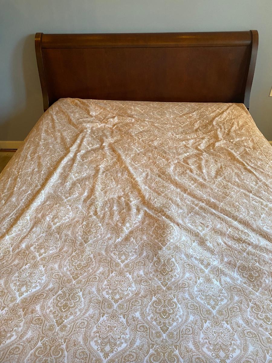 Queen Bed is in good-fair condition. Please notice chip in wood as pictured.