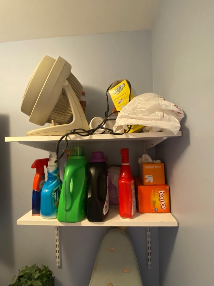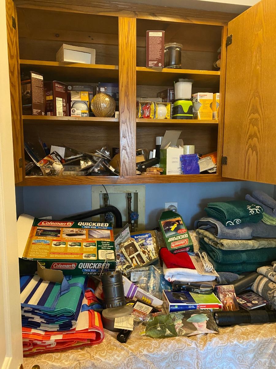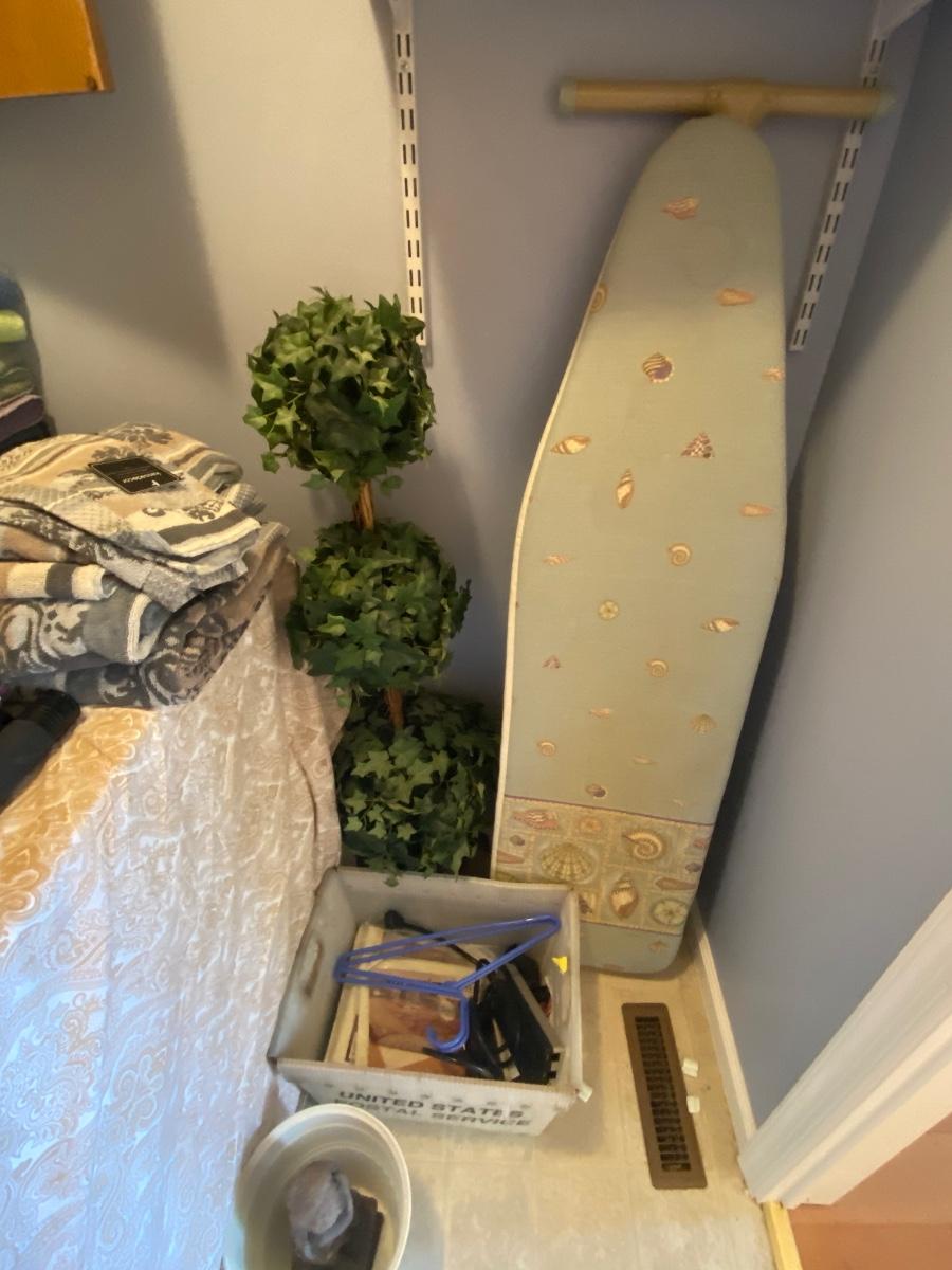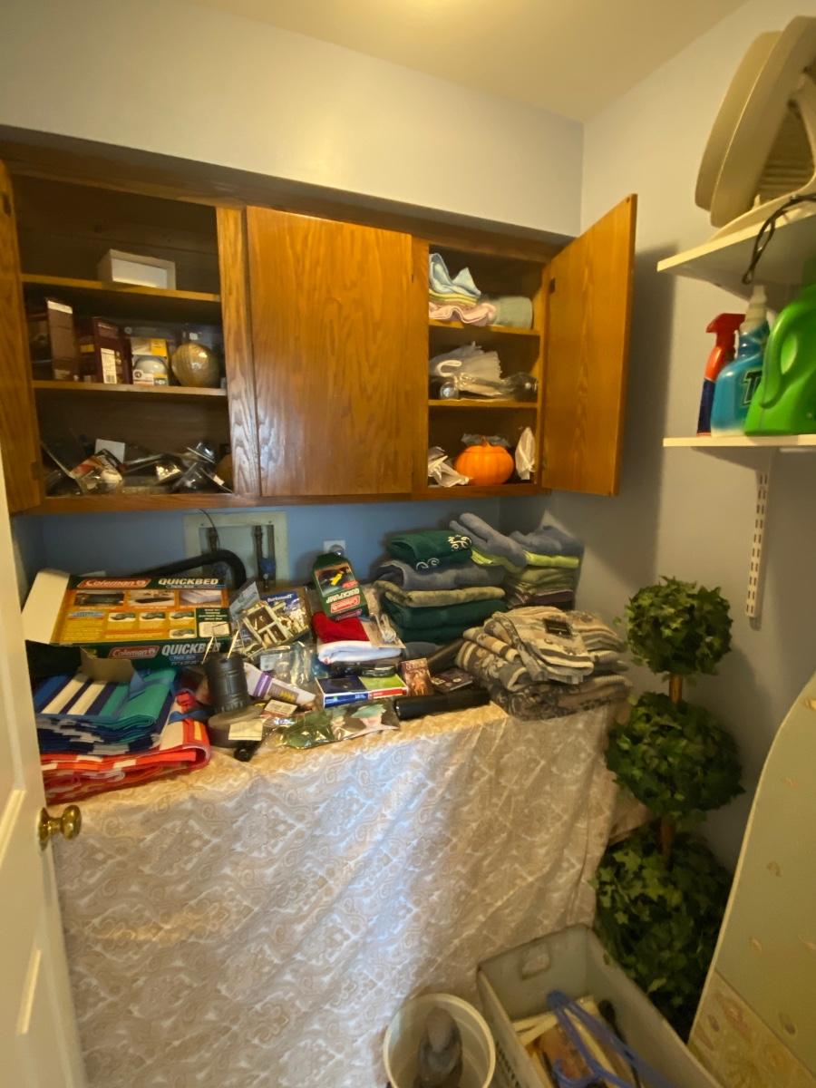 Everything you see in this laundry room. Odds and ends, light bulbs, cleaning supplies, ironing board and much more. Wash & Dryer are NOT included. Please see all pictures as they are the best representation of the items. The pictures show condition, measurements if taken, and what is included in the lot. Due to the large amount that we photograph and the time frame, we are not always able to take measurements. All items unless noted, are pre-owned and have been used. If you purchased furniture, you must bring help. We do not allow one person to carry large furniture out on their own. Bring help, tools and a truck for the safety of our client’s homes, and your personal safety. Any damages that result to the property including walls, and floors due to moving of the furniture will be charged to the buyer. Company policy. Thank you.