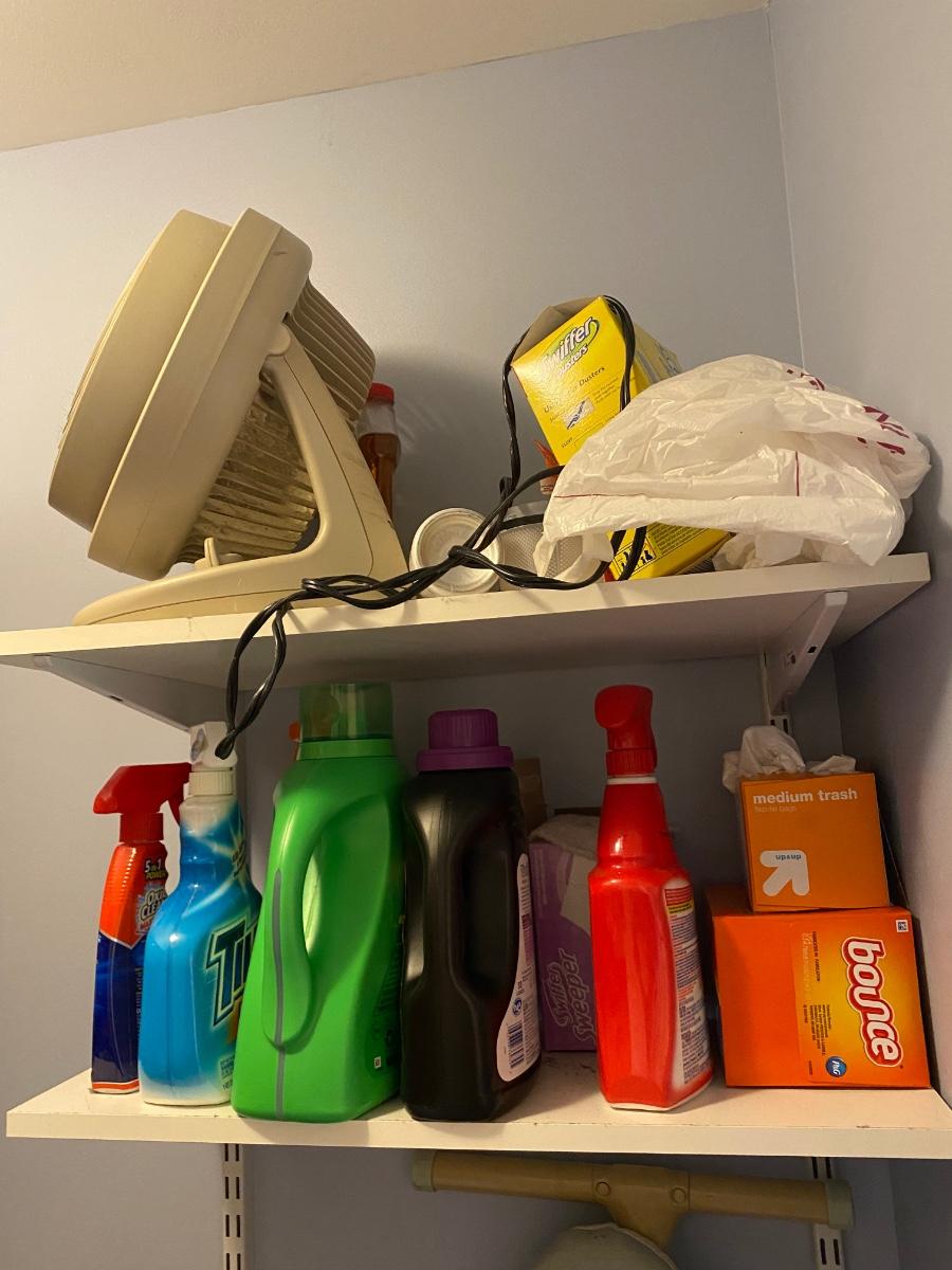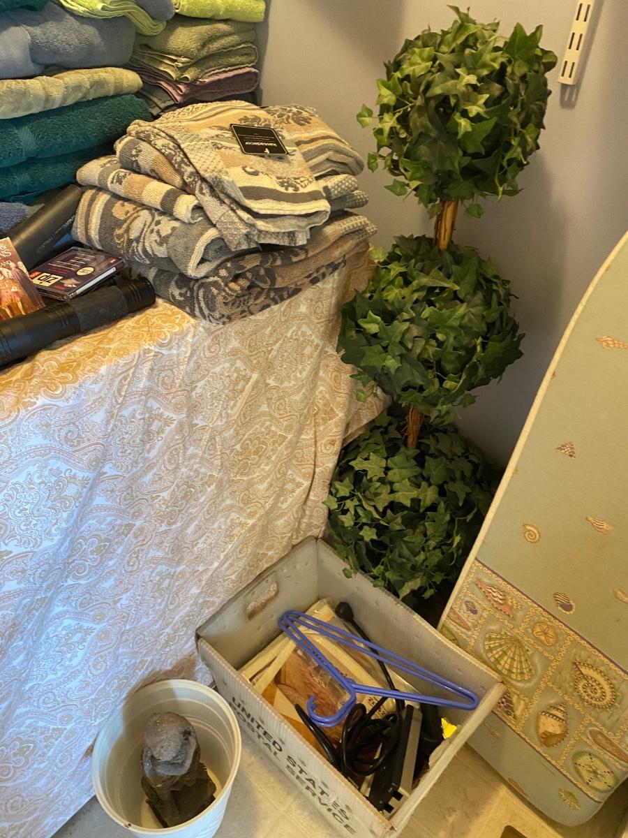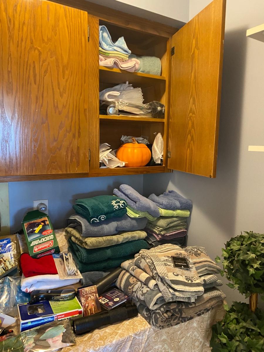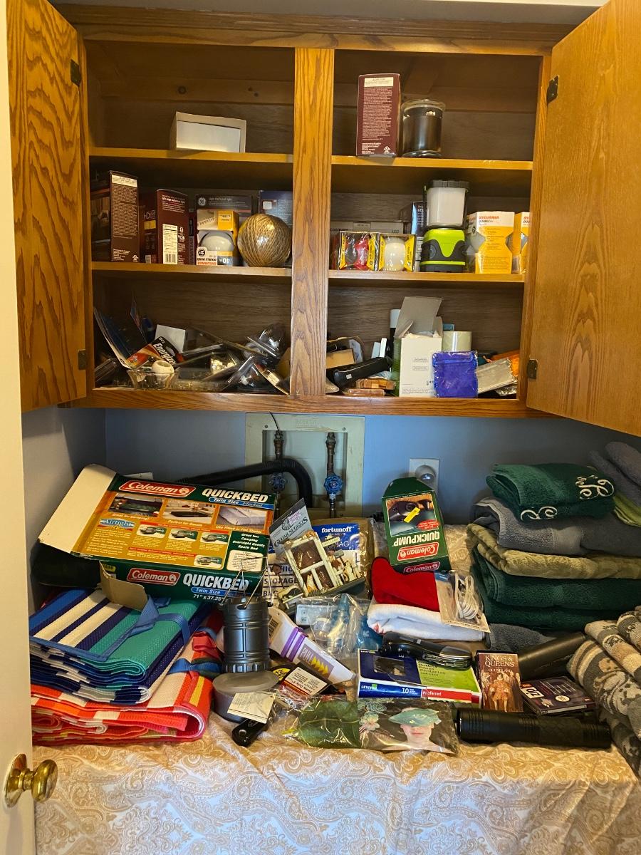 Everything you see in this laundry room. Odds and ends, light bulbs, cleaning supplies, ironing board and much more. Wash & Dryer are NOT included. Please see all pictures as they are the best representation of the items. The pictures show condition, measurements if taken, and what is included in the lot. Due to the large amount that we photograph and the time frame, we are not always able to take measurements. All items unless noted, are pre-owned and have been used. If you purchased furniture, you must bring help. We do not allow one person to carry large furniture out on their own. Bring help, tools and a truck for the safety of our client’s homes, and your personal safety. Any damages that result to the property including walls, and floors due to moving of the furniture will be charged to the buyer. Company policy. Thank you.