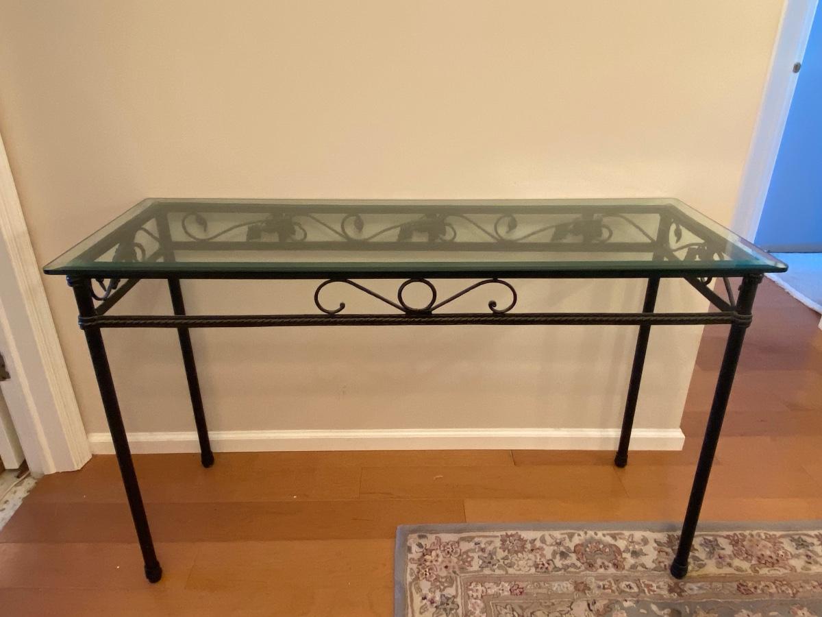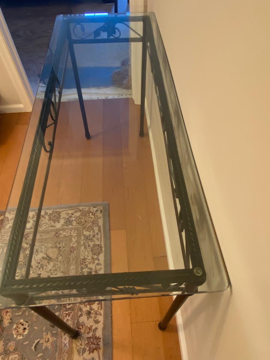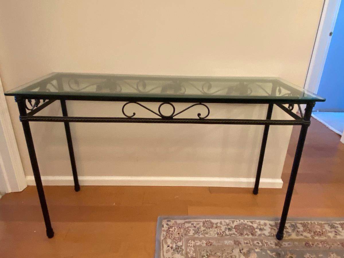 49”x 18”x 30” Glass Top with metal frame table. Please see all pictures as they are the best representation of the items. The pictures show condition, measurements if taken, and what is included in the lot. Due to the large amount that we photograph and the time frame, we are not always able to take measurements. All items unless noted, are pre-owned and have been used. If you purchased furniture, you must bring help. We do not allow one person to carry large furniture out on their own. Bring help, tools and a truck for the safety of our client’s homes, and your personal safety. Any damages that result to the property including walls, and floors due to moving of the furniture will be charged to the buyer. Company policy. Thank you.