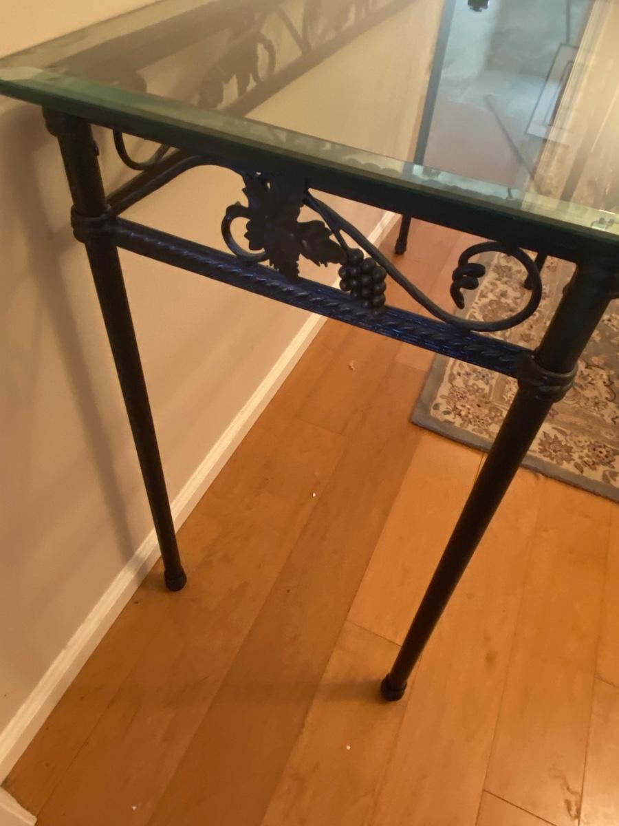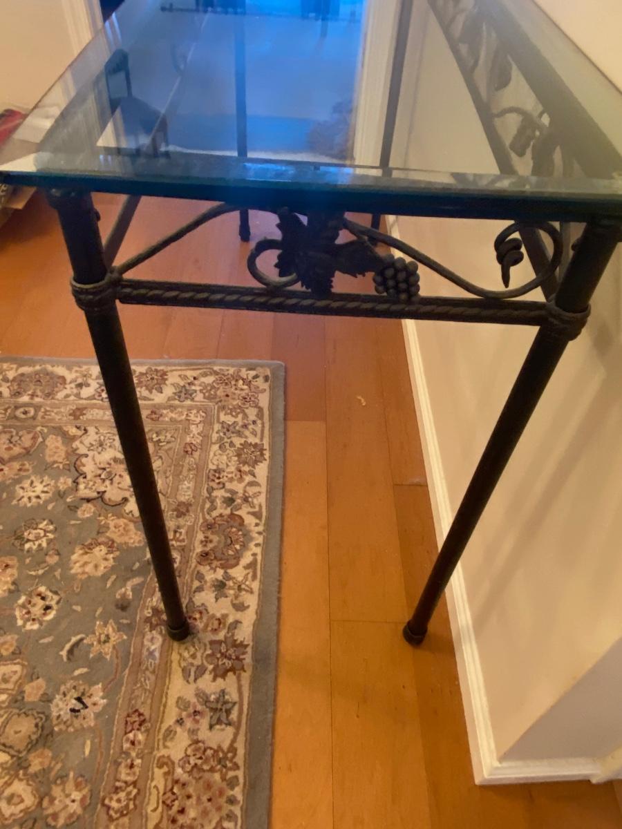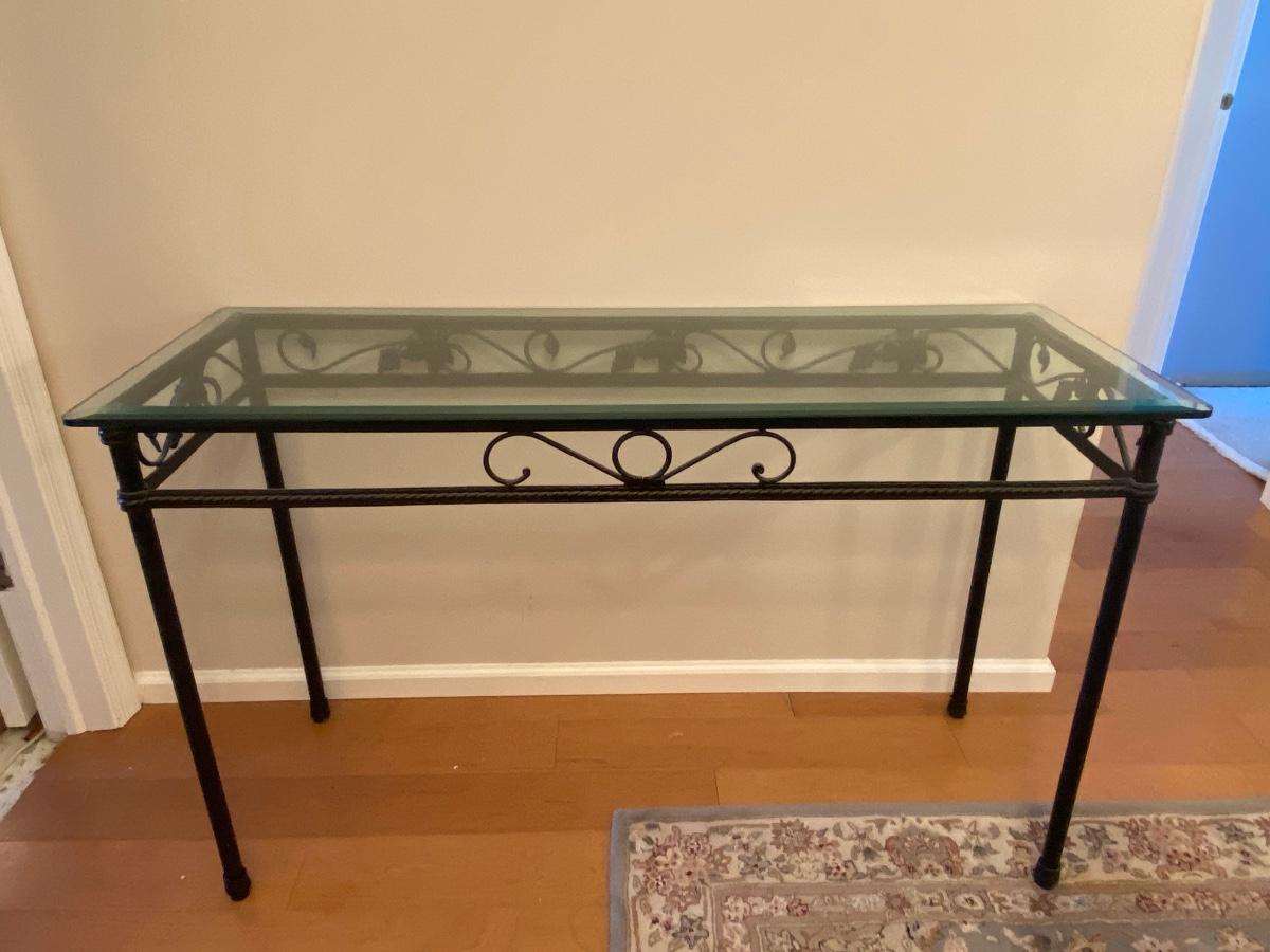 49”x 18”x 30” Glass Top with metal frame table. Please see all pictures as they are the best representation of the items. The pictures show condition, measurements if taken, and what is included in the lot. Due to the large amount that we photograph and the time frame, we are not always able to take measurements. All items unless noted, are pre-owned and have been used. If you purchased furniture, you must bring help. We do not allow one person to carry large furniture out on their own. Bring help, tools and a truck for the safety of our client’s homes, and your personal safety. Any damages that result to the property including walls, and floors due to moving of the furniture will be charged to the buyer. Company policy. Thank you.