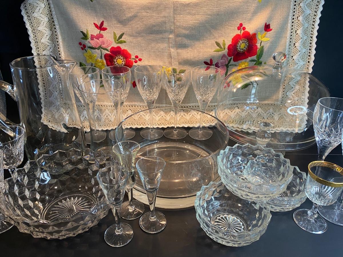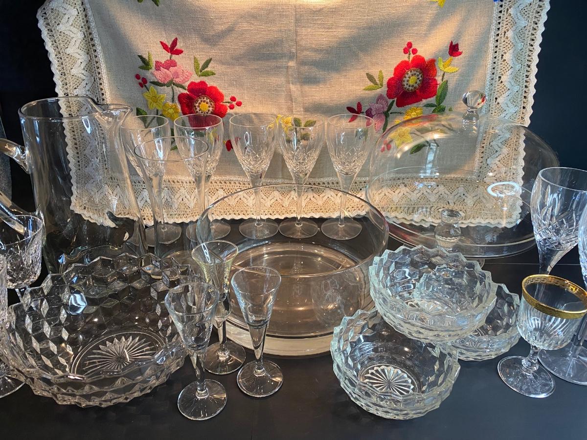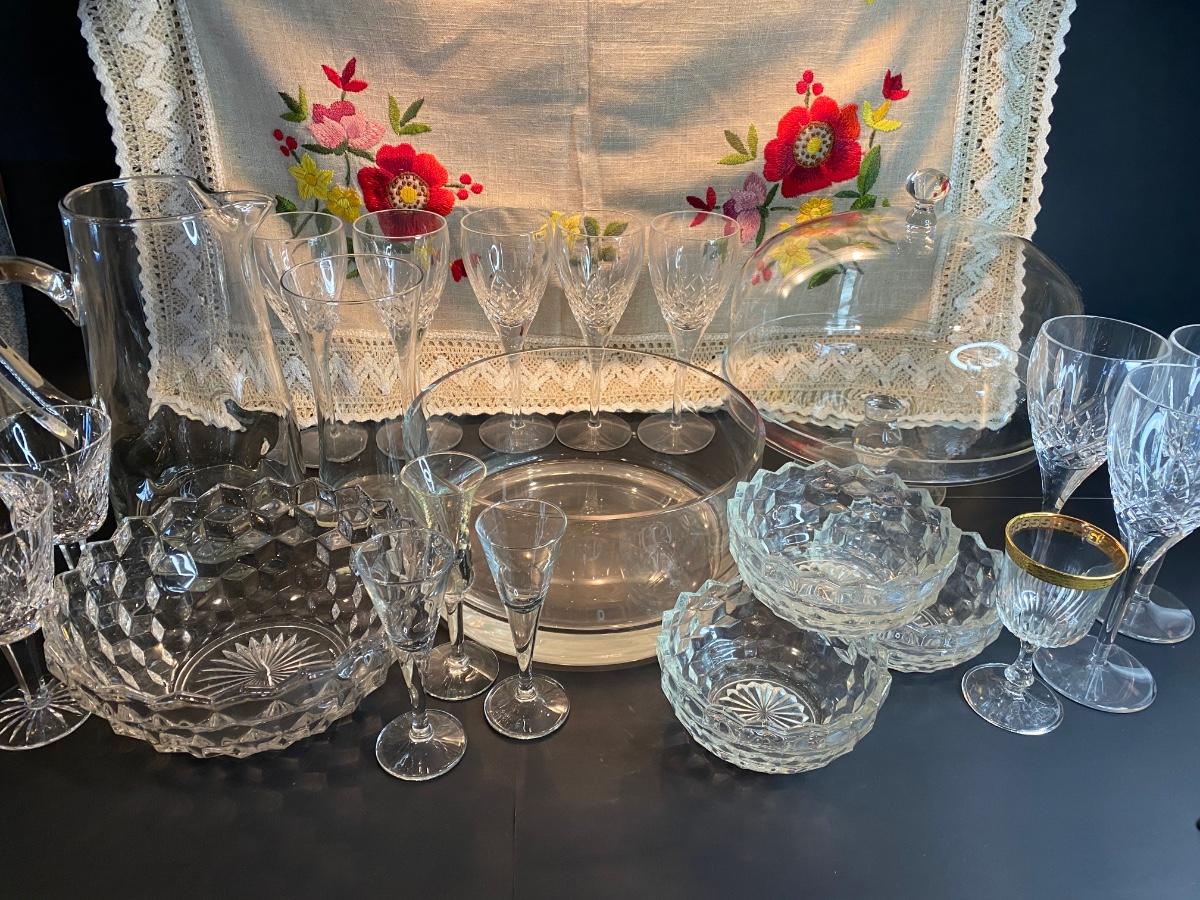 8 Waterford Glasses, Glass pedestal cake dish, glass salad bowl, embroidered doily and more. Please see all pictures as they are the best representation of the items. The pictures show condition, measurements if taken, and what is included in the lot. Due to the large amount that we photograph and the time frame, we are not always able to take measurements. All items unless noted, are pre-owned and have been used. If you purchased furniture, you must bring help. We do not allow one person to carry large furniture out on their own. Bring help, tools and a truck for the safety of our client’s homes, and your personal safety. Any damages that result to the property including walls, and floors due to moving of the furniture will be charged to the buyer. Company policy. Thank you.