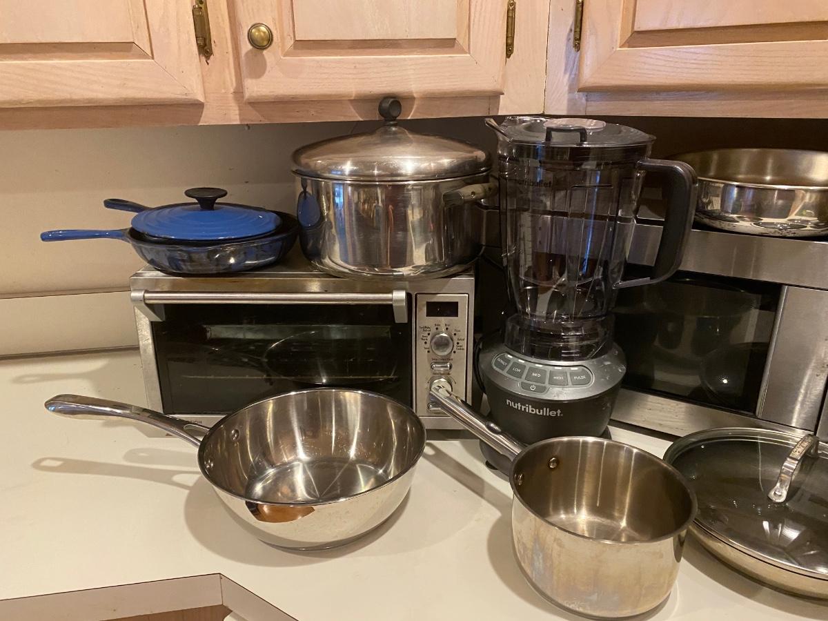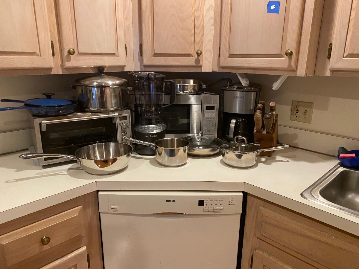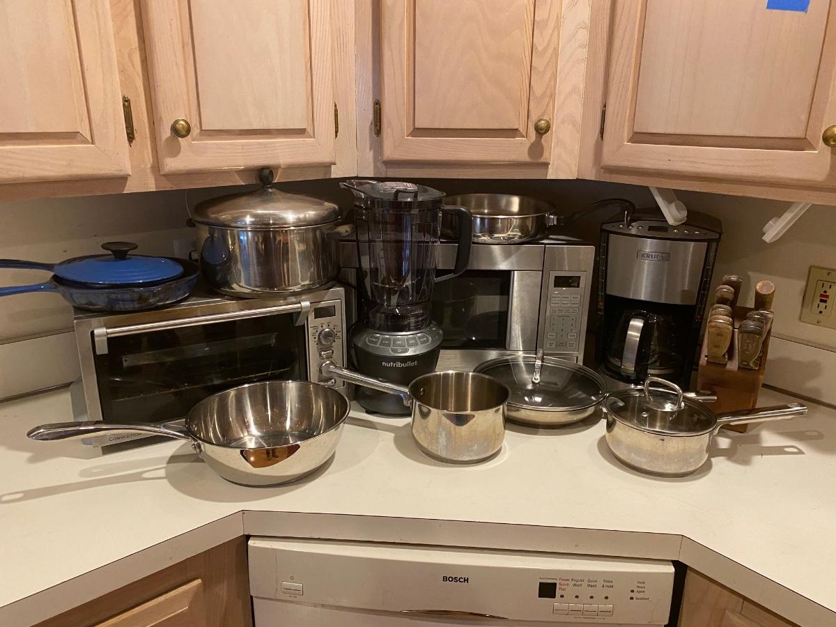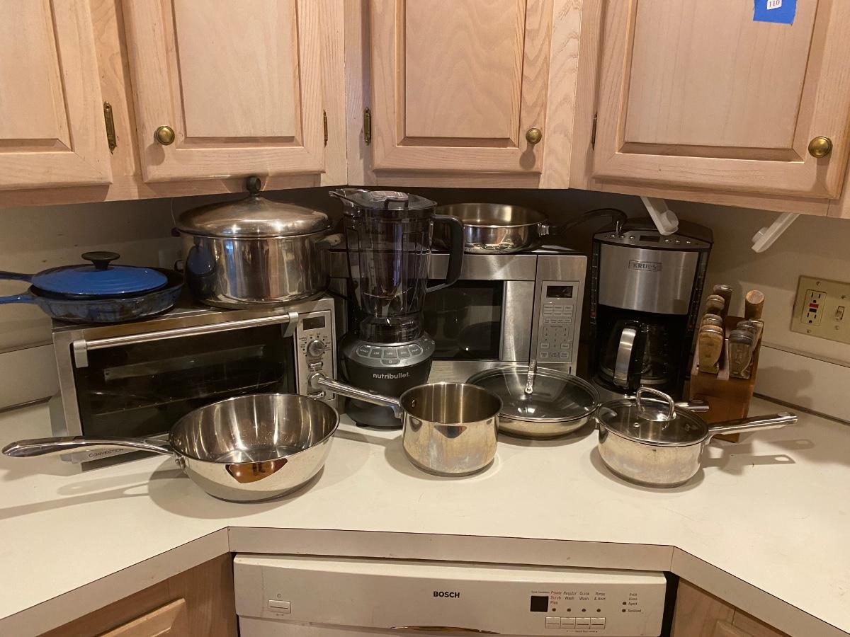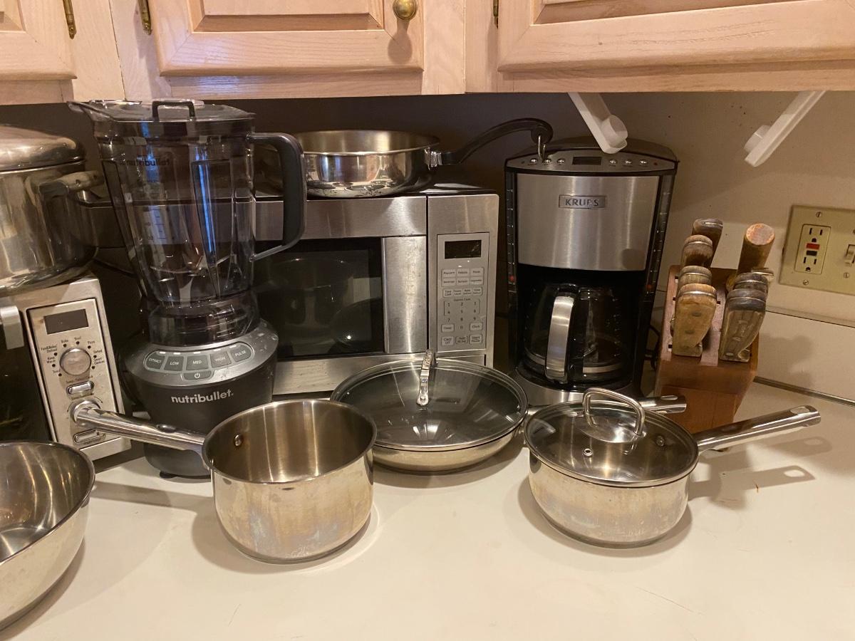 This lot is full! Microwave, Bullet, coffee maker, cast iron pans and much more. Items in this lot are in used working condition. Please see all pictures as they are the best representation of the items. The pictures show condition, measurements if taken, and what is included in the lot. Due to the large amount that we photograph and the time frame, we are not always able to take measurements. All items unless noted, are pre-owned and have been used. If you purchased furniture, you must bring help. We do not allow one person to carry large furniture out on their own. Bring help, tools and a truck for the safety of our client’s homes, and your personal safety. Any damages that result to the property including walls, and floors due to moving of the furniture will be charged to the buyer. Company policy. Thank you.