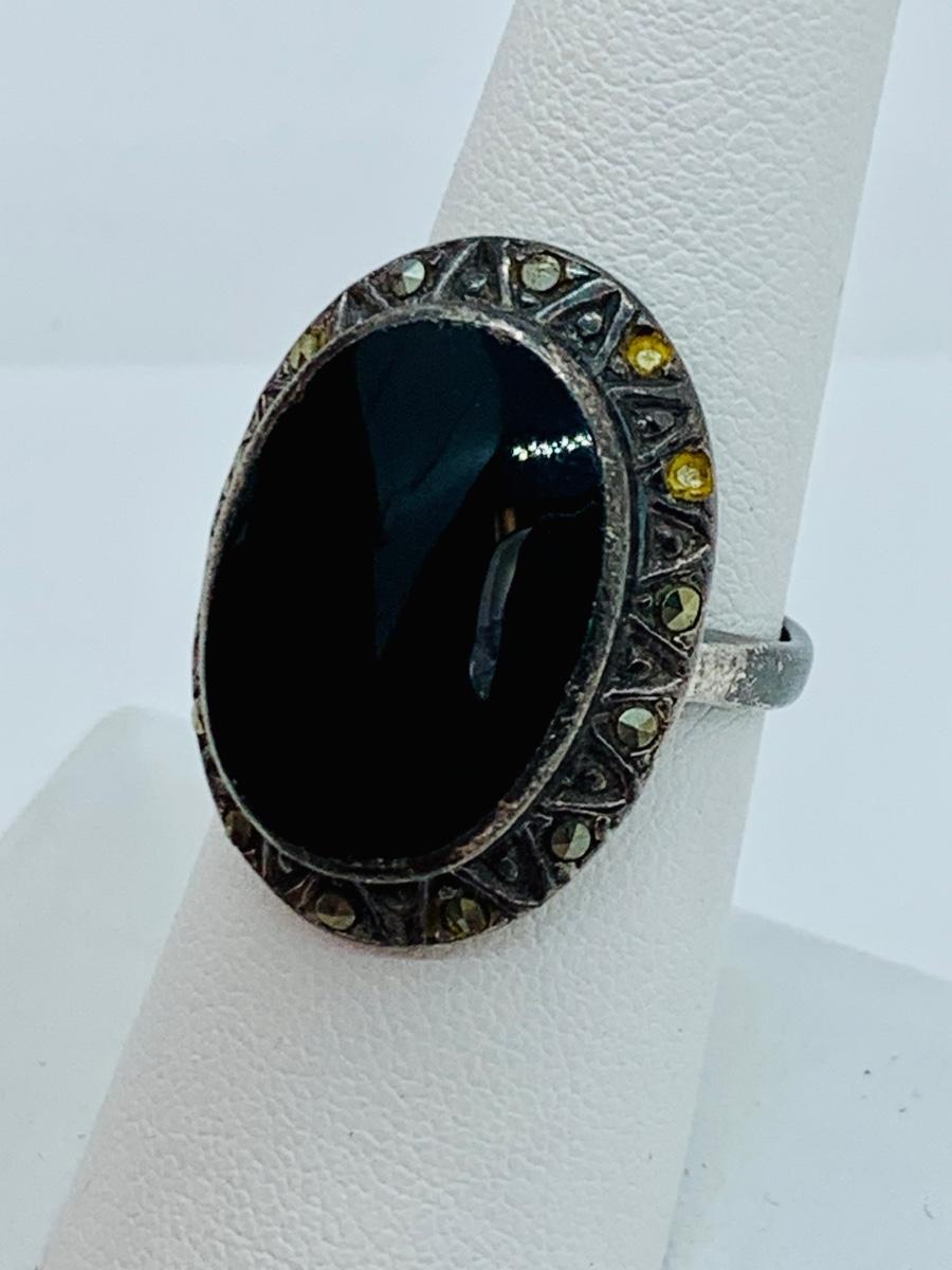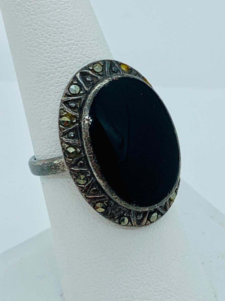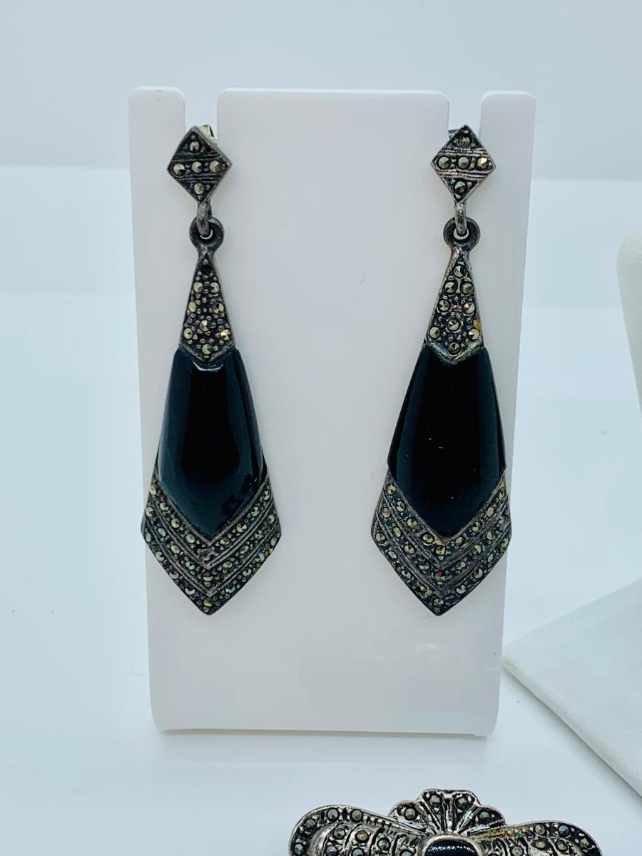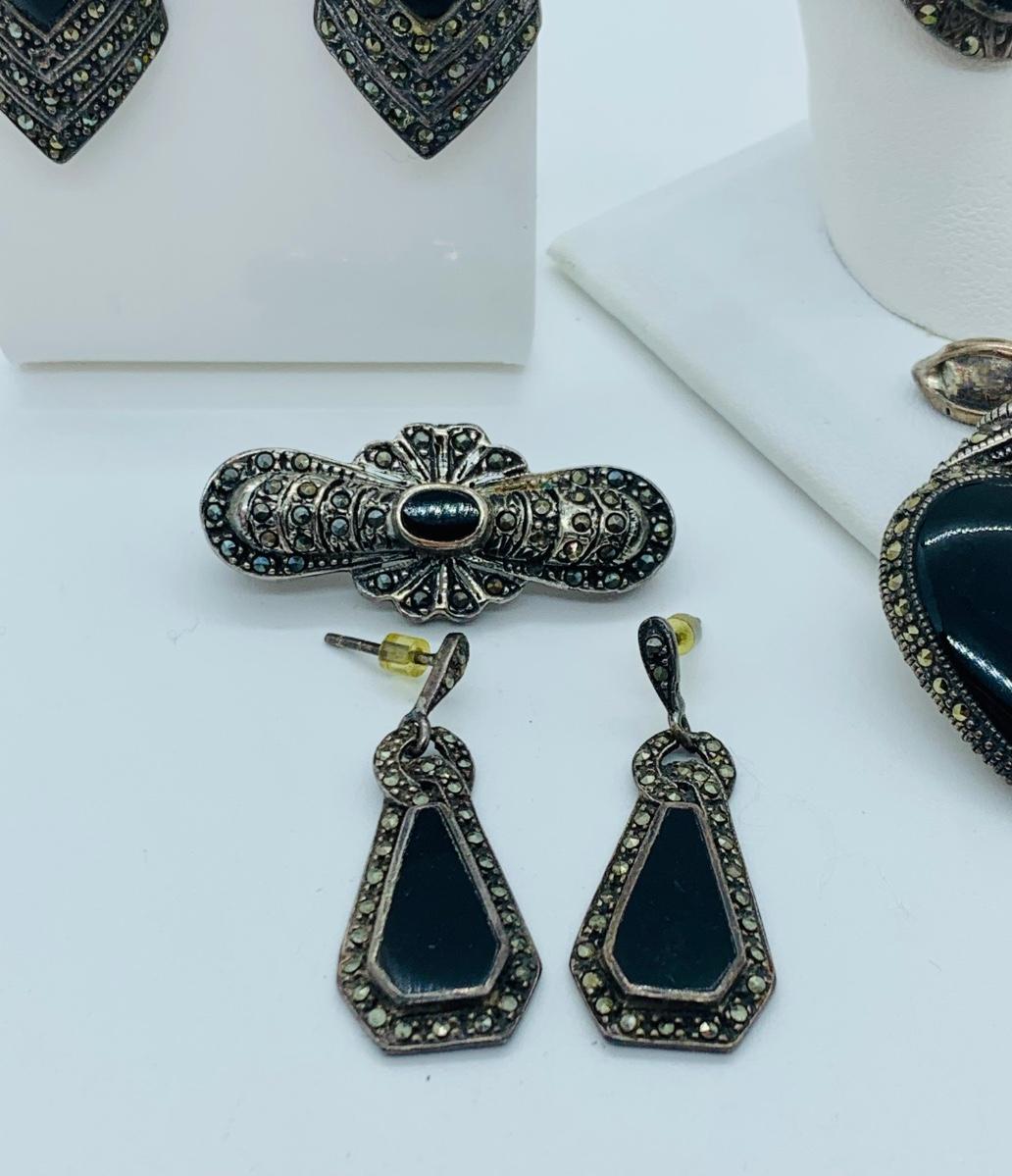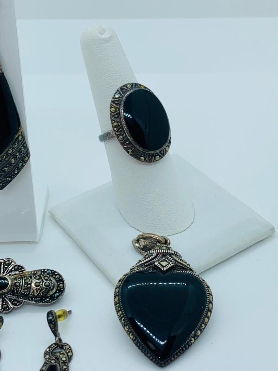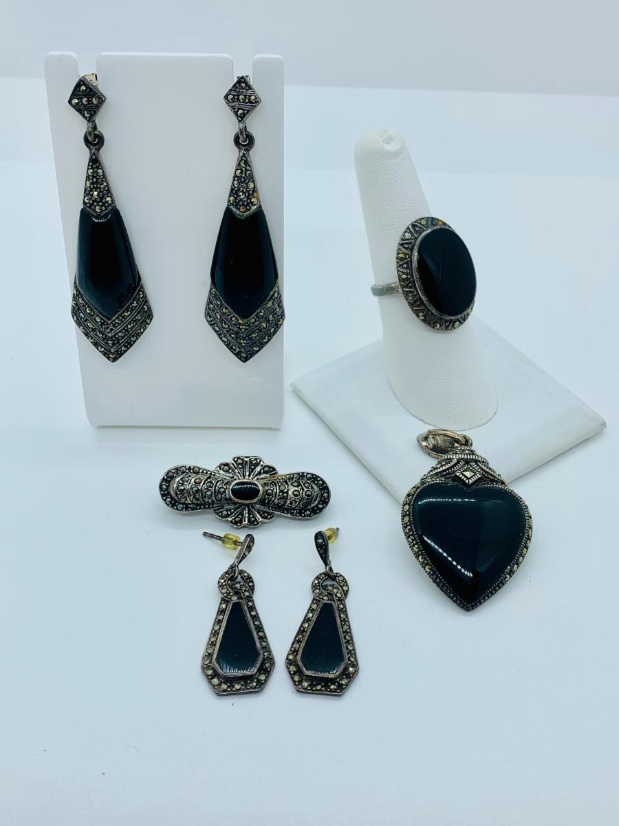 LOT 192J: Black Onyx and Marcasite Collection: Earrings,Pin, Ring & Reversible Pendant
