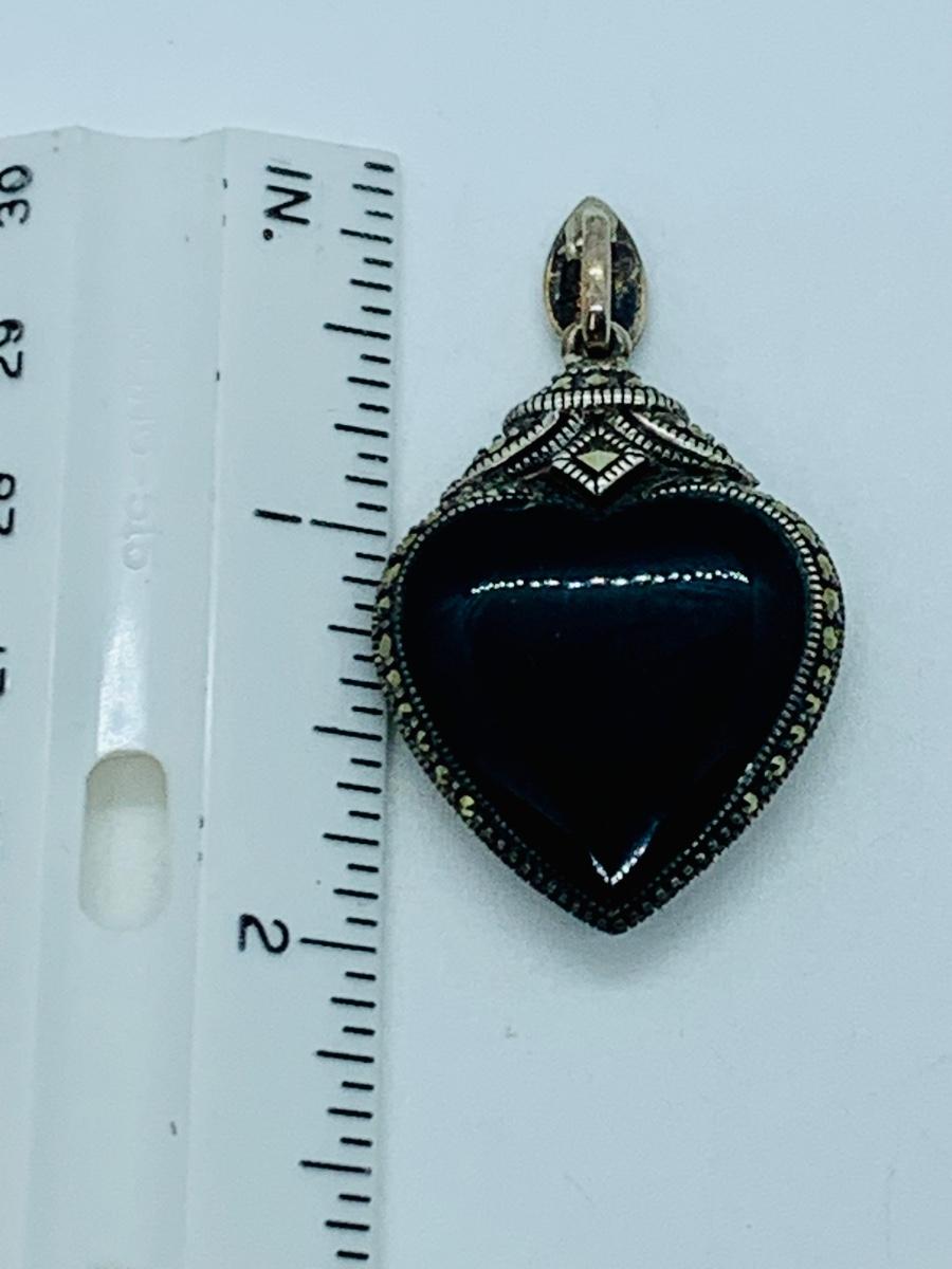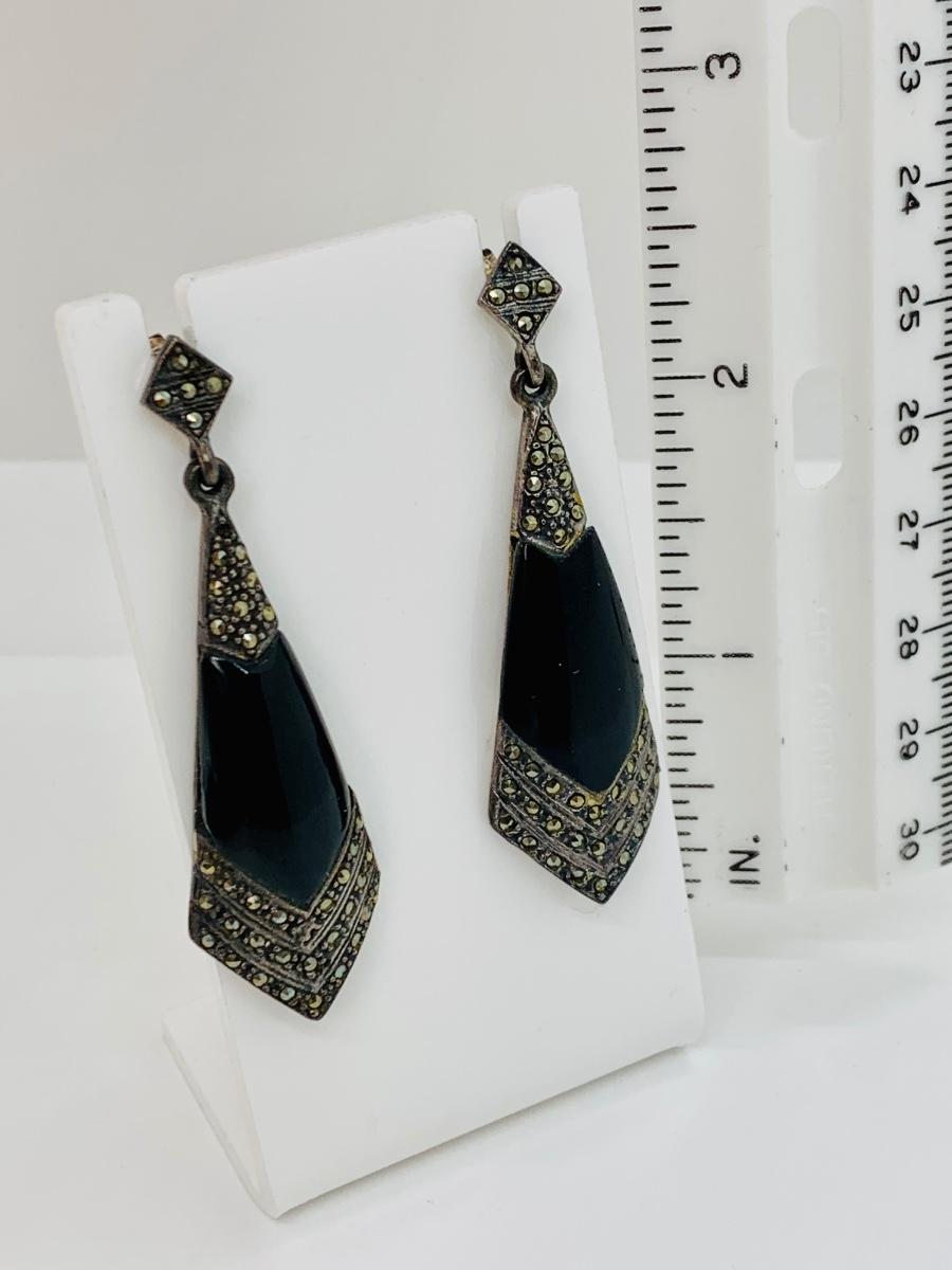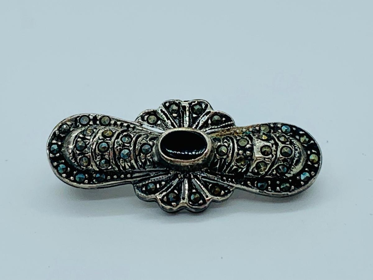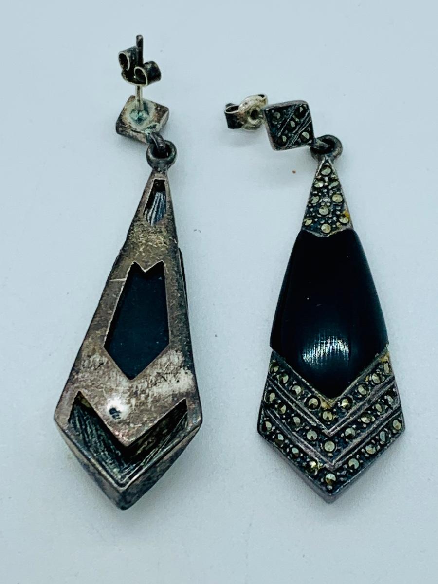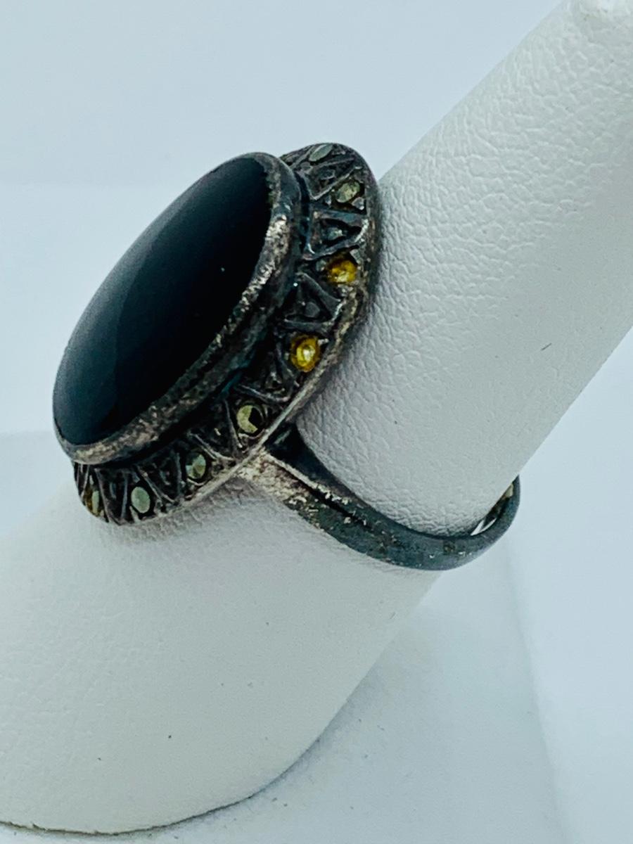 LOT 192J: Black Onyx and Marcasite Collection: Earrings,Pin, Ring & Reversible Pendant