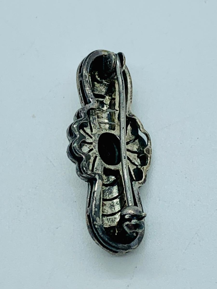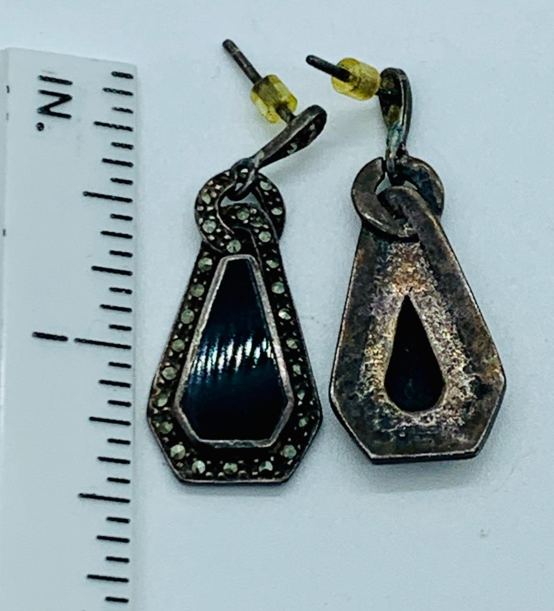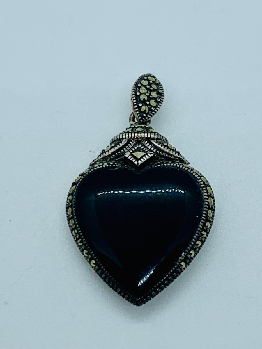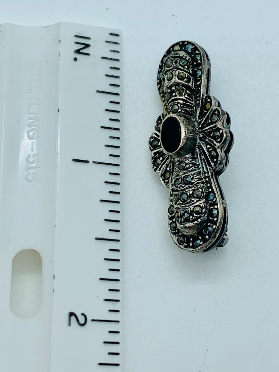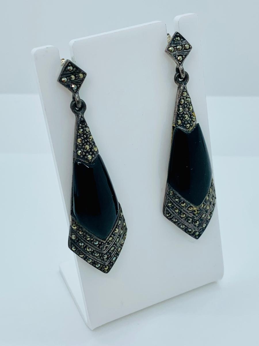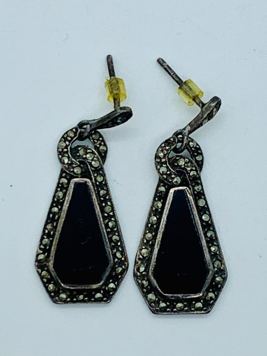 LOT 192J: Black Onyx and Marcasite Collection: Earrings,Pin, Ring & Reversible Pendant