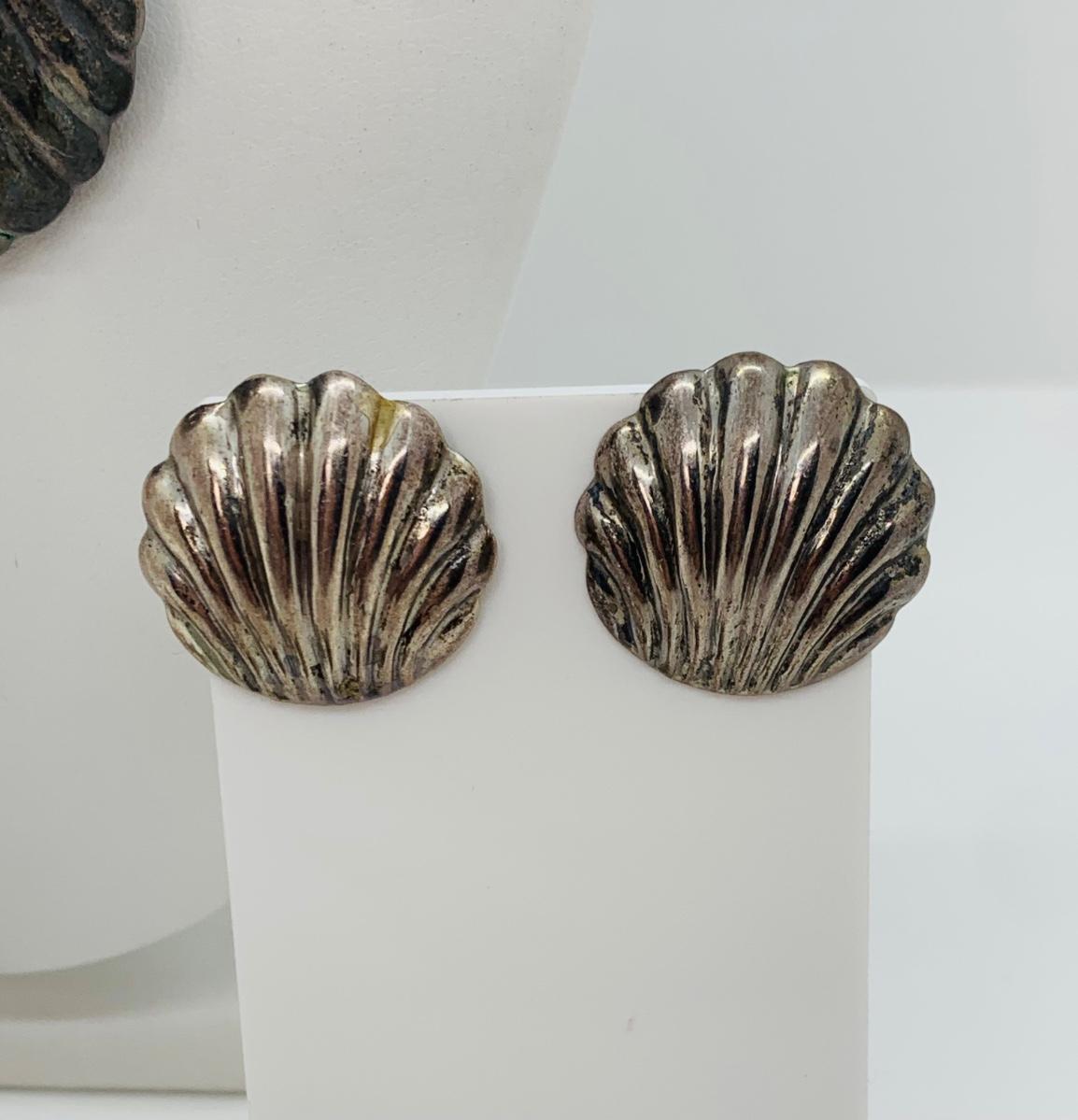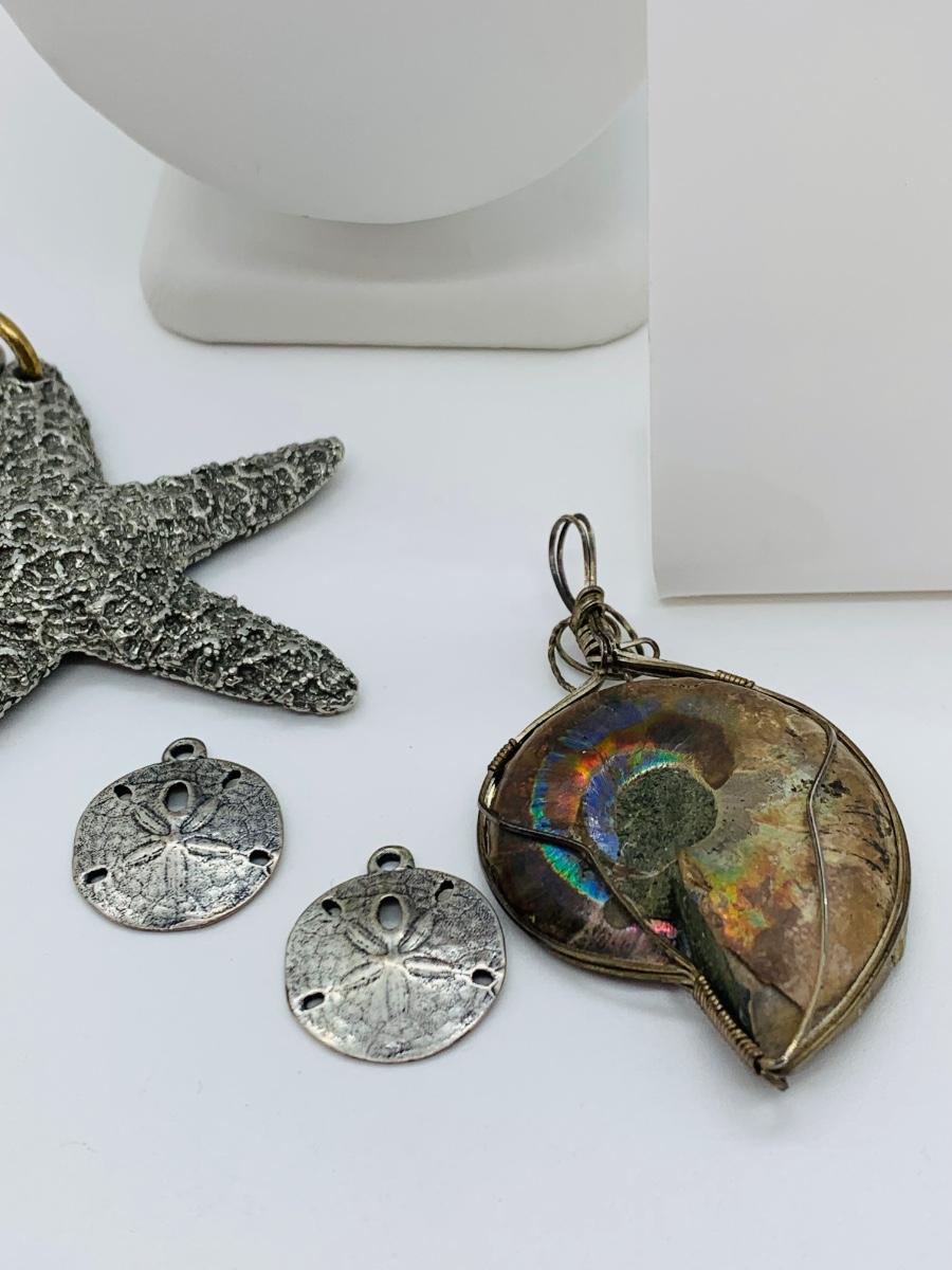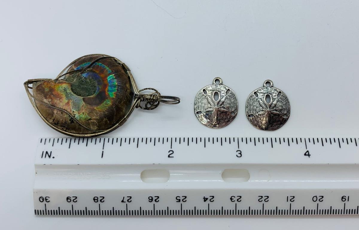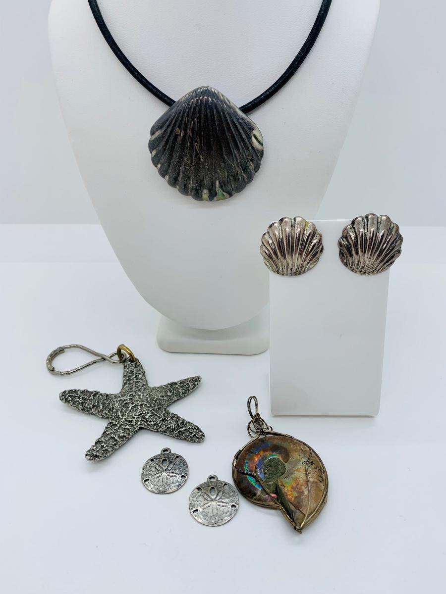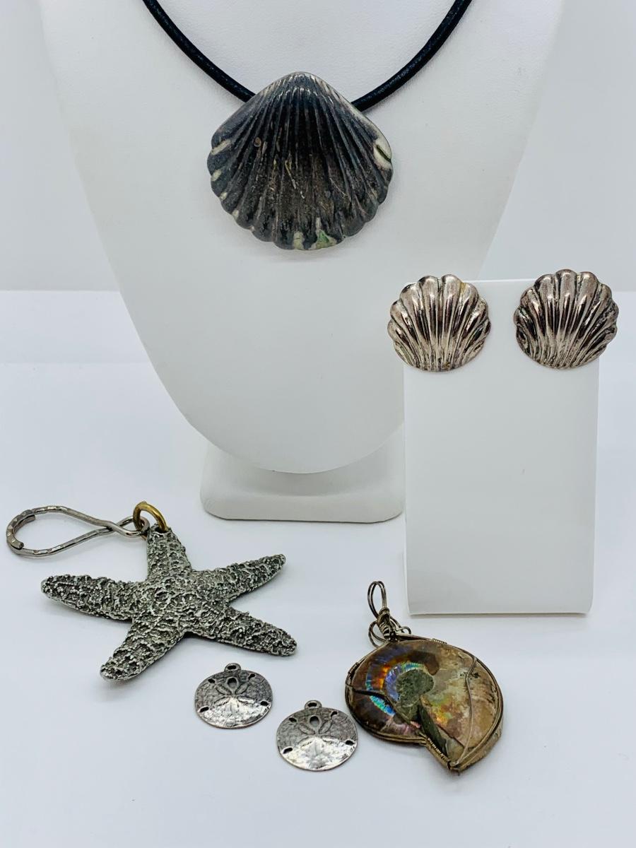 LOT 190J: Sterling Silver Earrings Sand Dollar Charms Along with Shell Choker, Shell Pendant & Star Fish