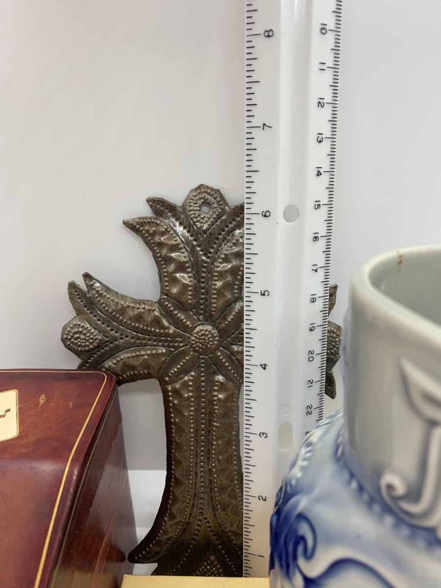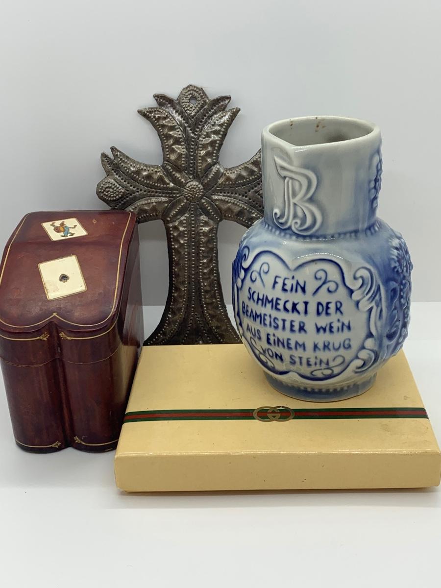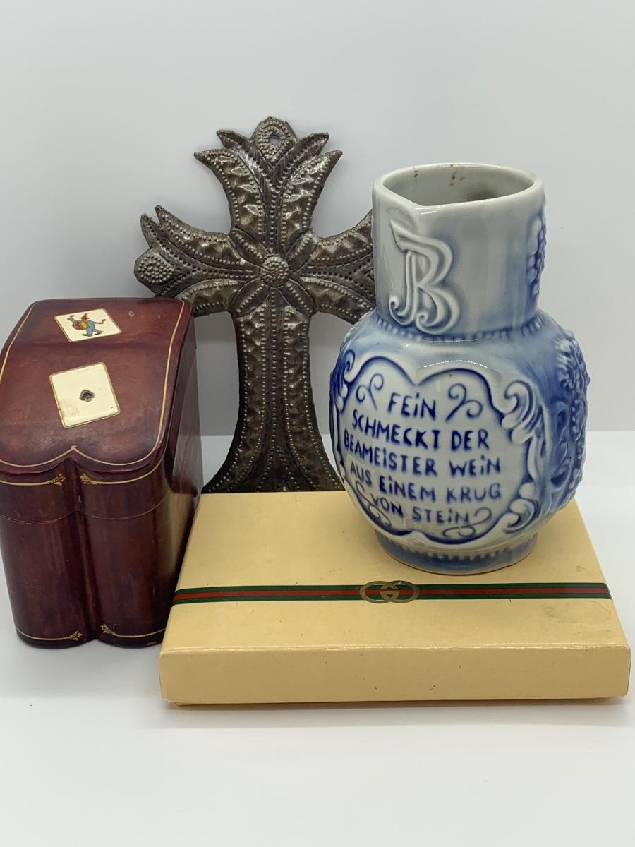 LOT 175J: Gucci Playing Cards, Leather Playing Card Case w/Cards W.Germany Salt Glaze Pitcher & Metal Cross