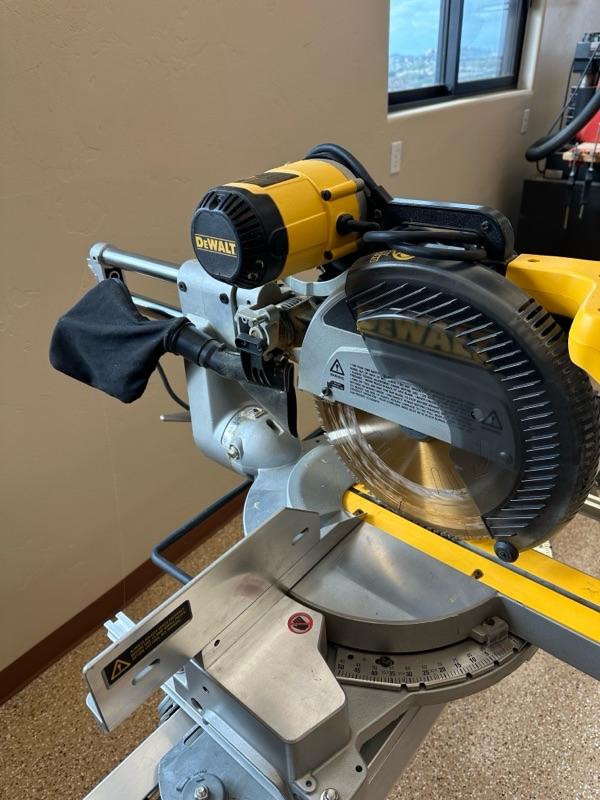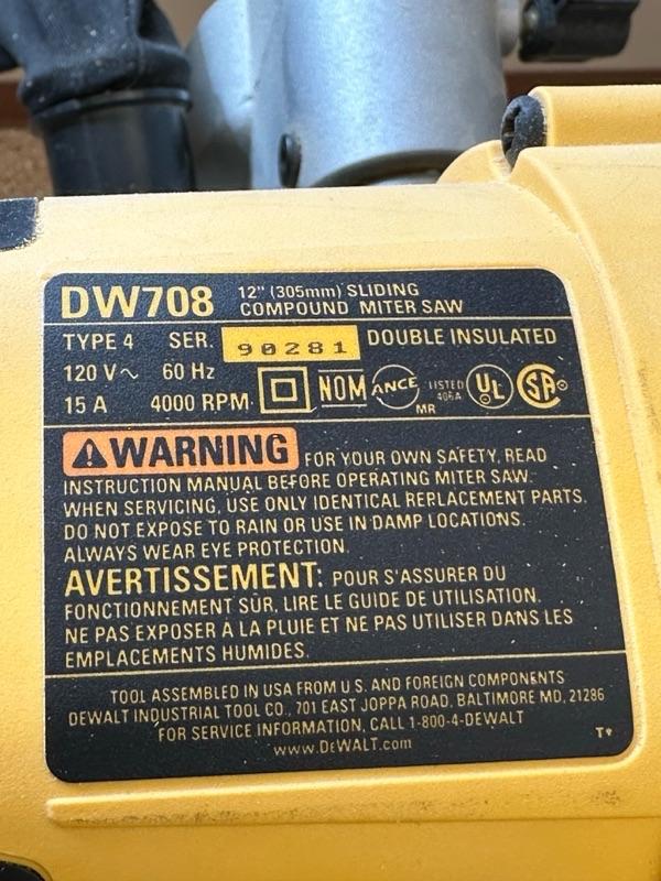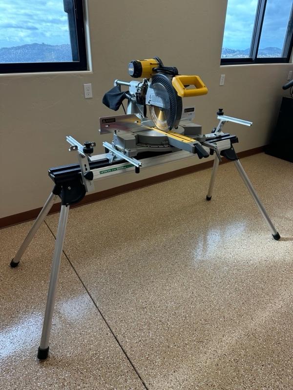 Dewalt 12 inch compound miter saw model DW708 mounted on Hitachi, universal workstation