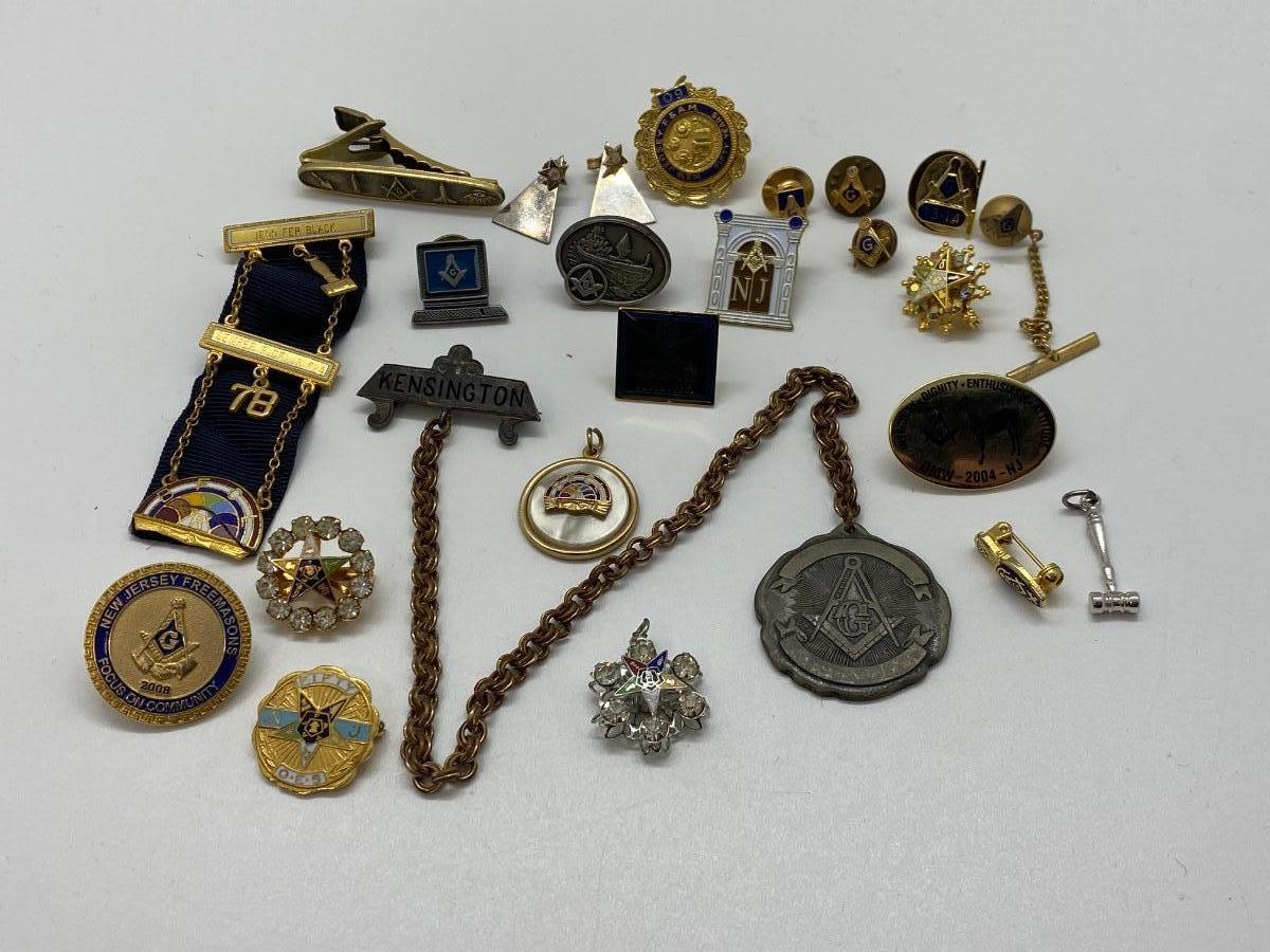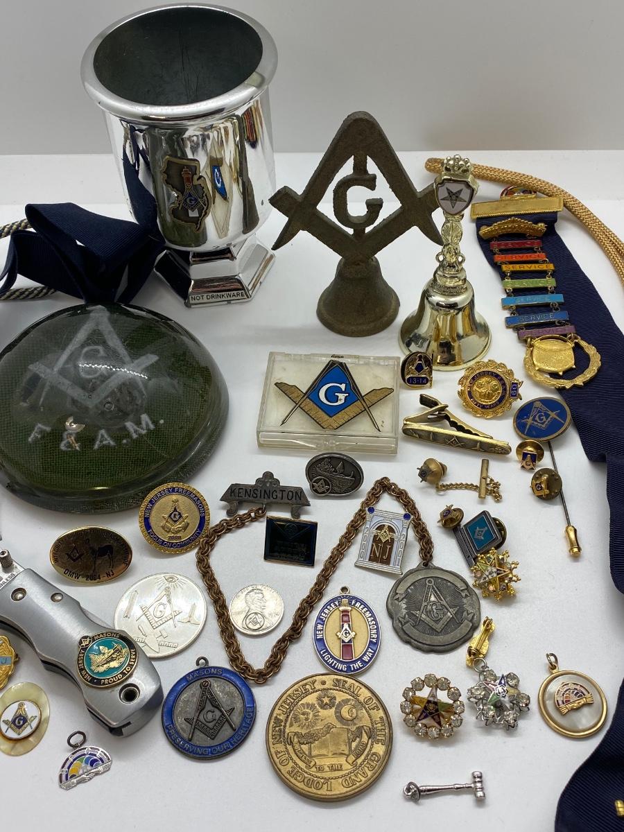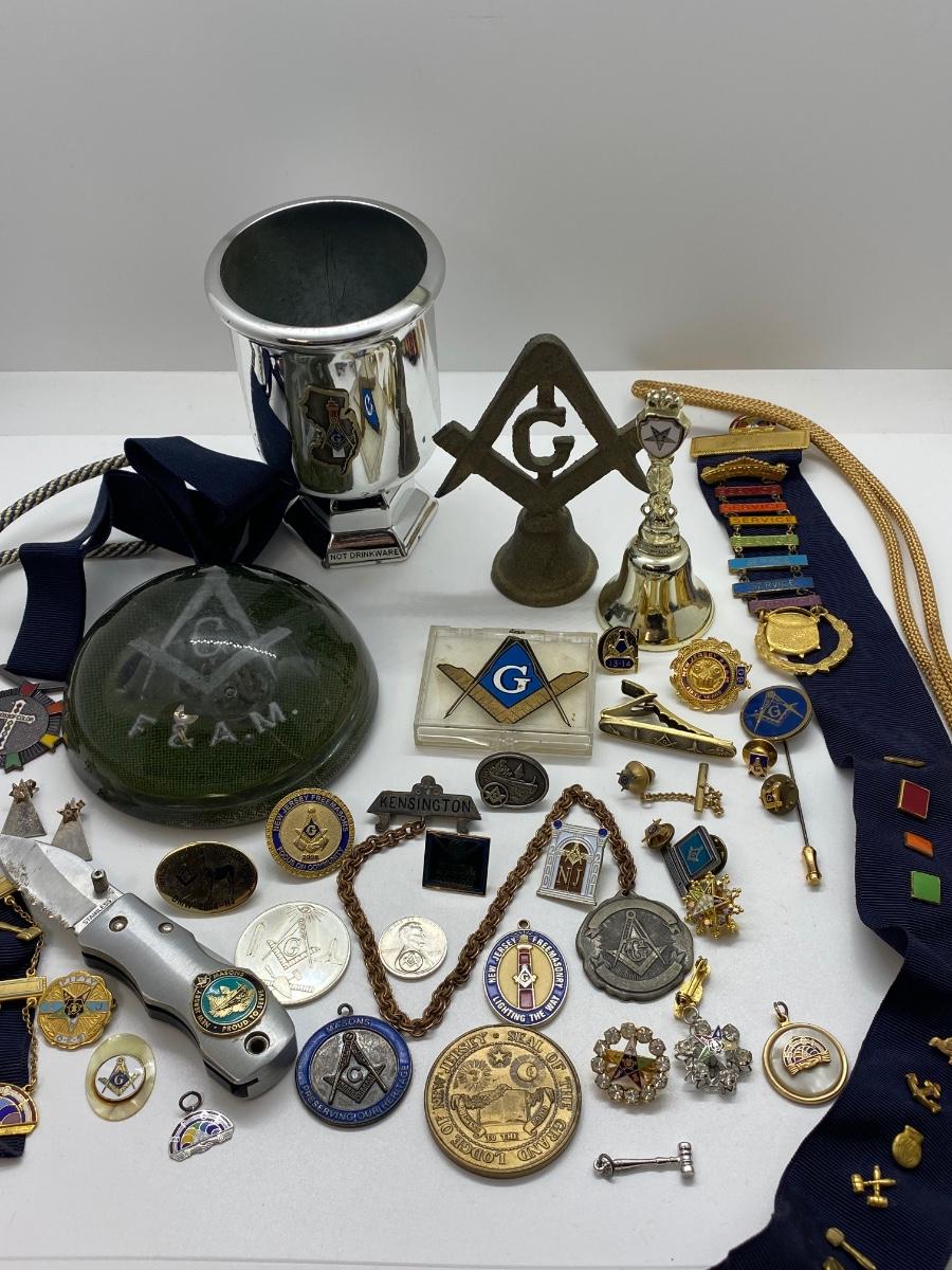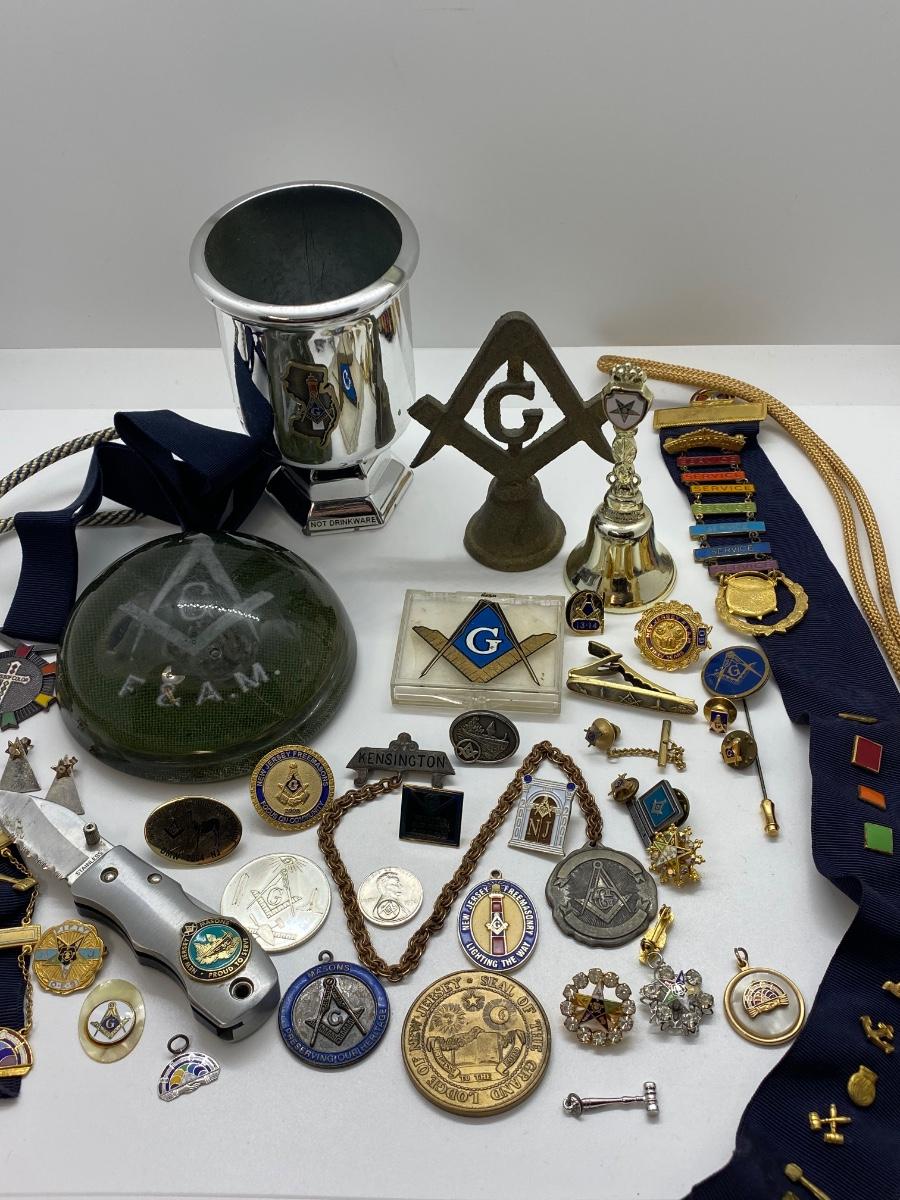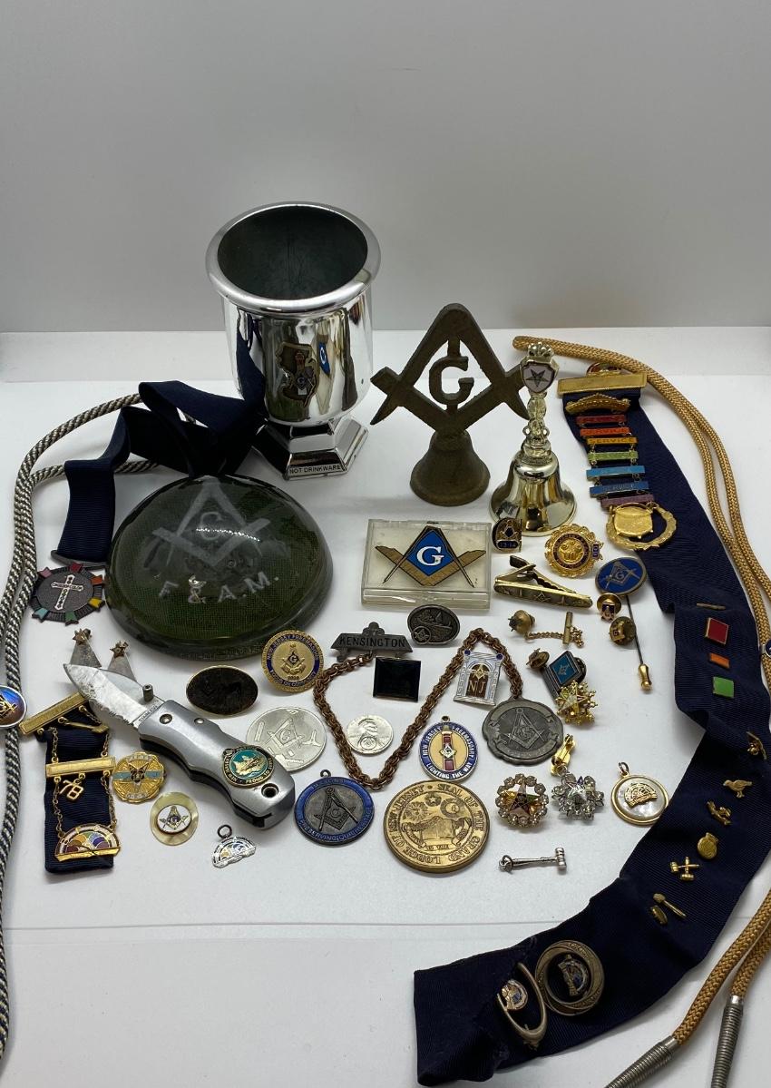 LOT 29C: Large Masonic Collection of Pins, Paperweight, Tie Tacs  and More
