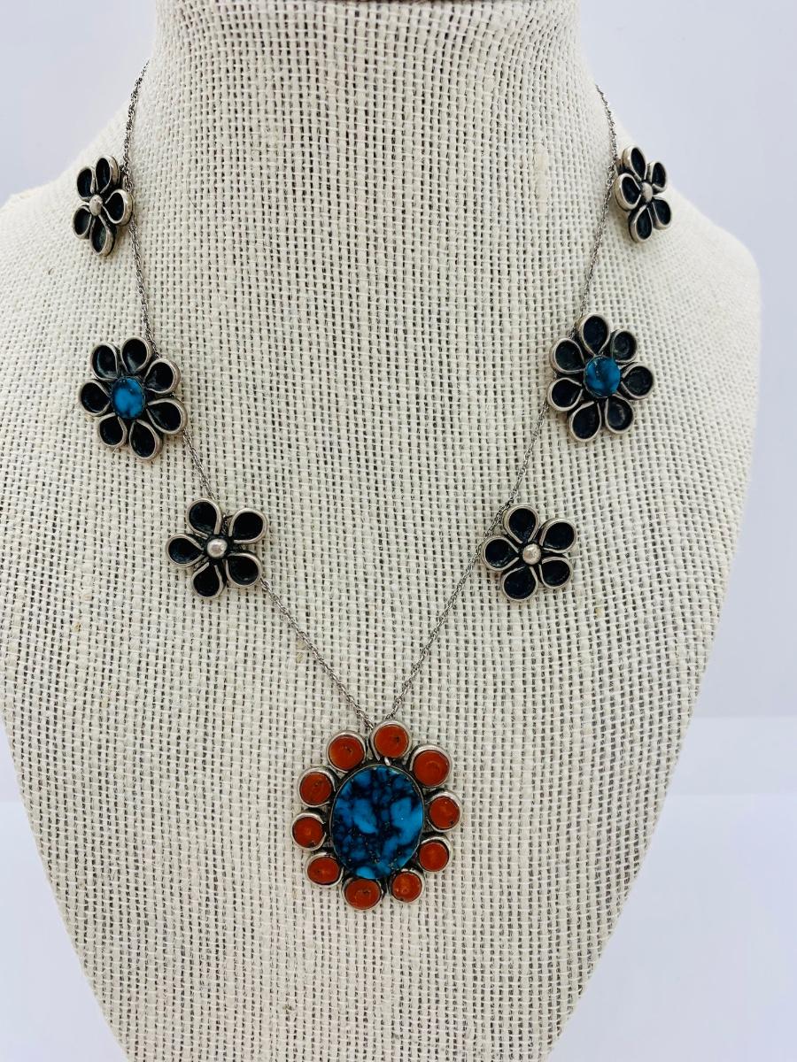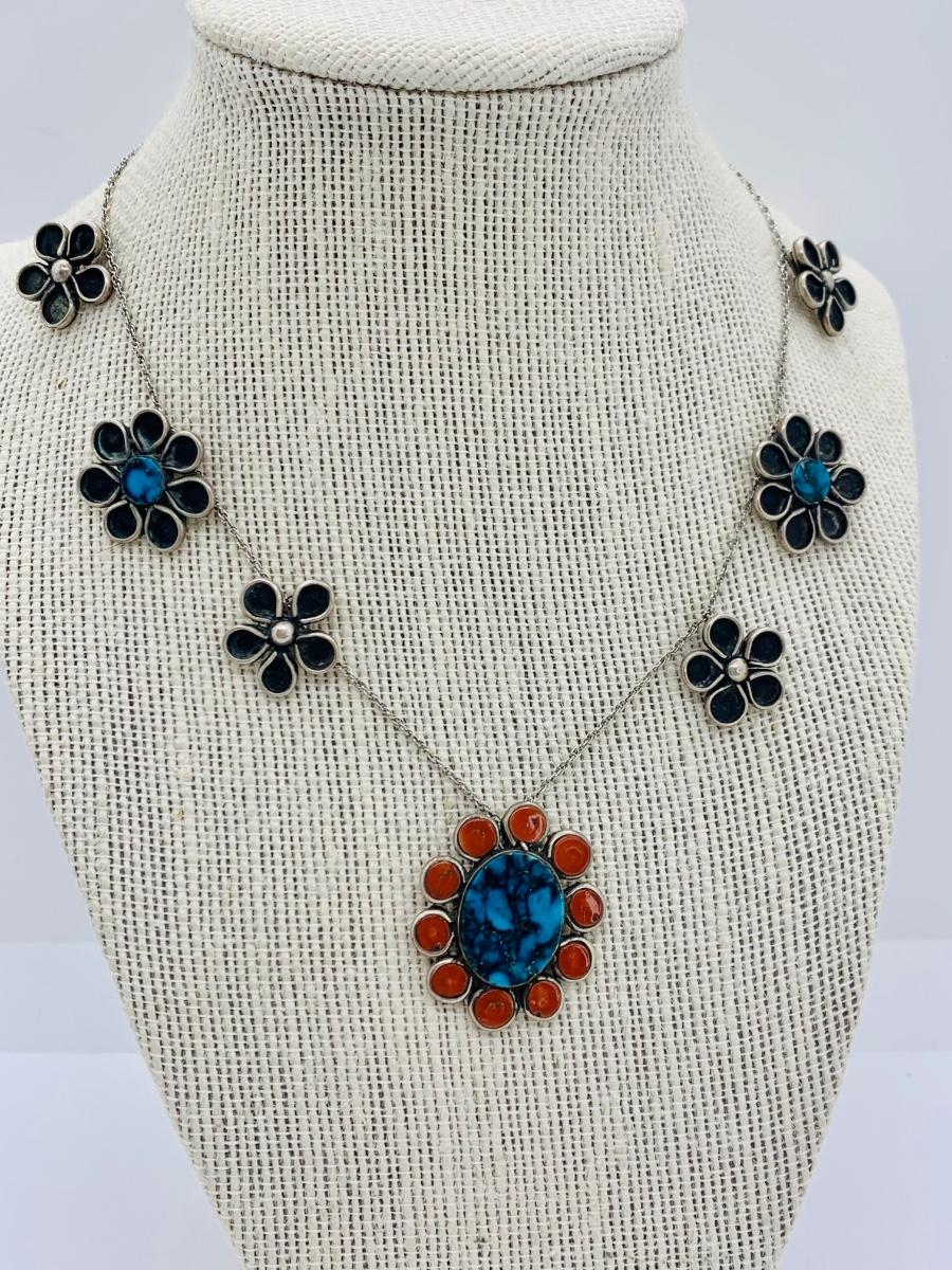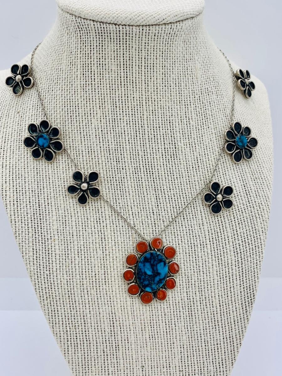 LOT 51R: Handcrafted 15" Sterling Silver Necklace w/Inlaid Turquoise & Coral, 25g TW