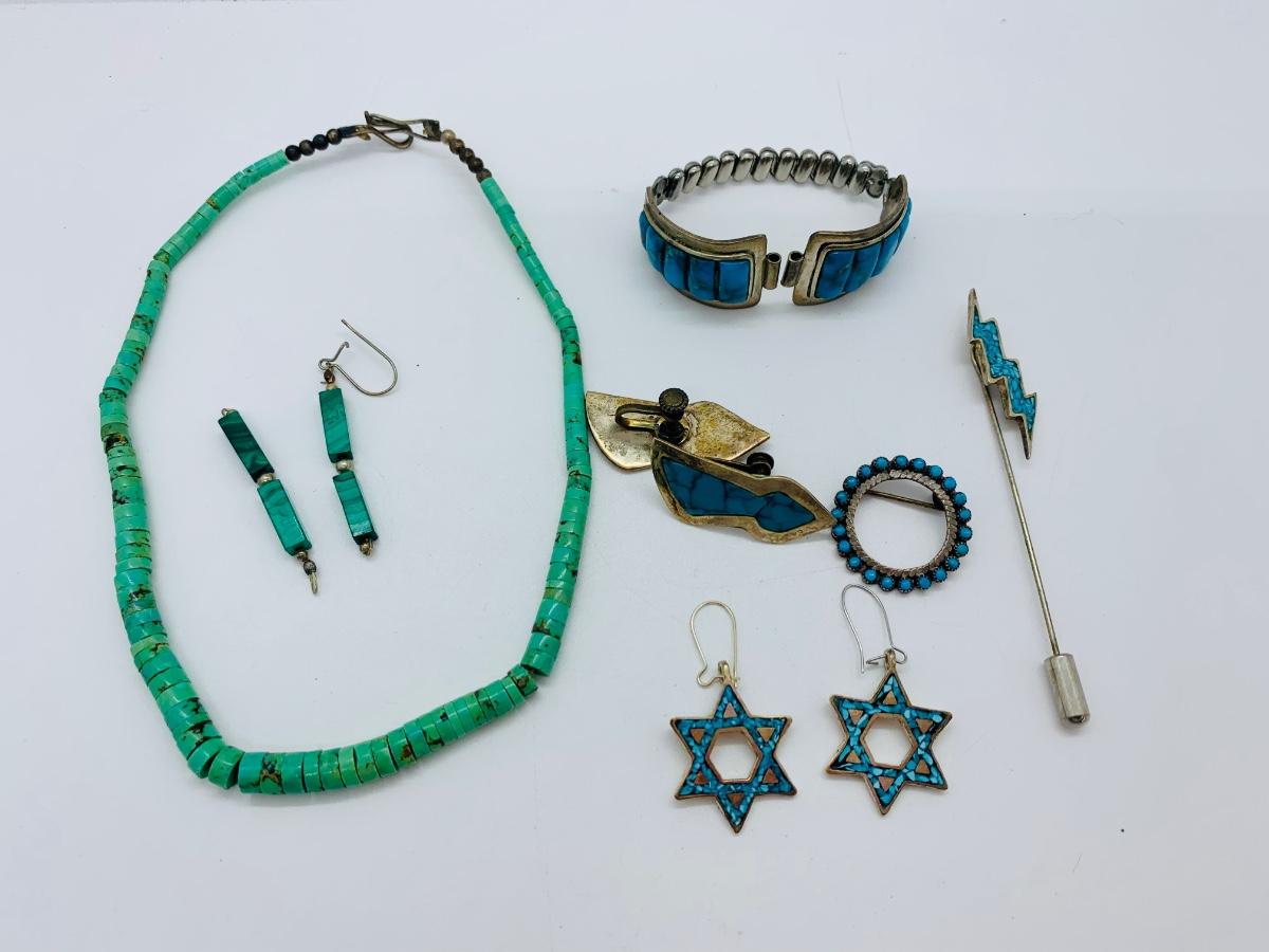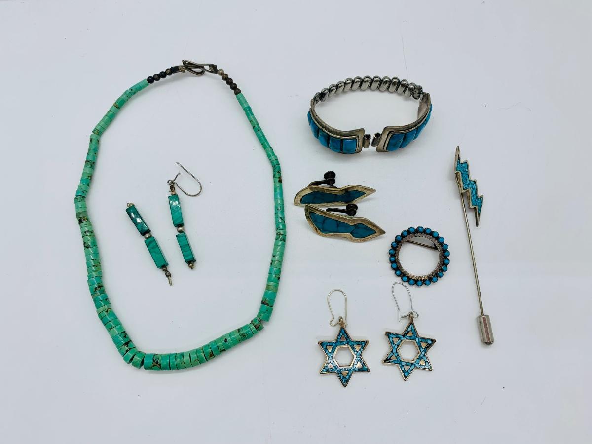 LOT 52R: South Western Jewelry Collection: Turquoise Watch Band, Stick Pin, Clip & Pierced Earrings,& More