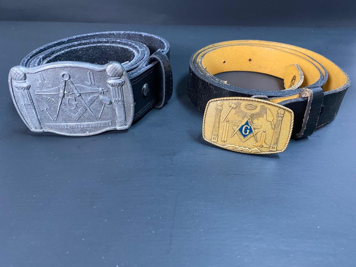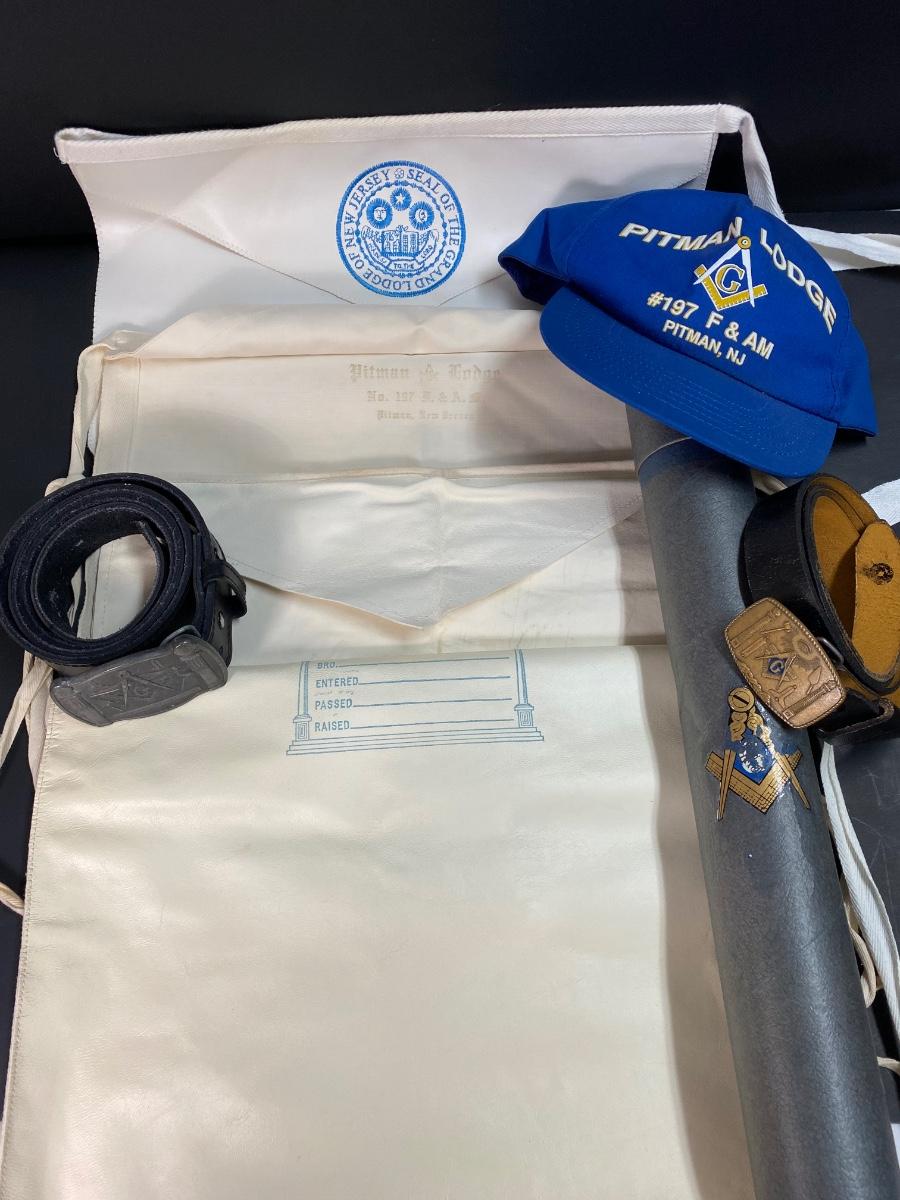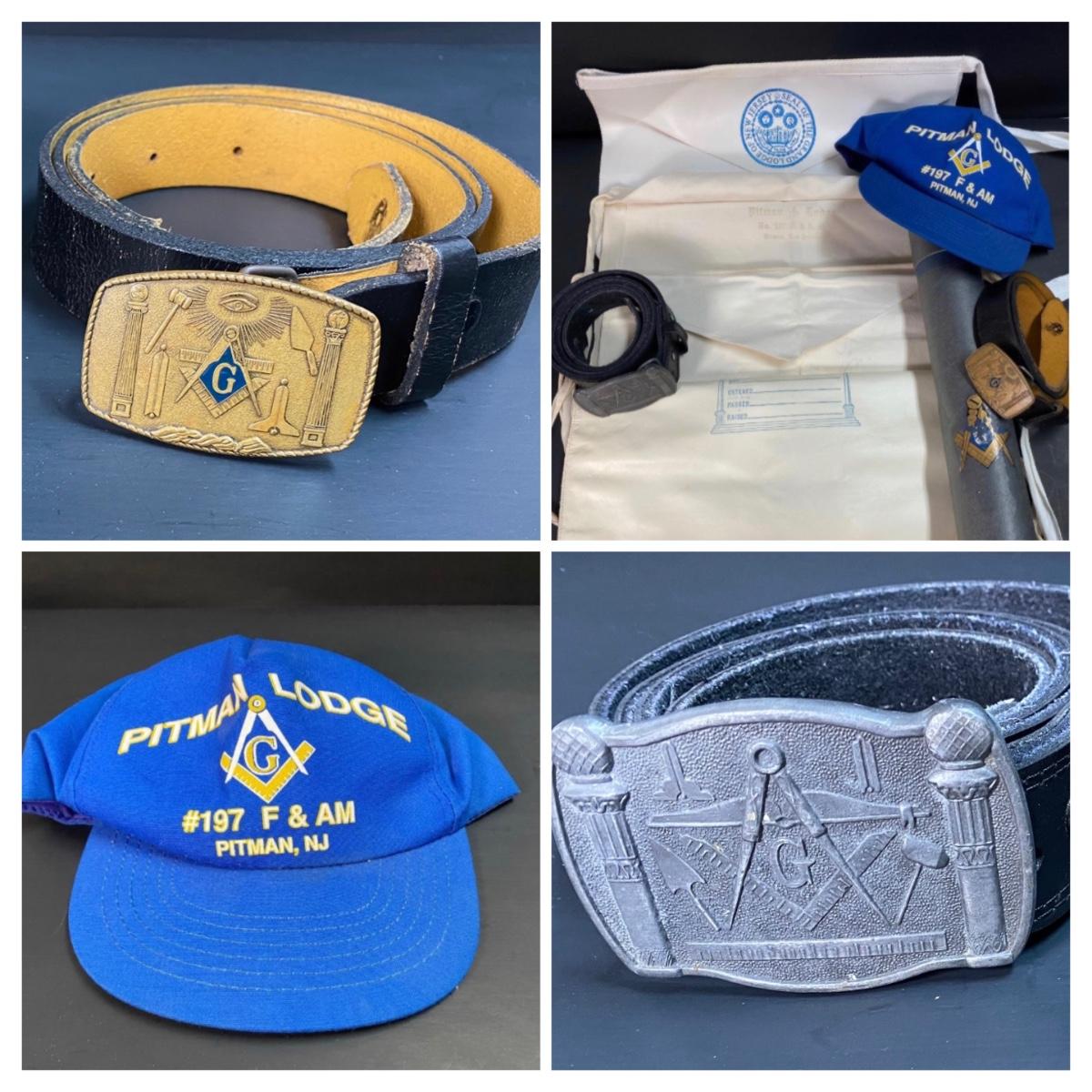 LOT 81: Masonic Accessories: Belt Buckles, Hat & Aprons