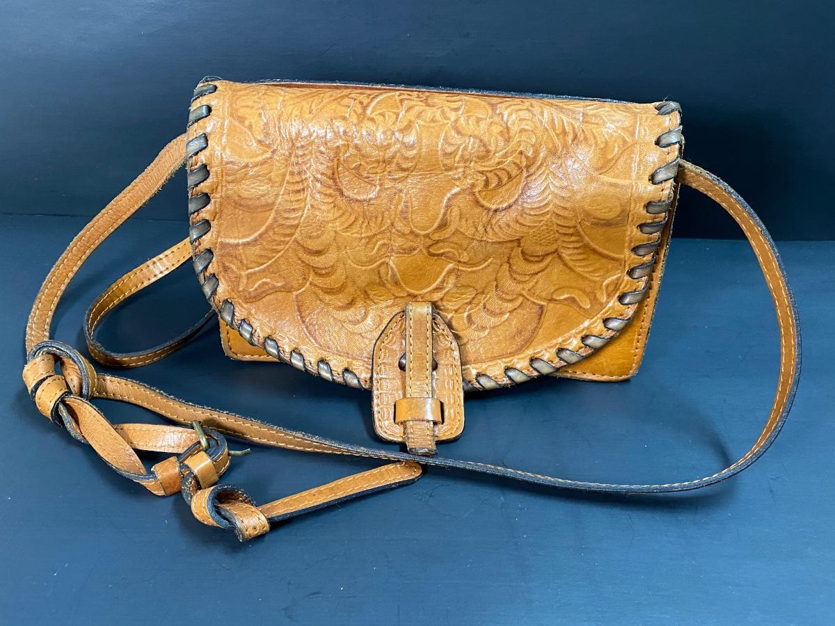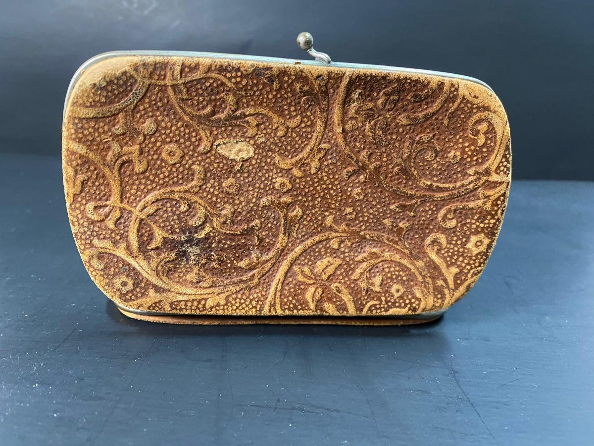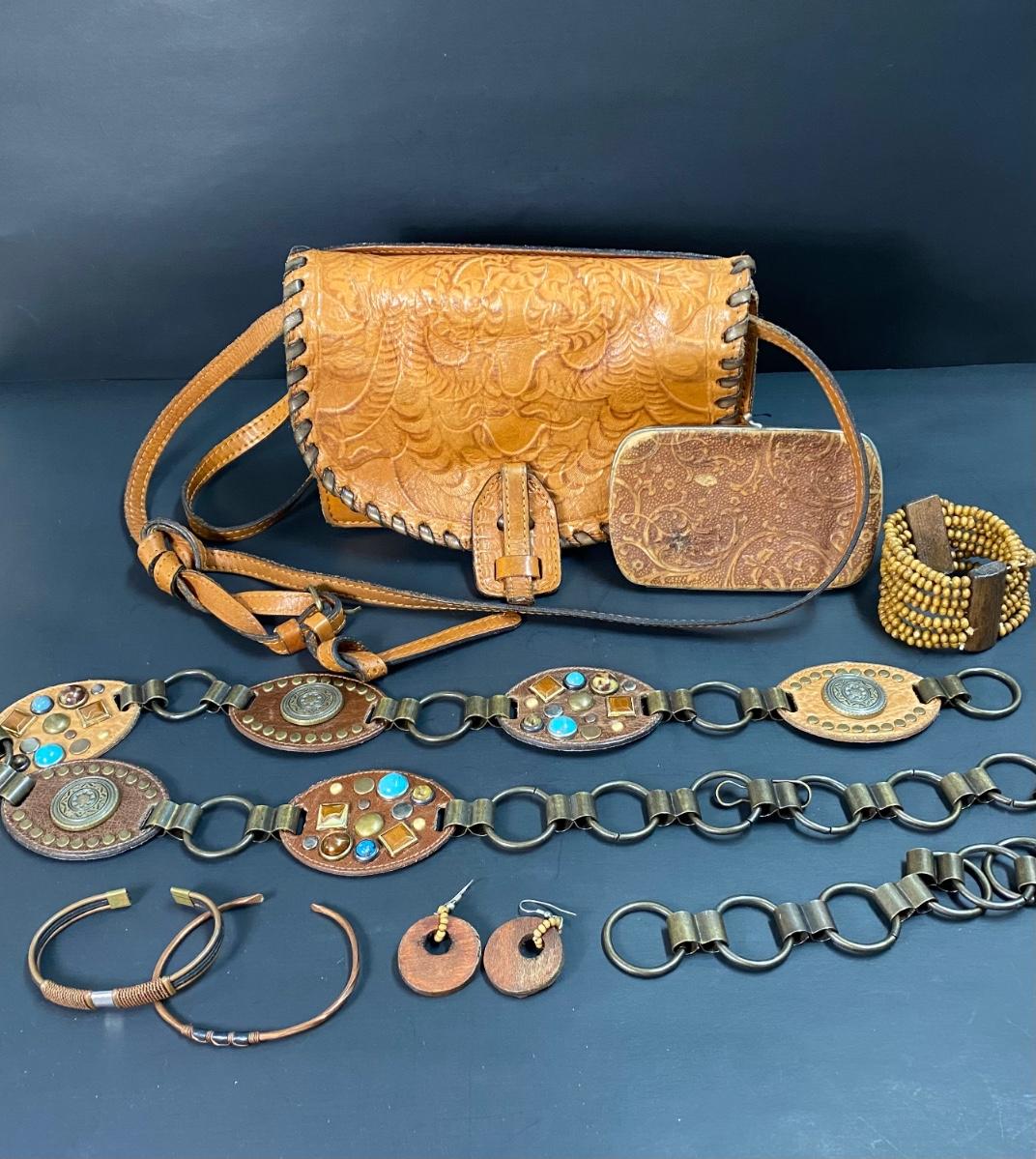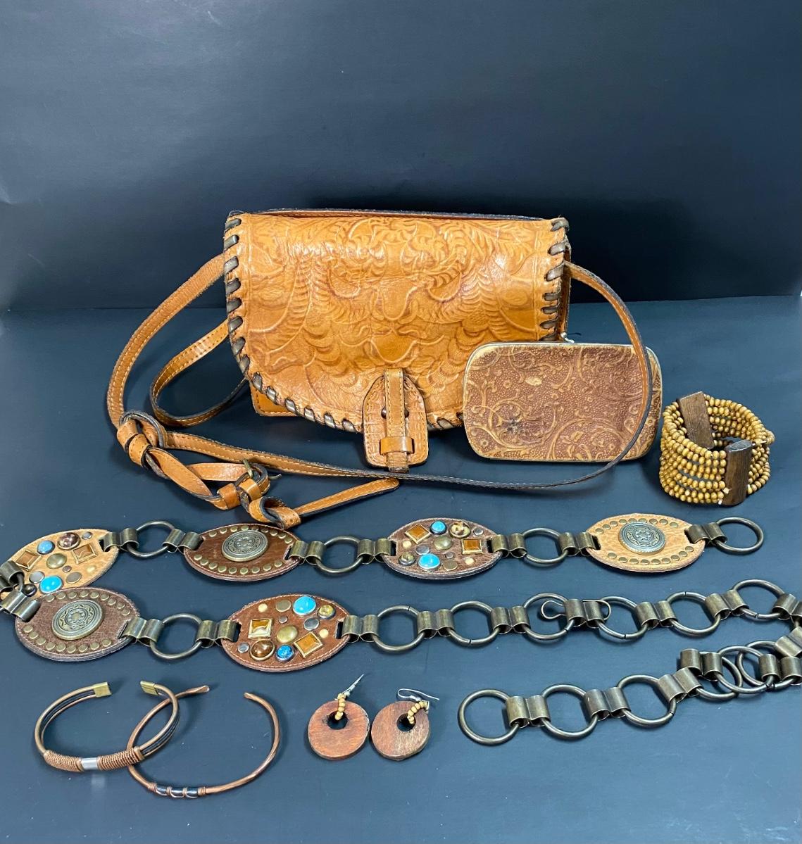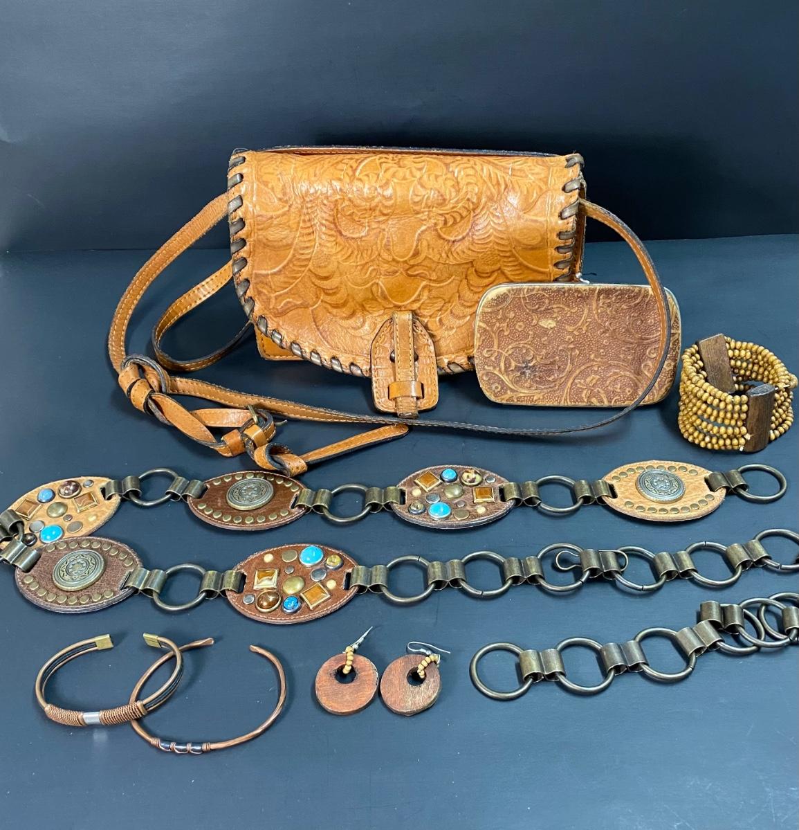 LOT 89: Leather Handbag, Sewing Kit Case, Belt & Jewelry