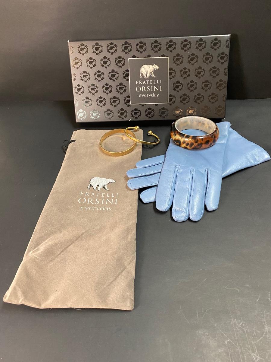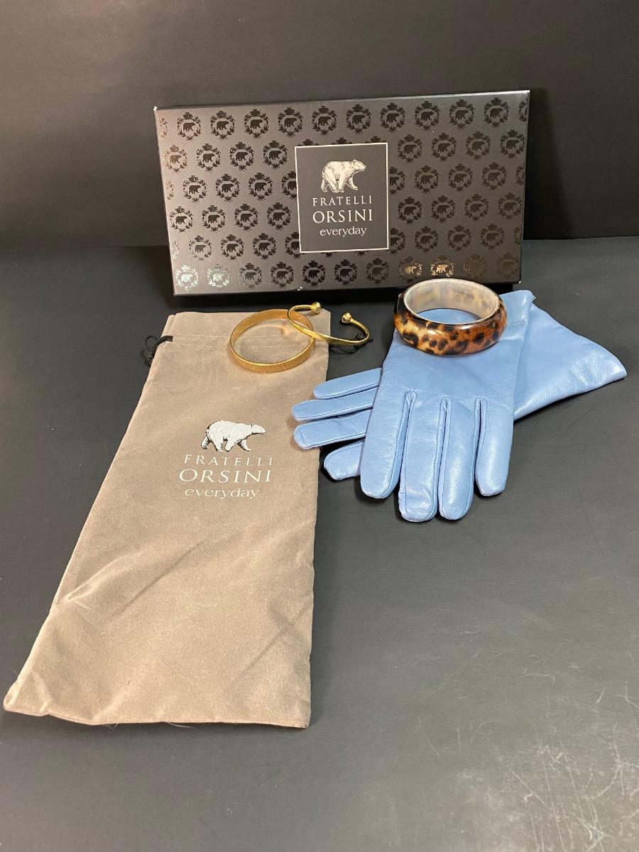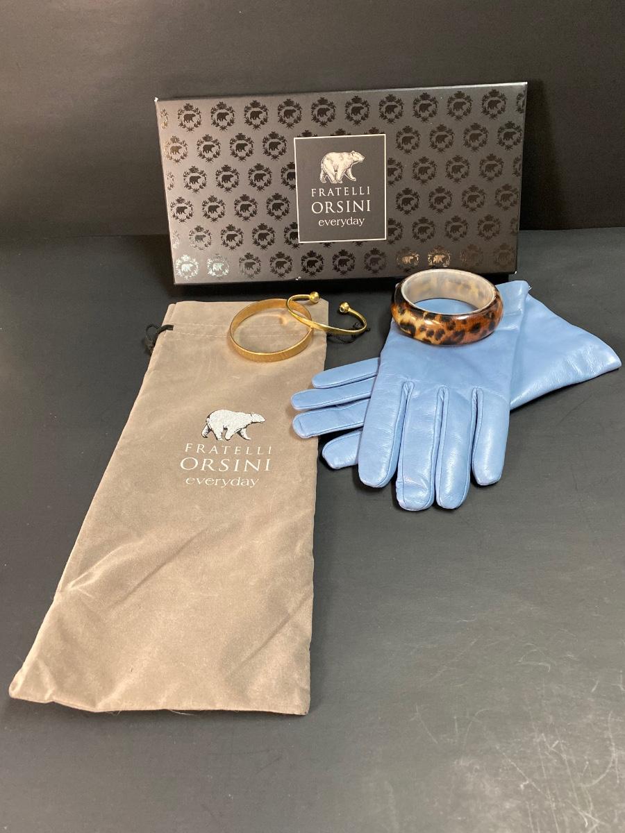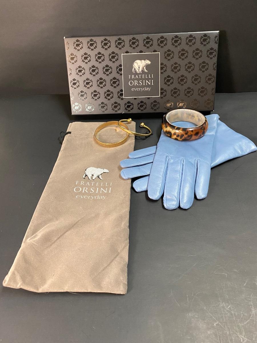 LOT 90: New Ice Blue Italian Leather Fratelli Orsini Gloves sz. Lg & Bangle Bracelets