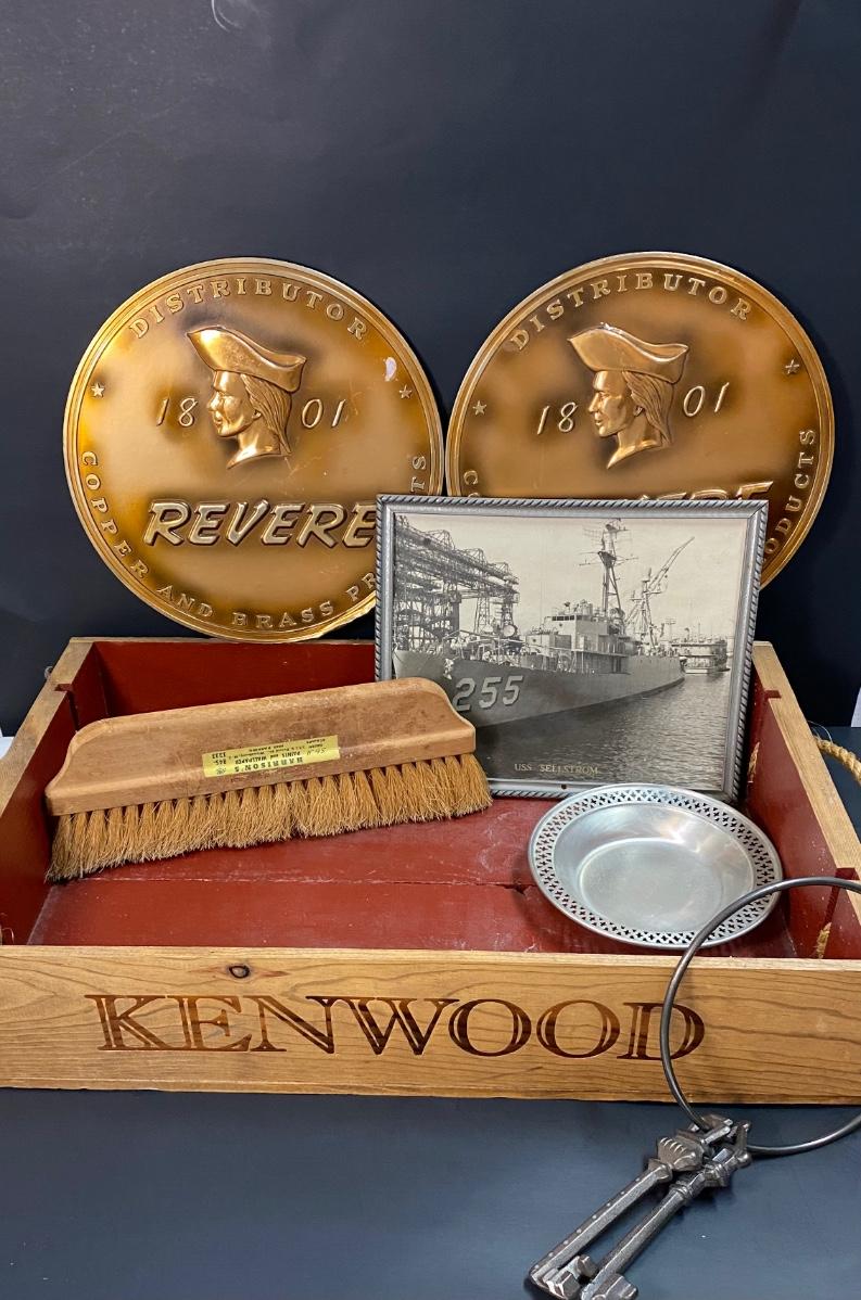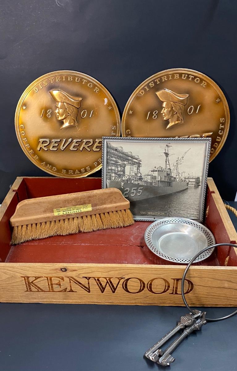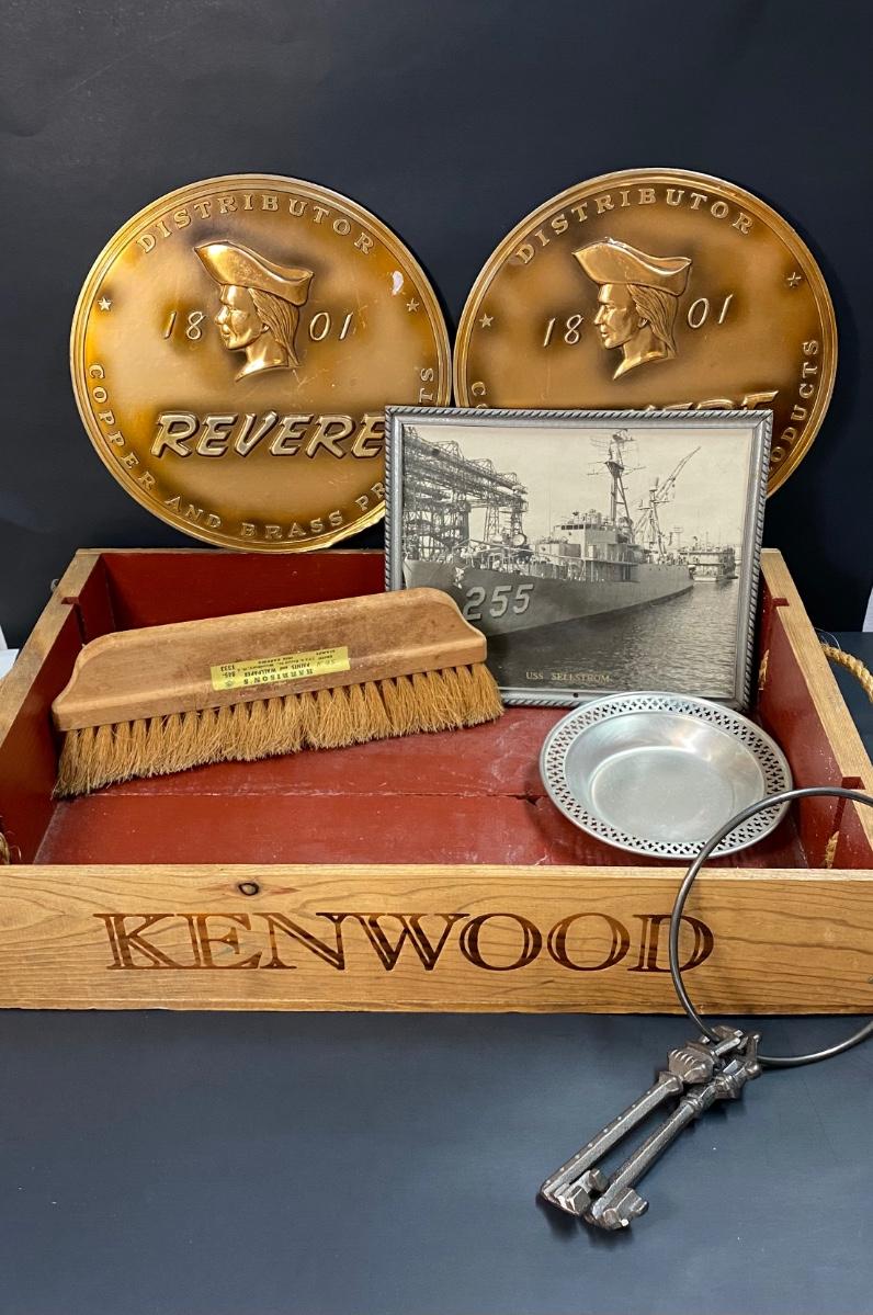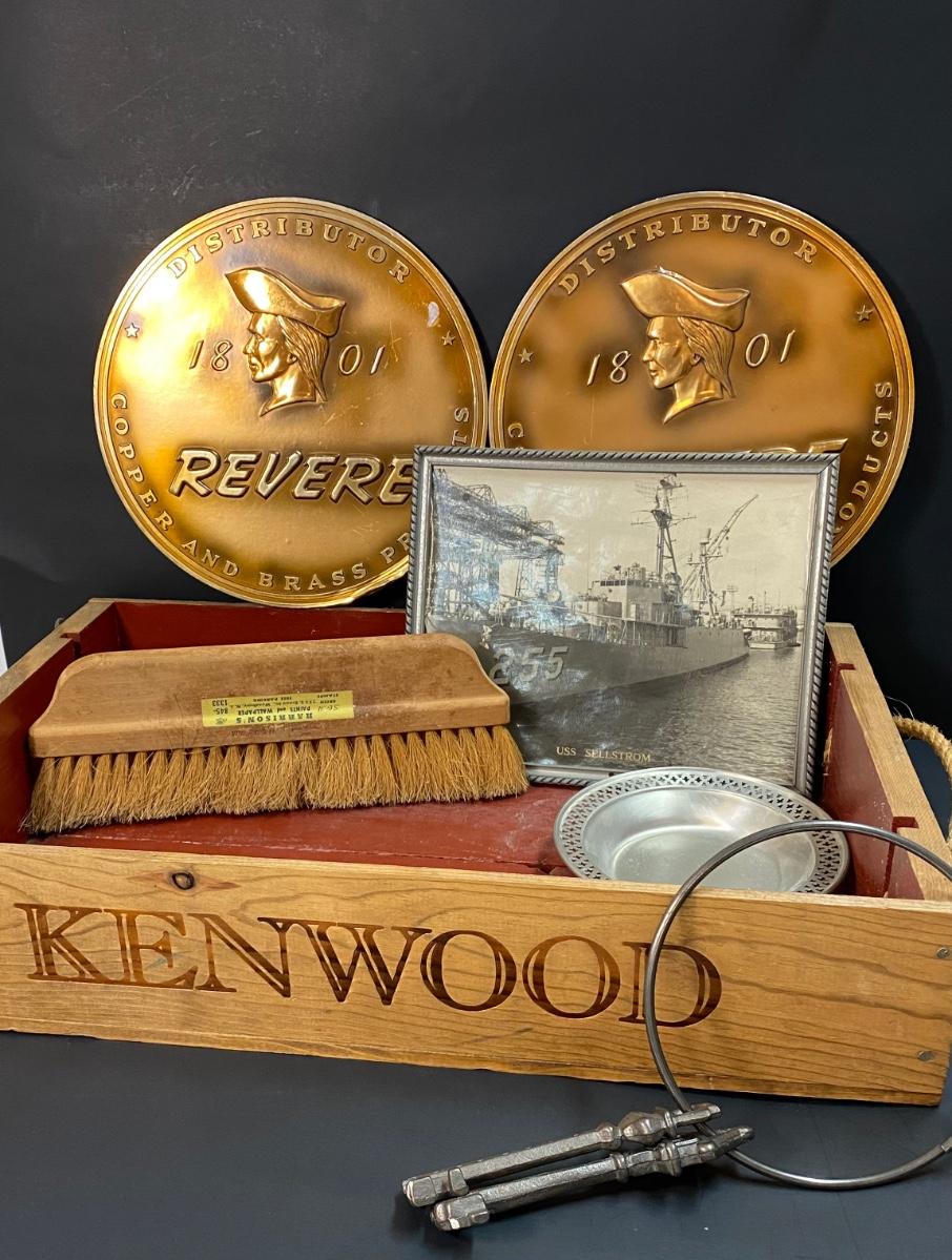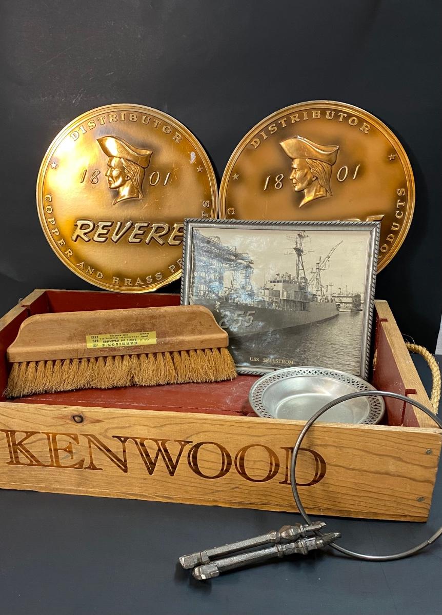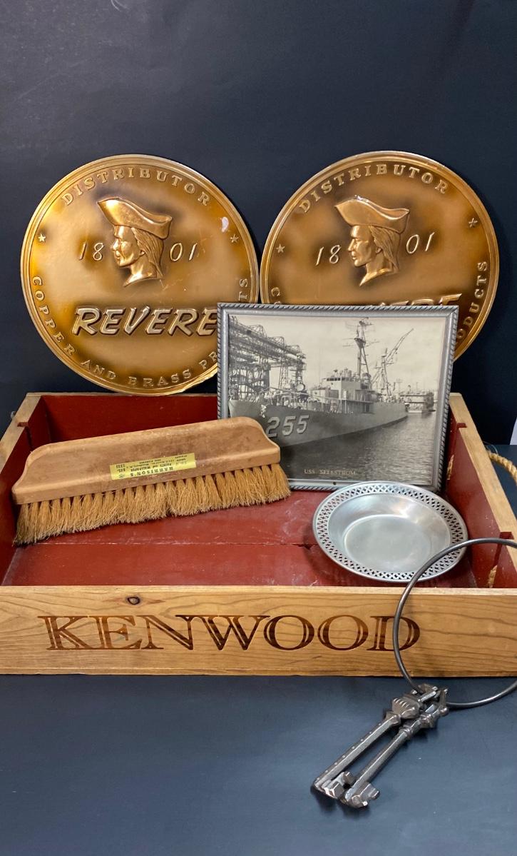 LOT 97: Kenwood Box, Advertising Revere Ware Plaques USS Sellstorm Photo and More