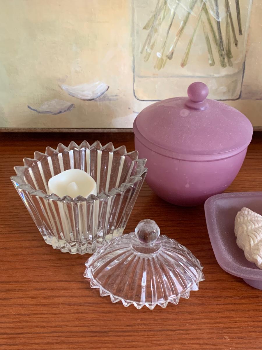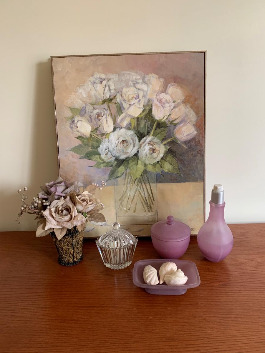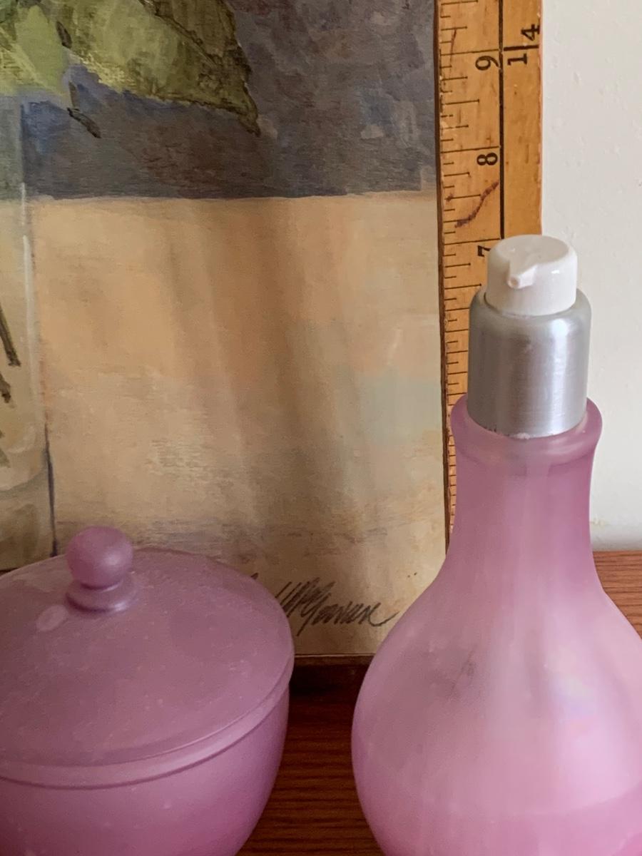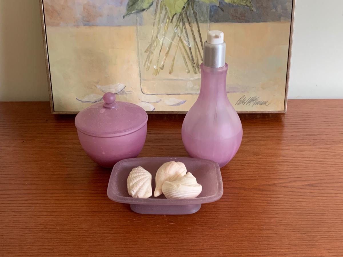 LOT 14R: Floral Print, Lavender Glass Soap Dispenser, Soap Dish, Jar & More