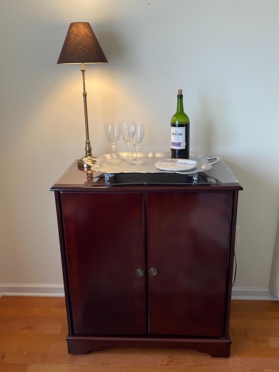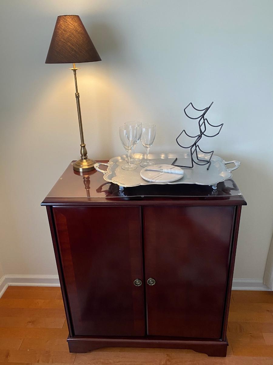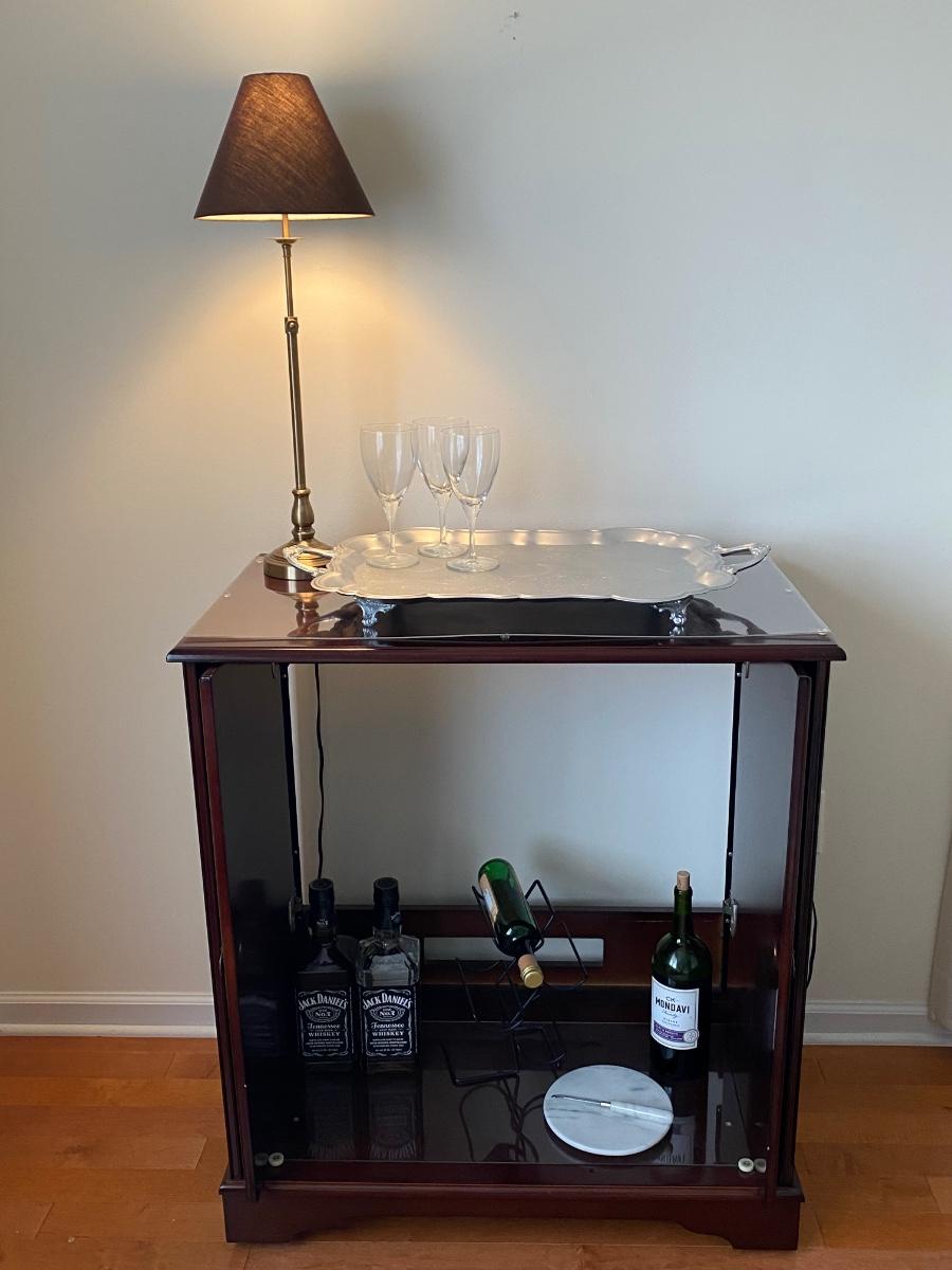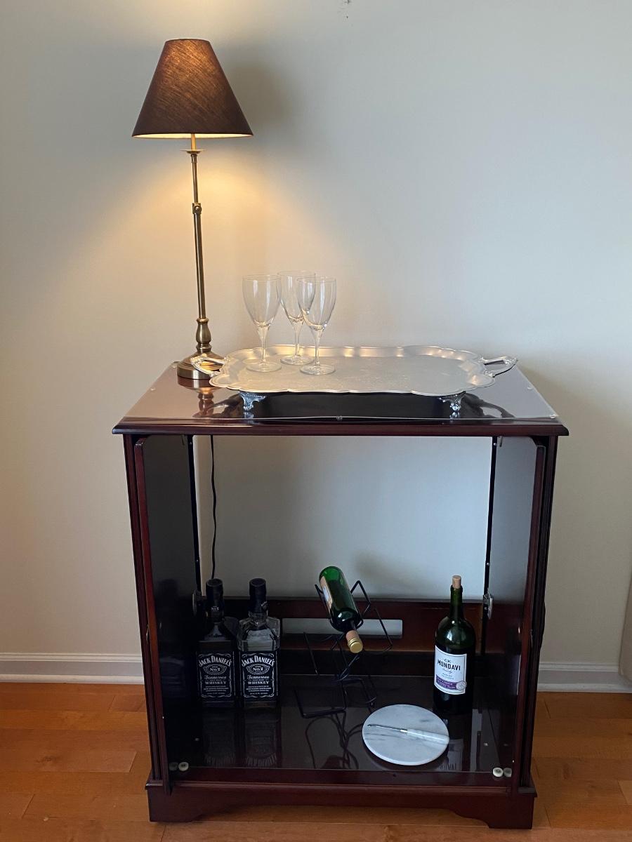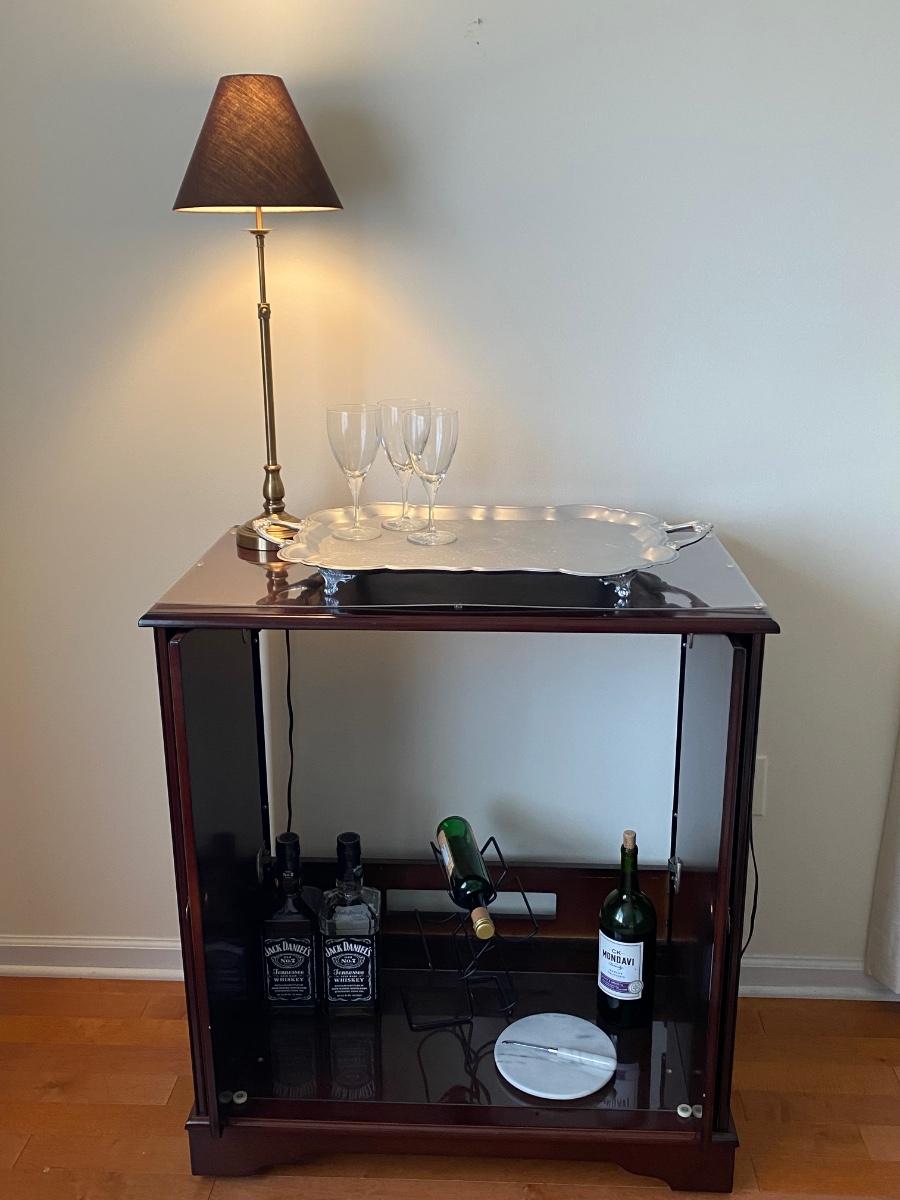 38”x 34” 20” Incudes lamp, silver tone tray, metal wine rack and cheese plates knife. Alcohol NOT included. Please see all pictures as they are the best representation of the items. The pictures show condition, measurements if taken, and what is included in the lot. Due to the large amount that we photograph and the time frame, we are not always able to take measurements. All items unless noted, are pre-owned and have been used. If you purchased furniture, you must bring help. We do not allow one person to carry large furniture out on their own. Bring help, tools and a truck for the safety of our client’s homes, and your personal safety. Any damages that result to the property including walls, and floors due to moving of the furniture will be charged to the buyer. Company policy. Thank you.