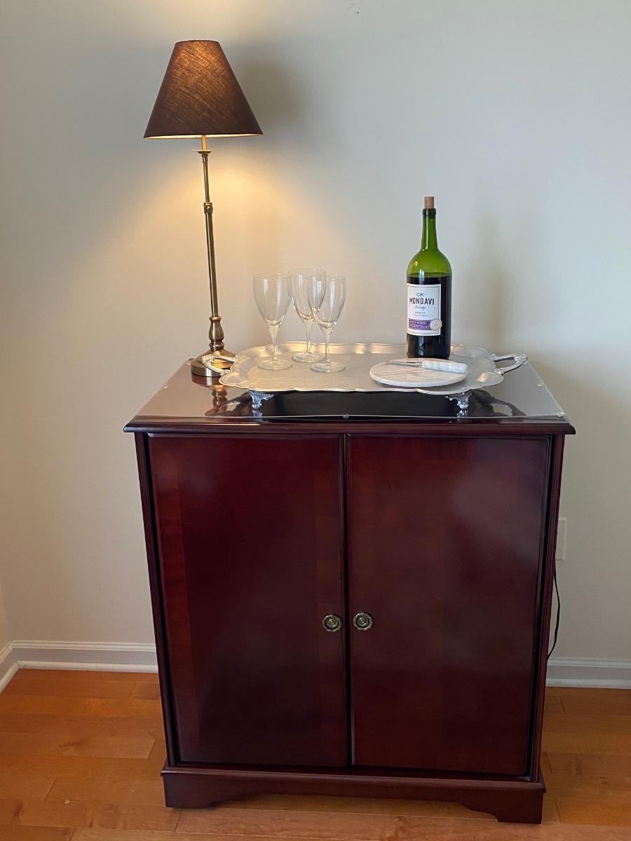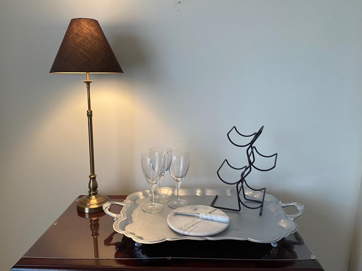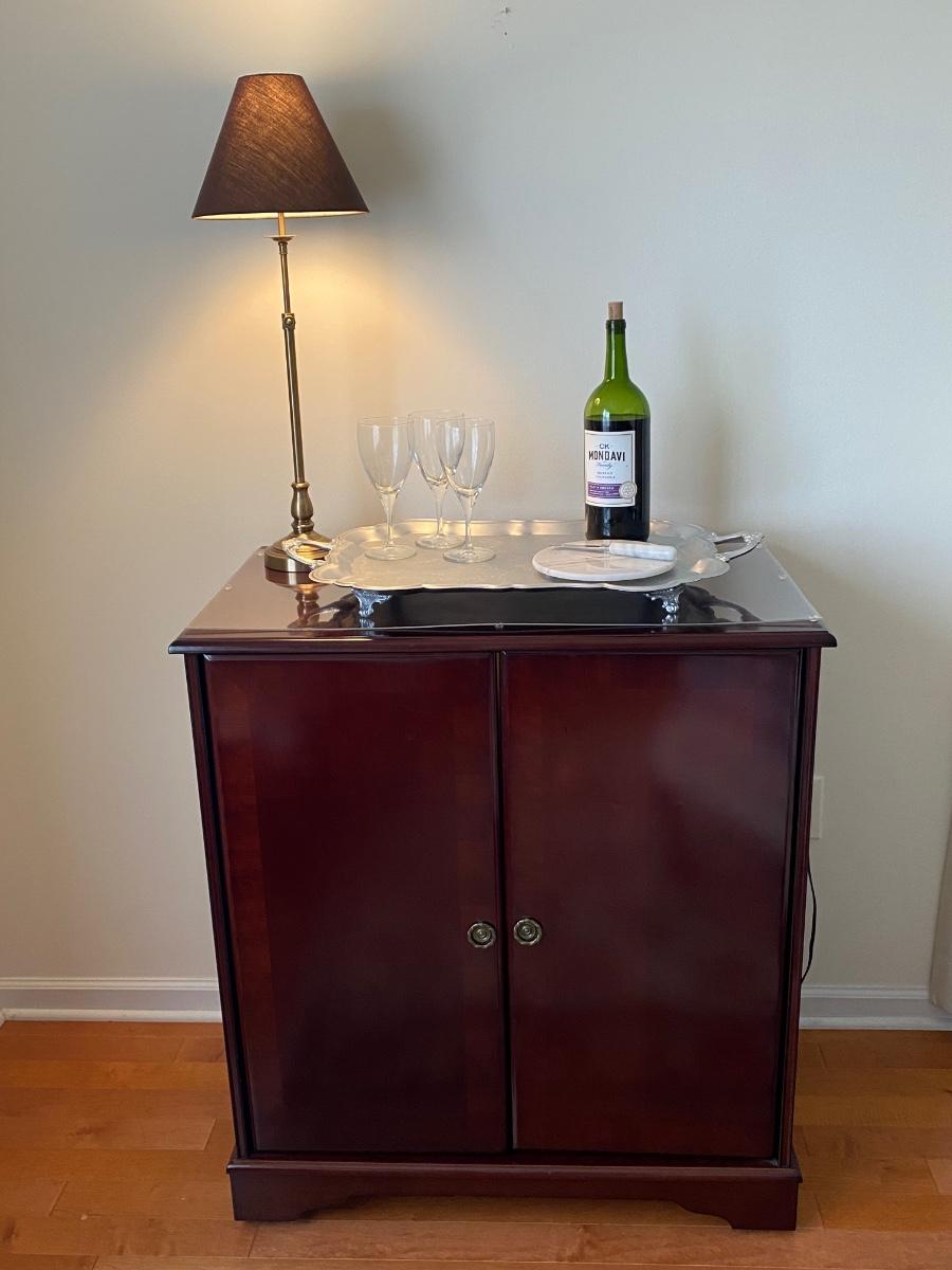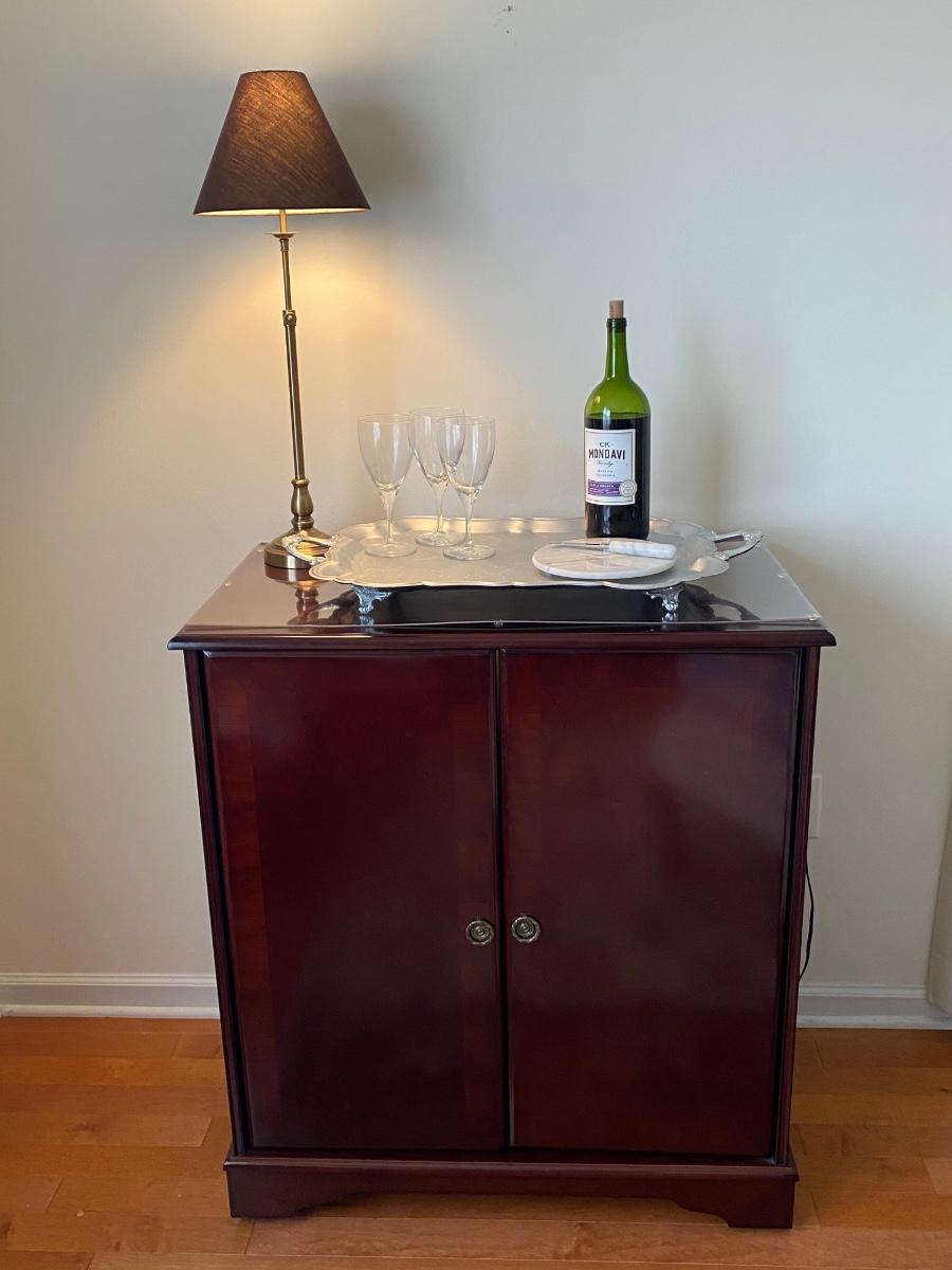 38”x 34” 20” Incudes lamp, silver tone tray, metal wine rack and cheese plates knife. Alcohol NOT included. Please see all pictures as they are the best representation of the items. The pictures show condition, measurements if taken, and what is included in the lot. Due to the large amount that we photograph and the time frame, we are not always able to take measurements. All items unless noted, are pre-owned and have been used. If you purchased furniture, you must bring help. We do not allow one person to carry large furniture out on their own. Bring help, tools and a truck for the safety of our client’s homes, and your personal safety. Any damages that result to the property including walls, and floors due to moving of the furniture will be charged to the buyer. Company policy. Thank you.