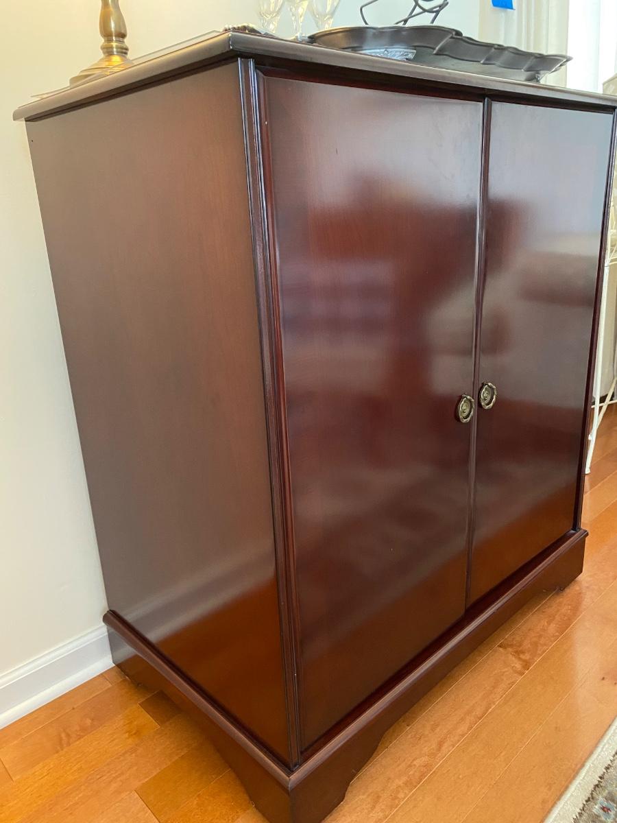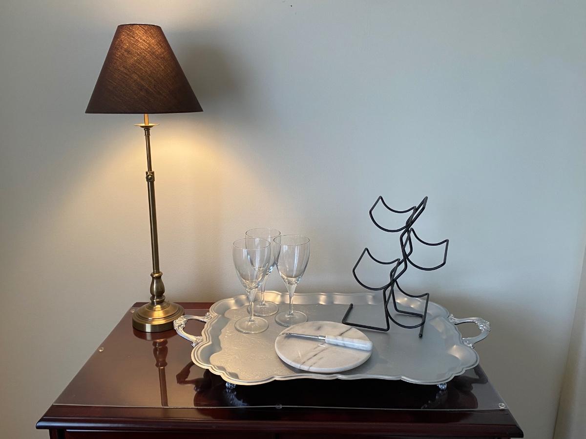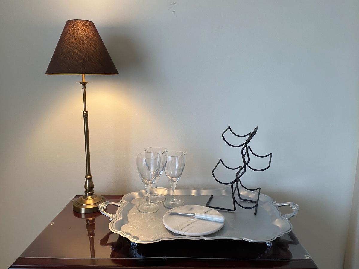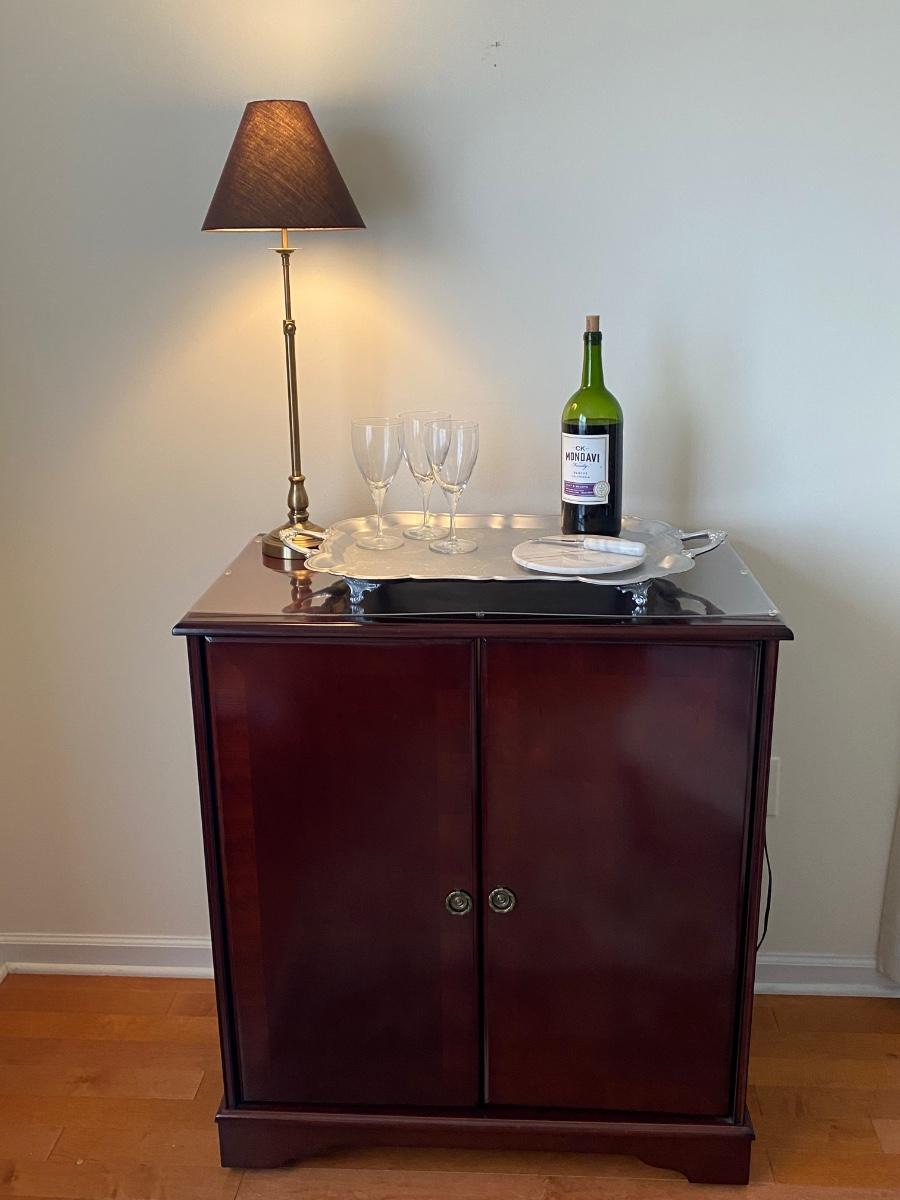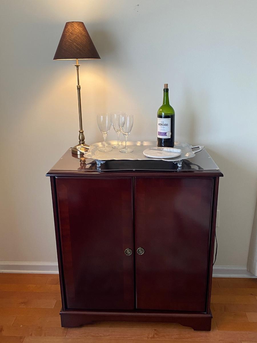 38”x 34” 20” Incudes lamp, silver tone tray, metal wine rack and cheese plates knife. Alcohol NOT included. Please see all pictures as they are the best representation of the items. The pictures show condition, measurements if taken, and what is included in the lot. Due to the large amount that we photograph and the time frame, we are not always able to take measurements. All items unless noted, are pre-owned and have been used. If you purchased furniture, you must bring help. We do not allow one person to carry large furniture out on their own. Bring help, tools and a truck for the safety of our client’s homes, and your personal safety. Any damages that result to the property including walls, and floors due to moving of the furniture will be charged to the buyer. Company policy. Thank you.