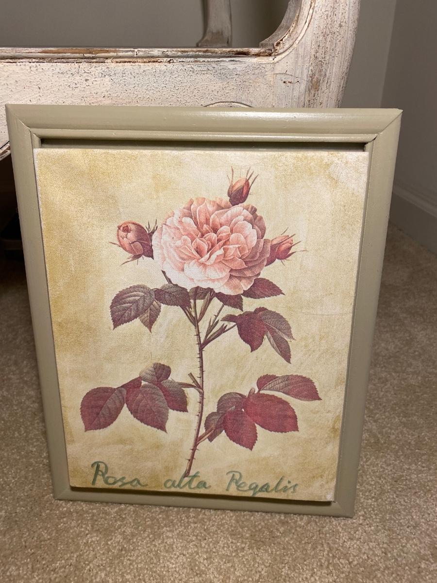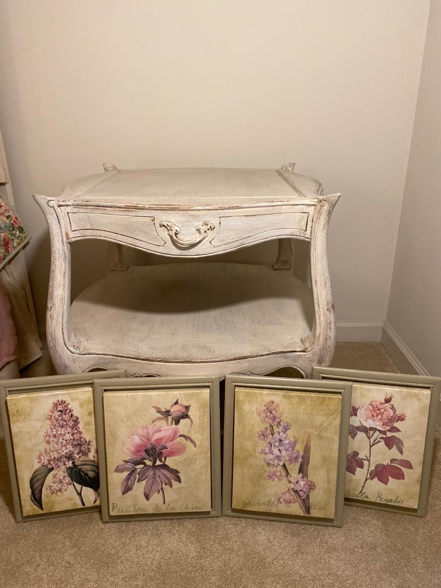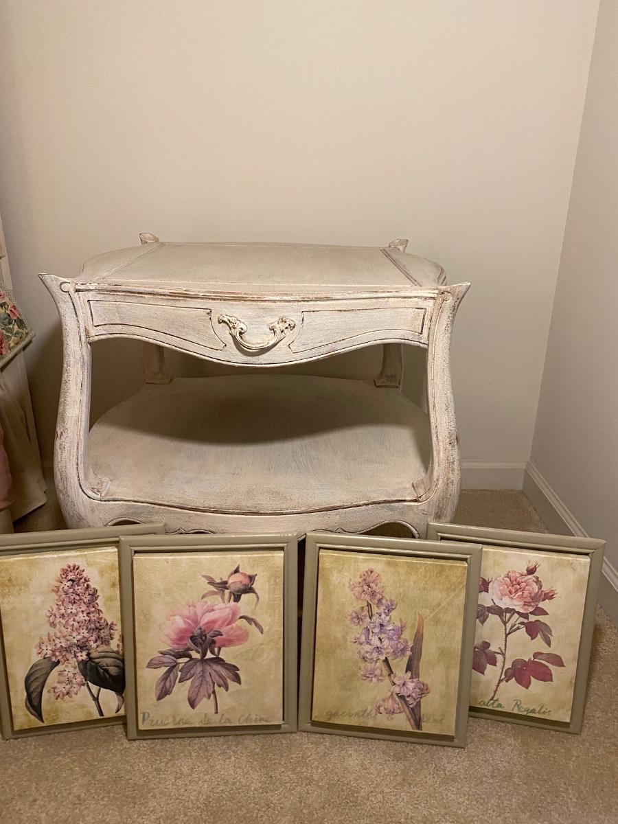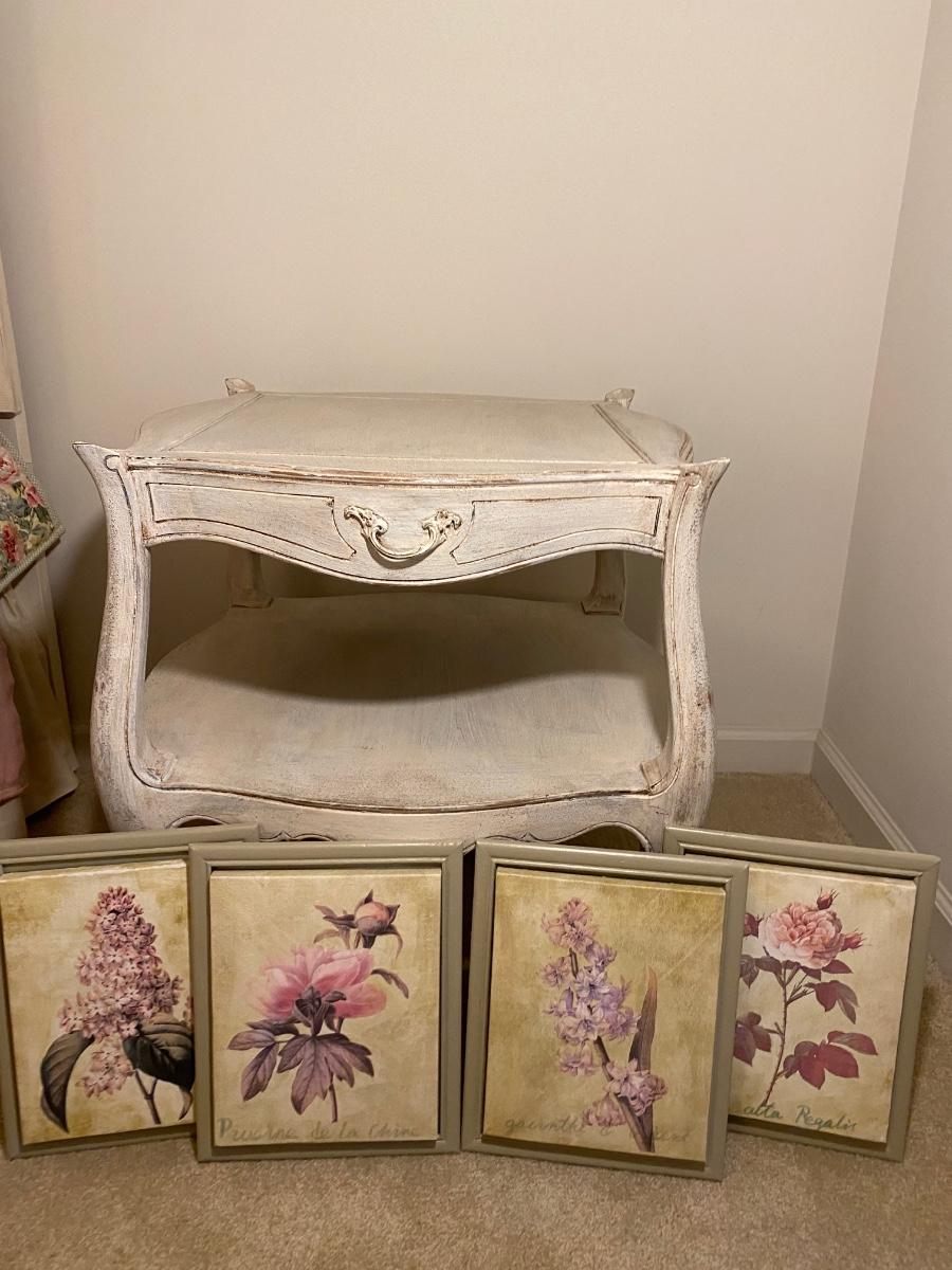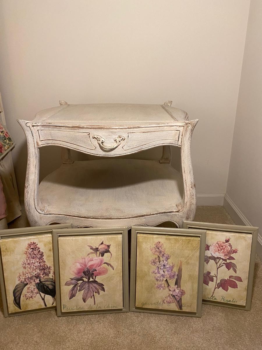 23”x 23”x 26” Cream Painted end table. Four framed floral prints. Please see all pictures as they are the best representation of the items. The pictures show condition, measurements if taken, and what is included in the lot. Due to the large amount that we photograph and the time frame, we are not always able to take measurements. All items unless noted, are pre-owned and have been used. If you purchased furniture, you must bring help. We do not allow one person to carry large furniture out on their own. Bring help, tools and a truck for the safety of our client’s homes, and your personal safety. Any damages that result to the property including walls, and floors due to moving of the furniture will be charged to the buyer. Company policy. Thank you.