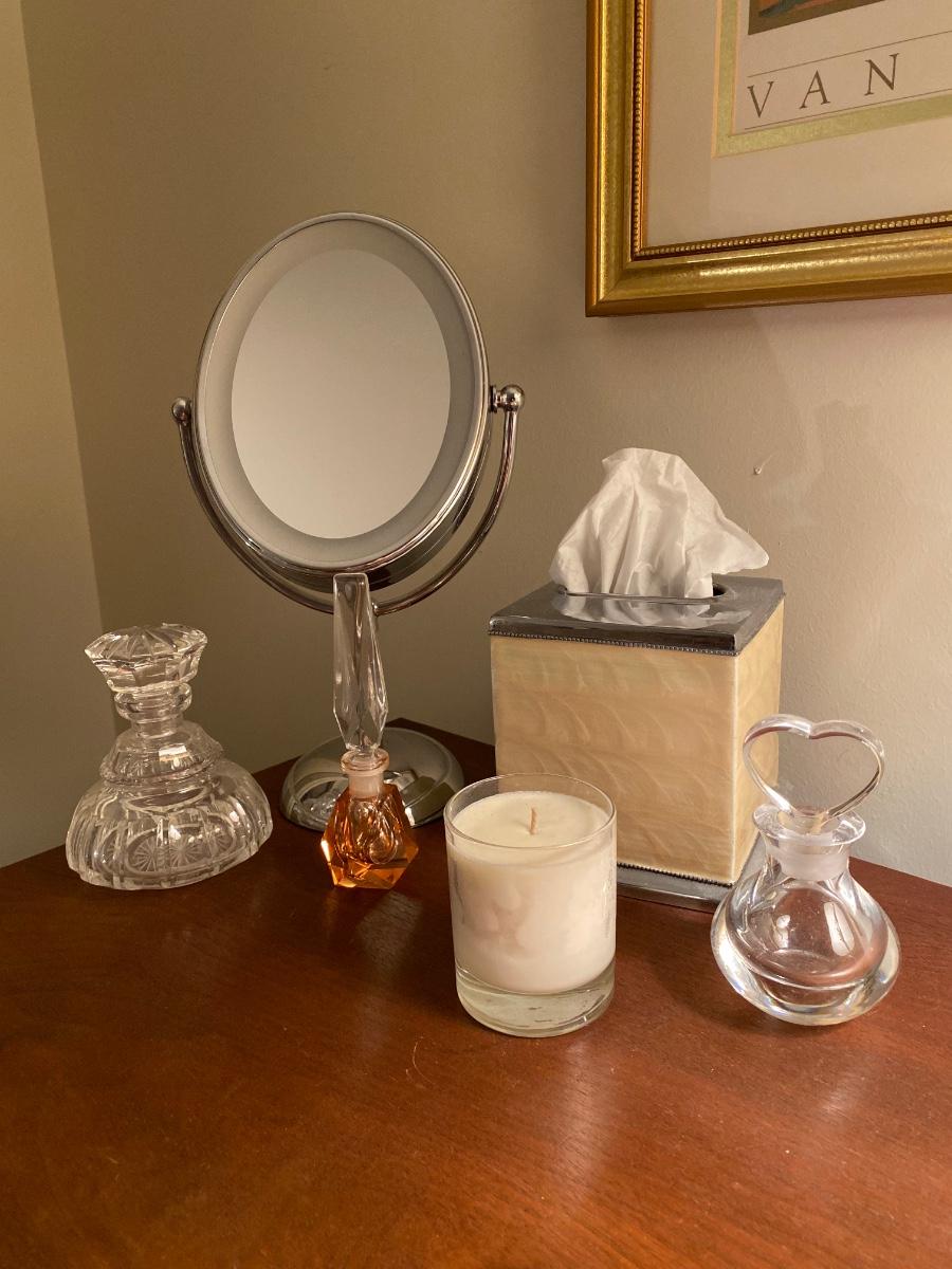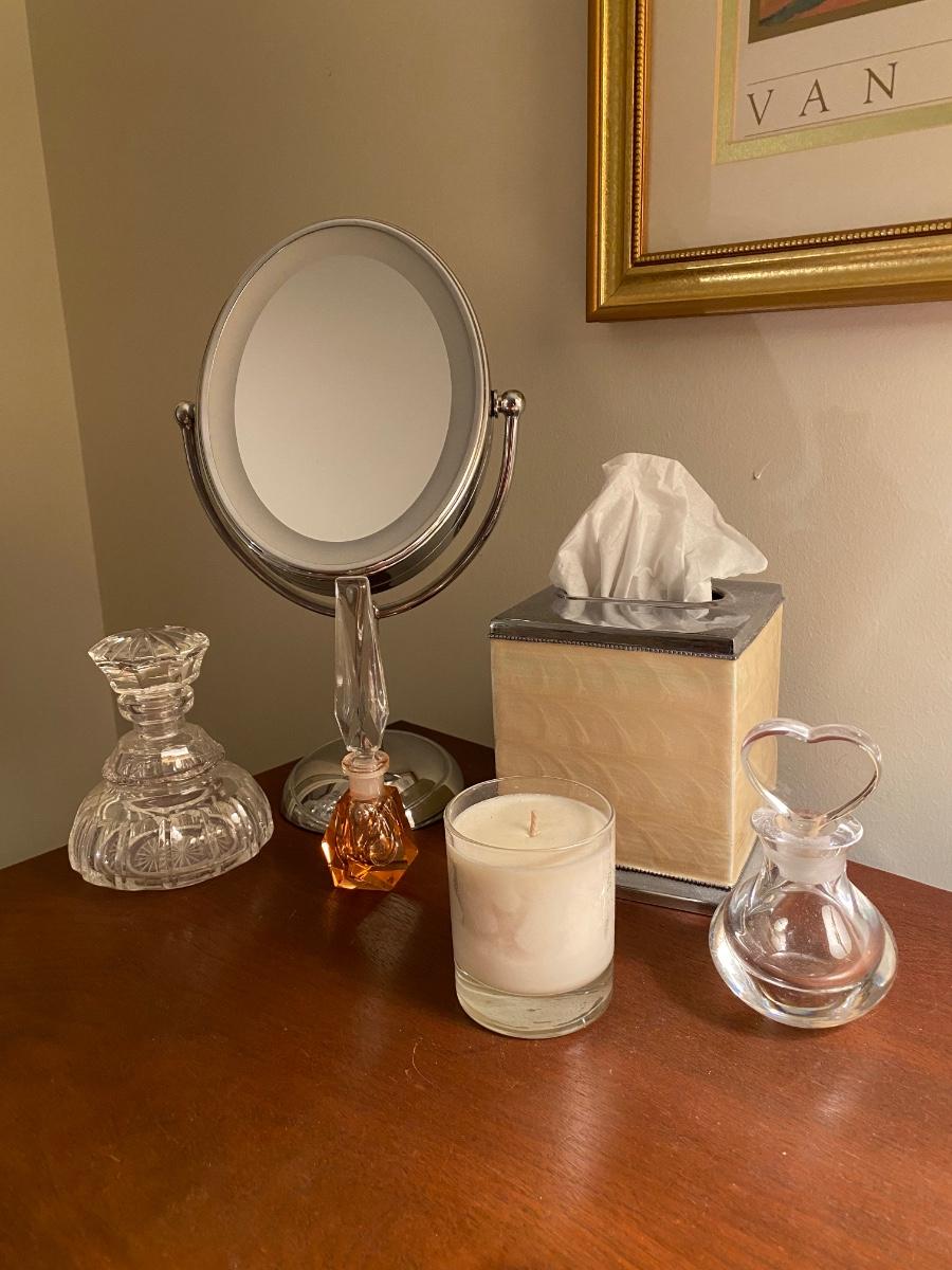 Double sided mirror, perfume bottles, tissue box holder and a candle. Please see all pictures as they are the best representation of the items. The pictures show condition, measurements if taken, and what is included in the lot. Due to the large amount that we photograph and the time frame, we are not always able to take measurements. All items unless noted, are pre-owned and have been used. If you purchased furniture, you must bring help. We do not allow one person to carry large furniture out on their own. Bring help, tools and a truck for the safety of our client’s homes, and your personal safety. Any damages that result to the property including walls, and floors due to moving of the furniture will be charged to the buyer. Company policy. Thank you.