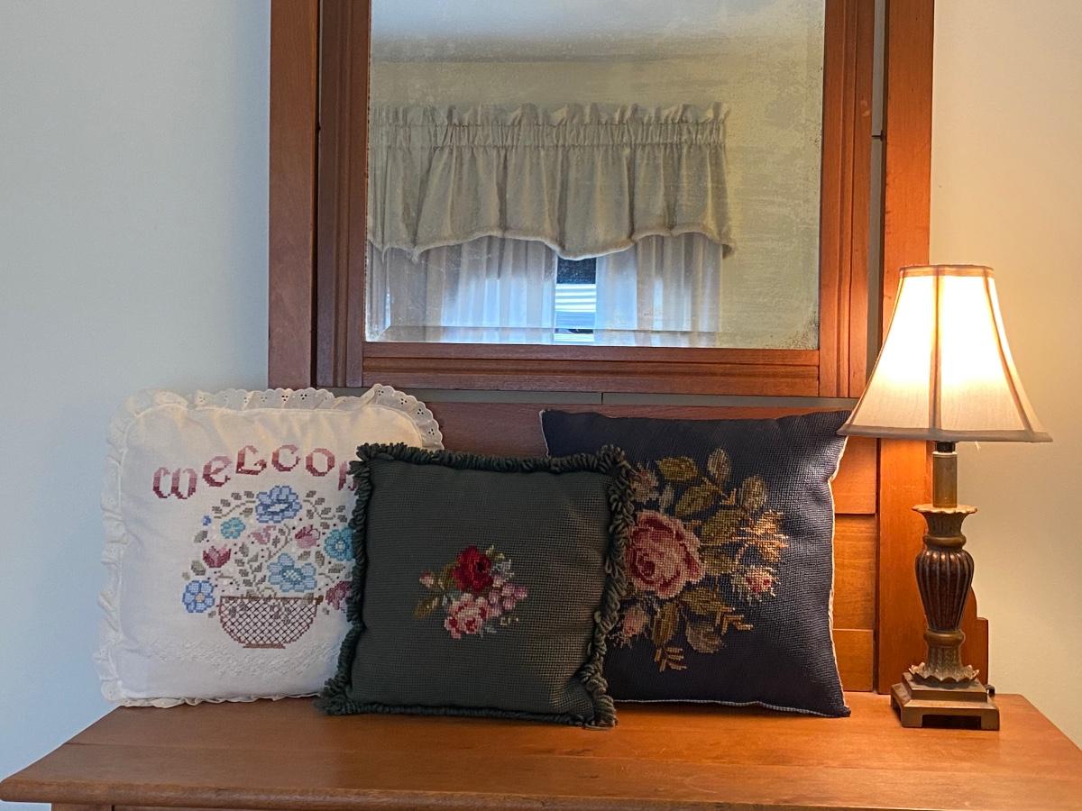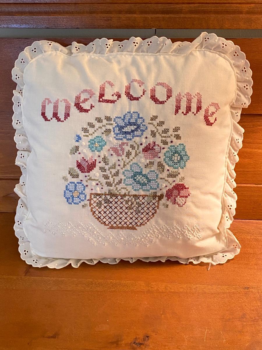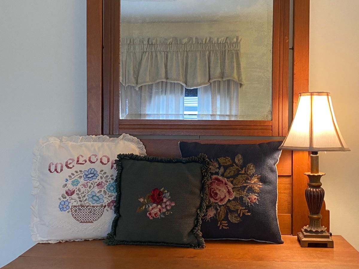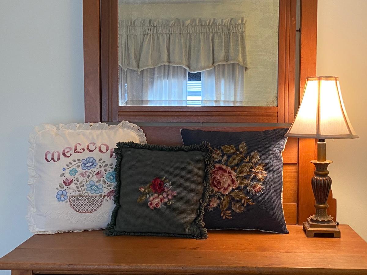 LOT 51C: Three Cross Stitched Pillows and Table Lamp