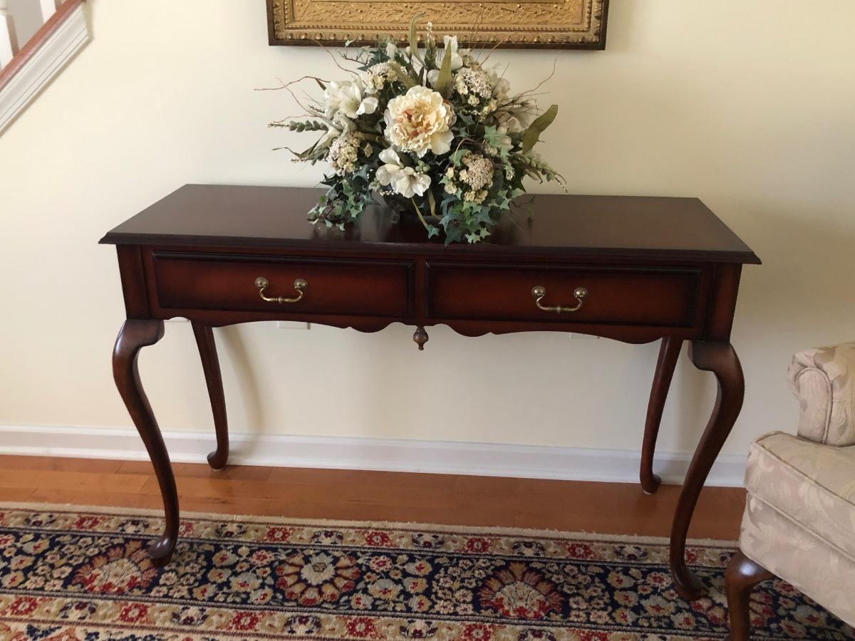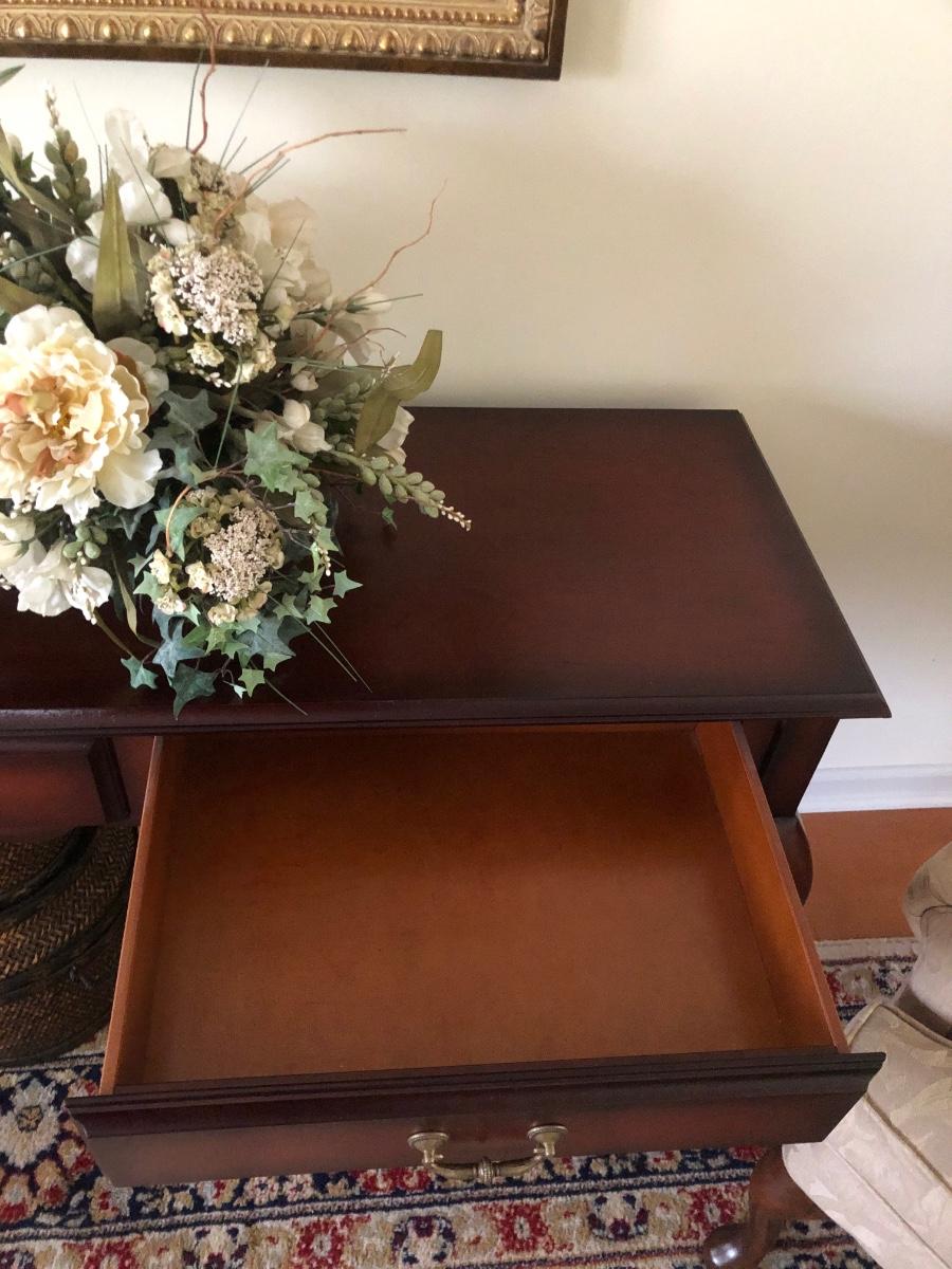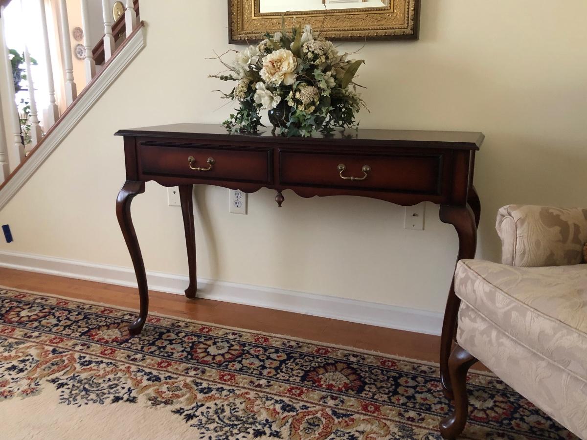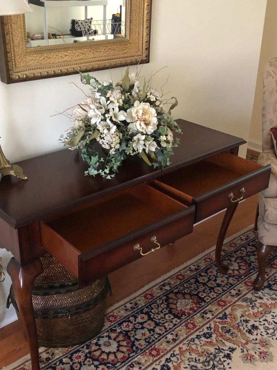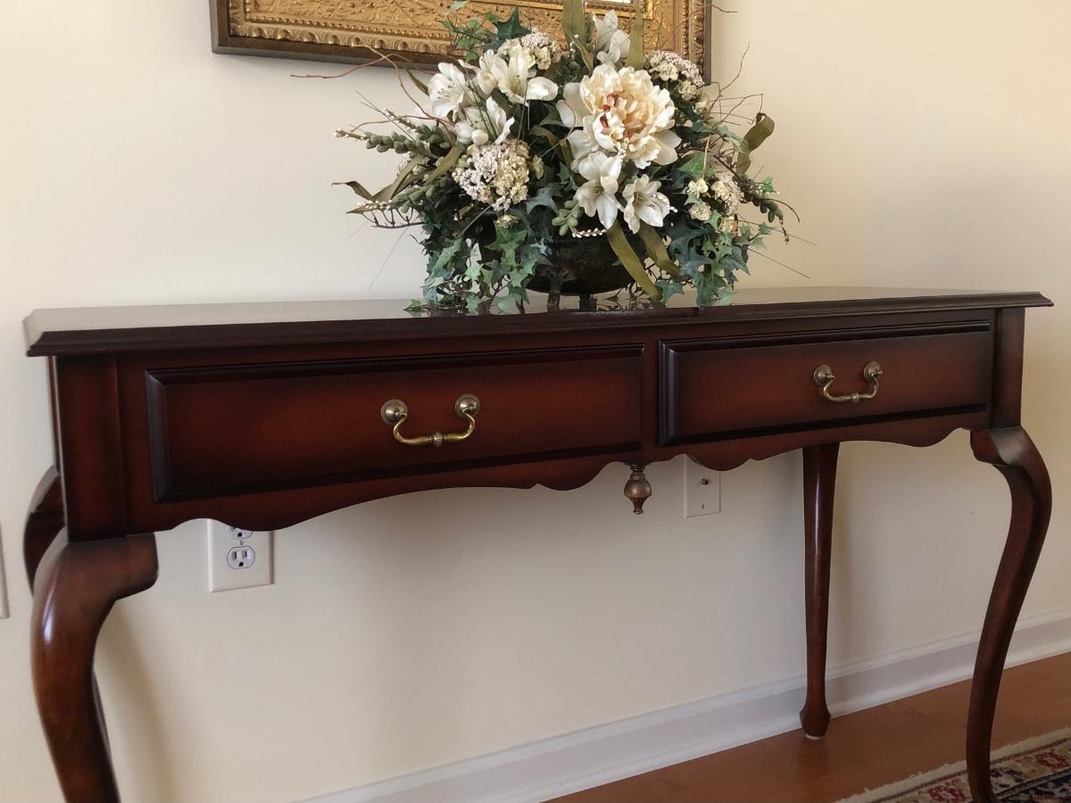 Rectangular wooden foyer table in brown with brass handle and glossy finish. Includes artificial flowers shown in photos.