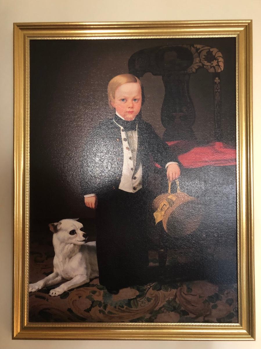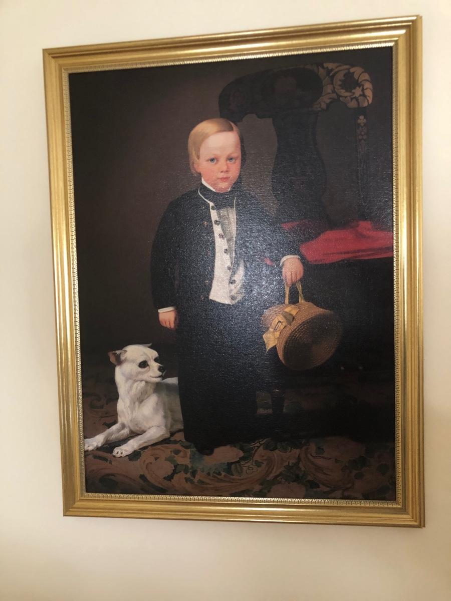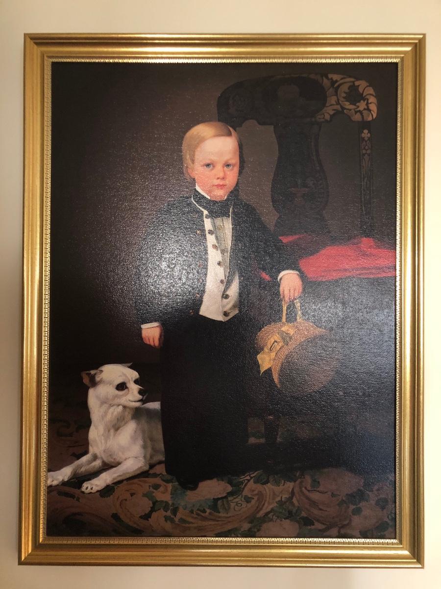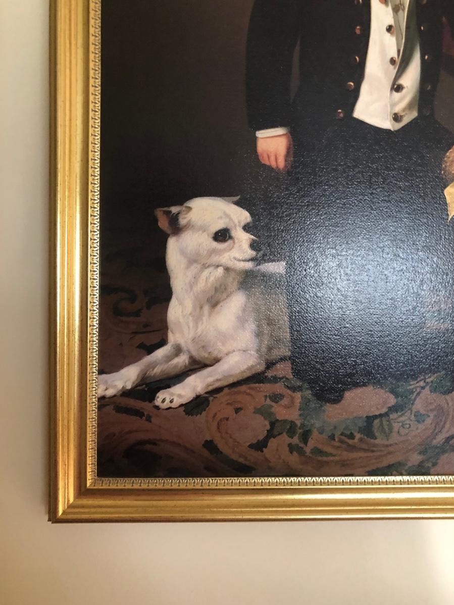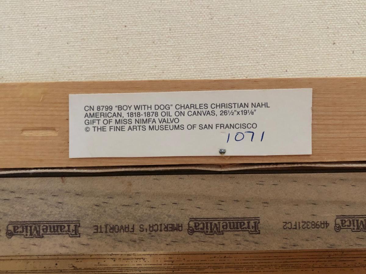 Print of "Boy with Dog" by American artist Charles Christian Nahl (1818-1878). Print on canvas. Gold colored frame included.