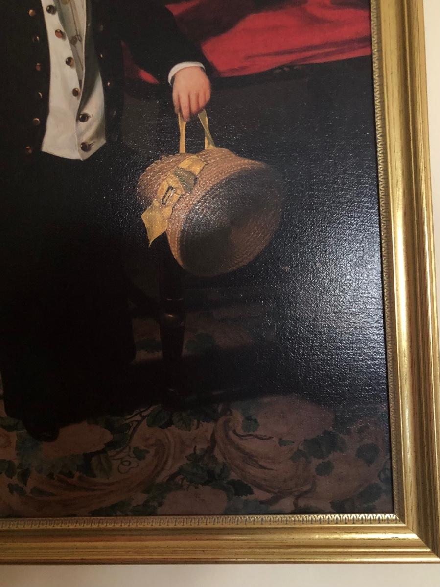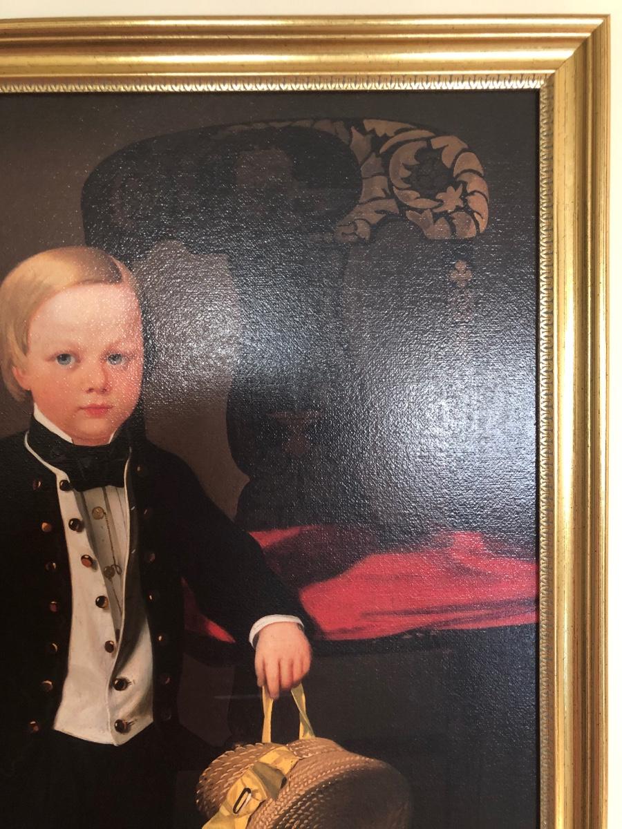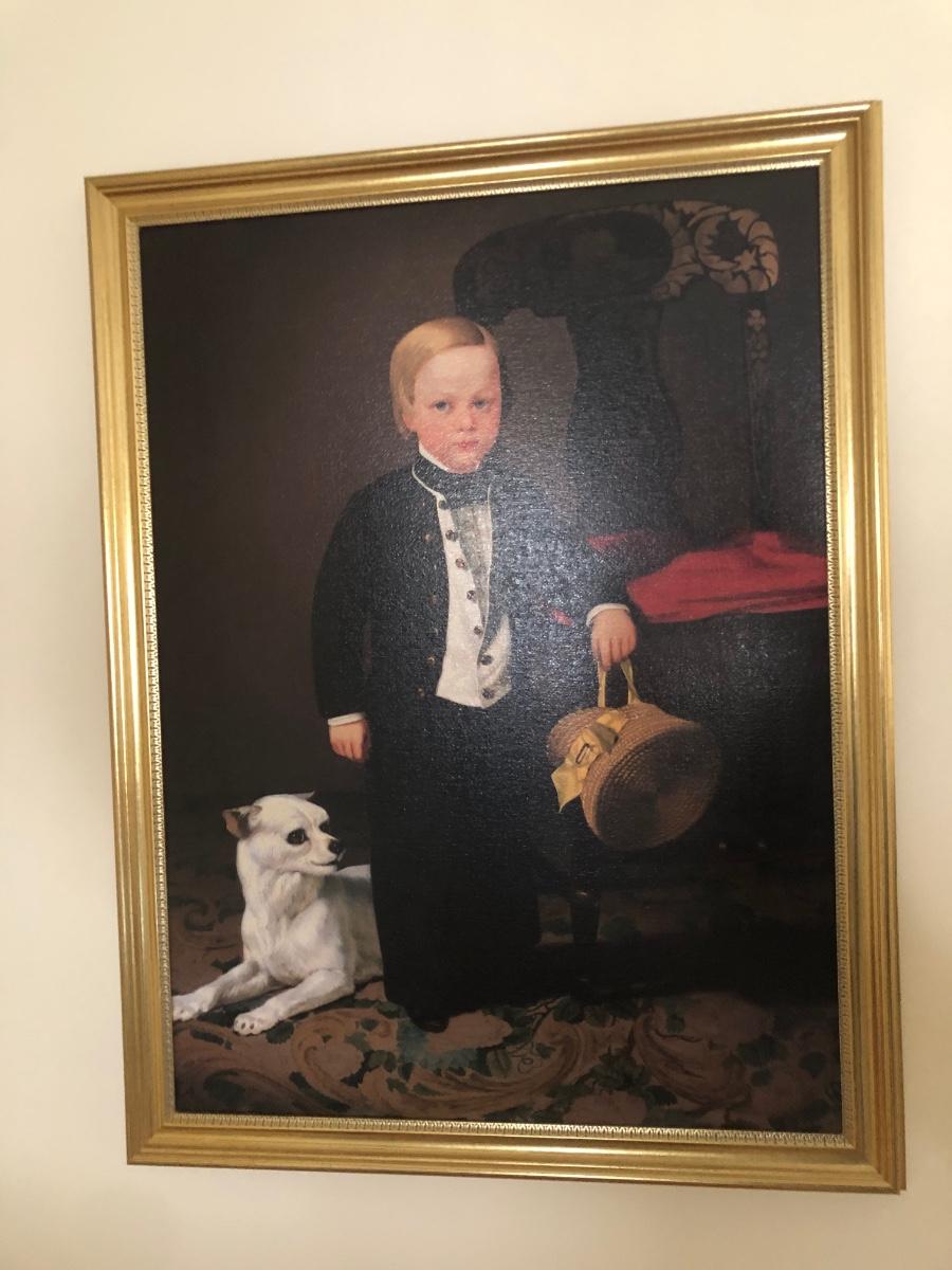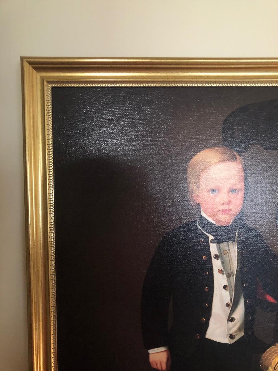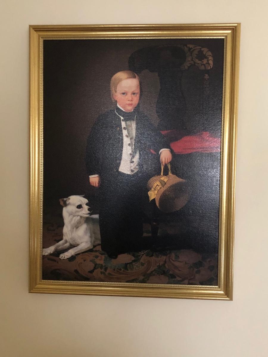 Print of "Boy with Dog" by American artist Charles Christian Nahl (1818-1878). Print on canvas. Gold colored frame included.