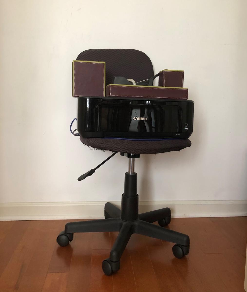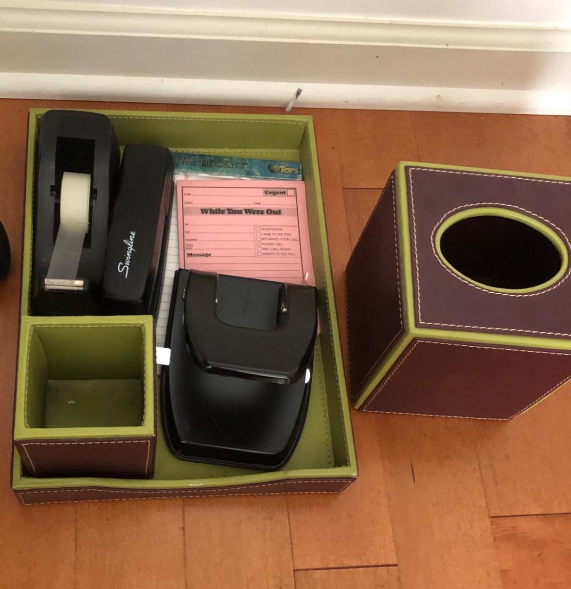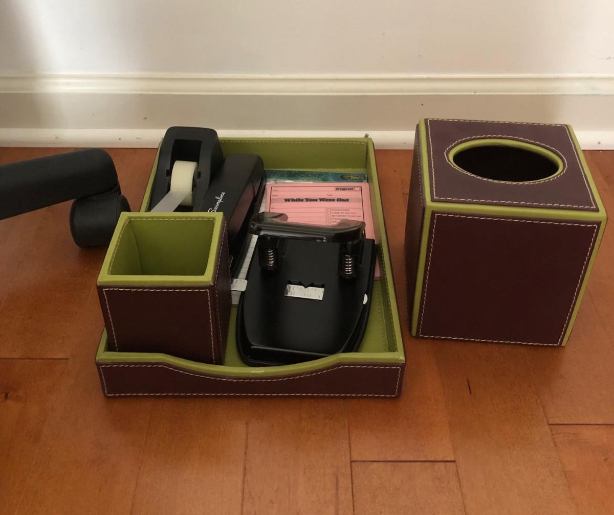 Canon PIXMA MG3620 printer is working per our client's knowledge. Printer features a scanner, photo printing, and built-in WiFi. Brown and green desk set includes paper tray, pencil cup, and tissue box cover. Office supplies included are hole punch, stapler, and tape holder.