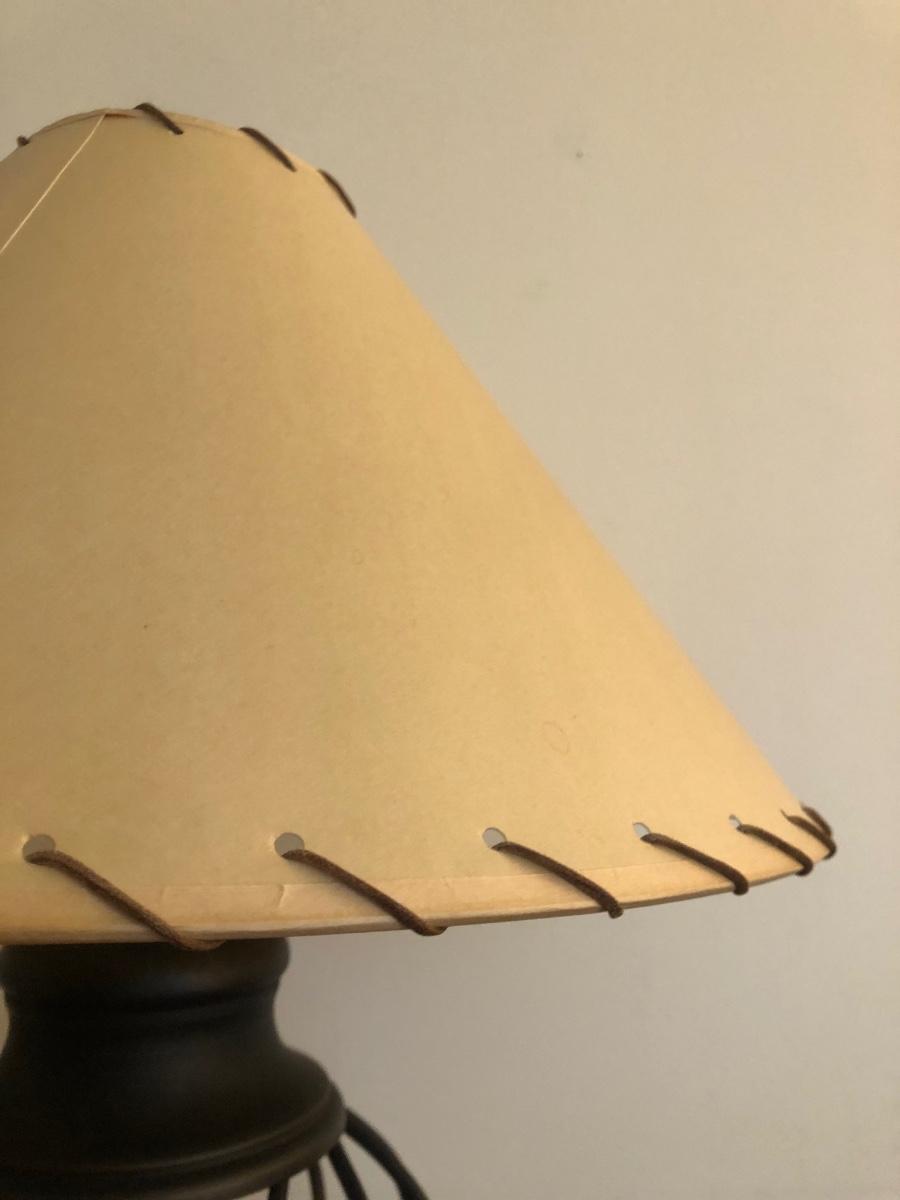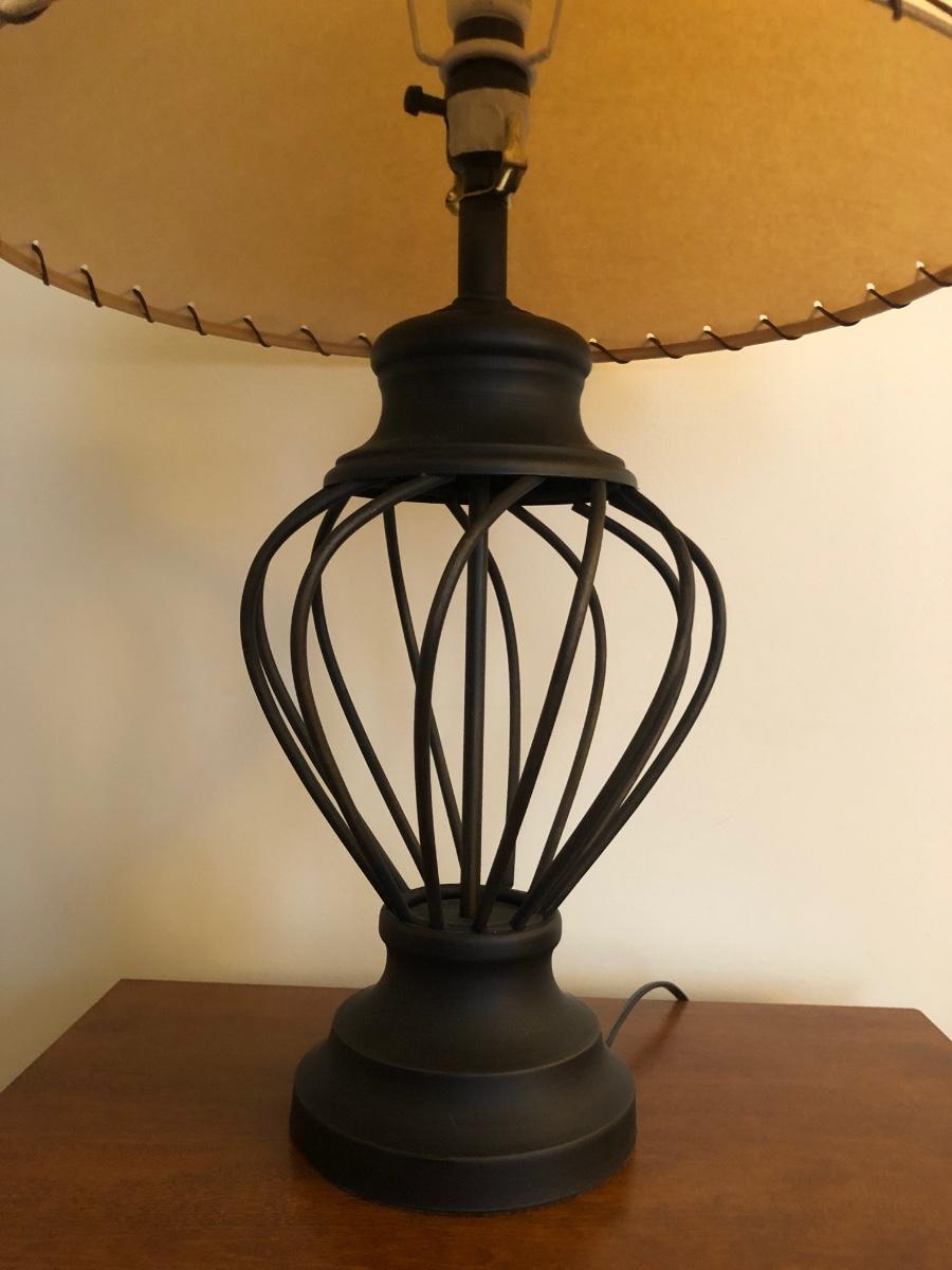Small end table is a light colored wood with black accents. Lamp is made of metal and is in working order.