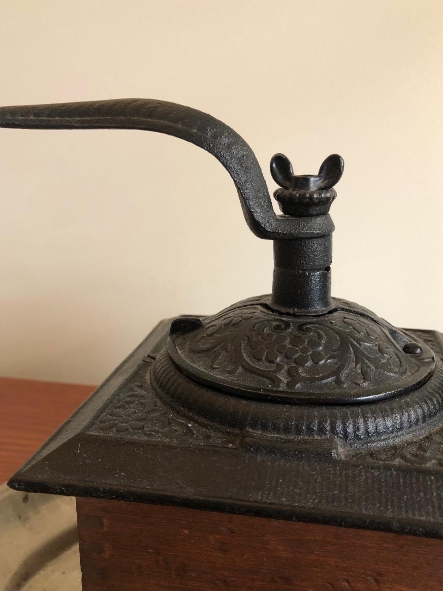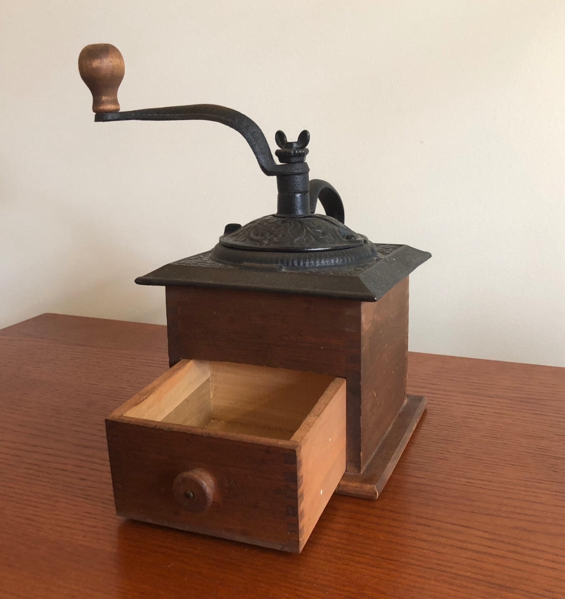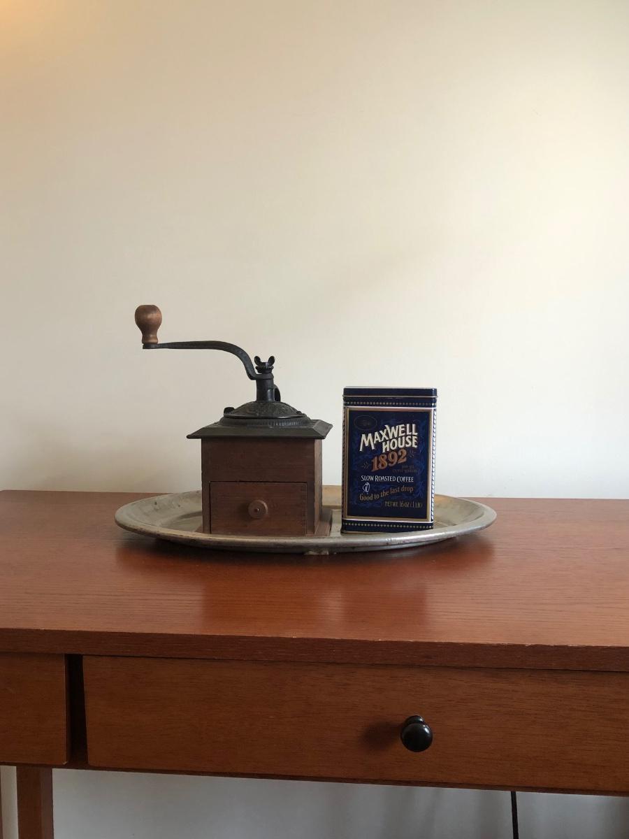 LOT70M: Vintage Wooden Coffee Grinder & Maxwell House Tin