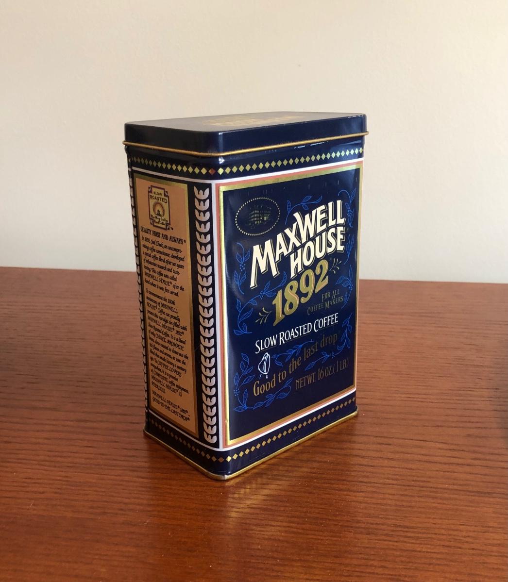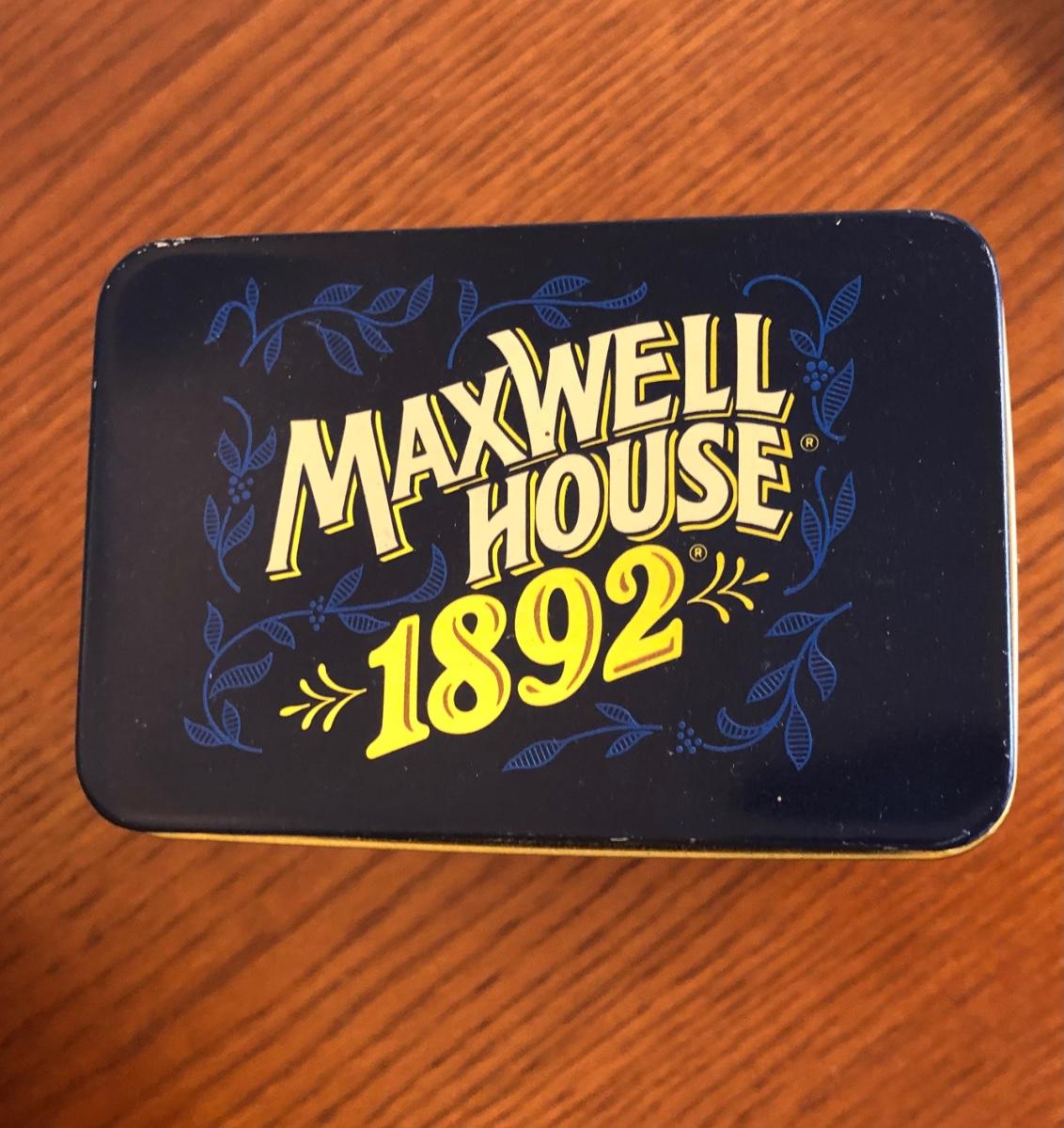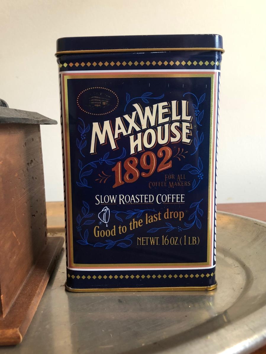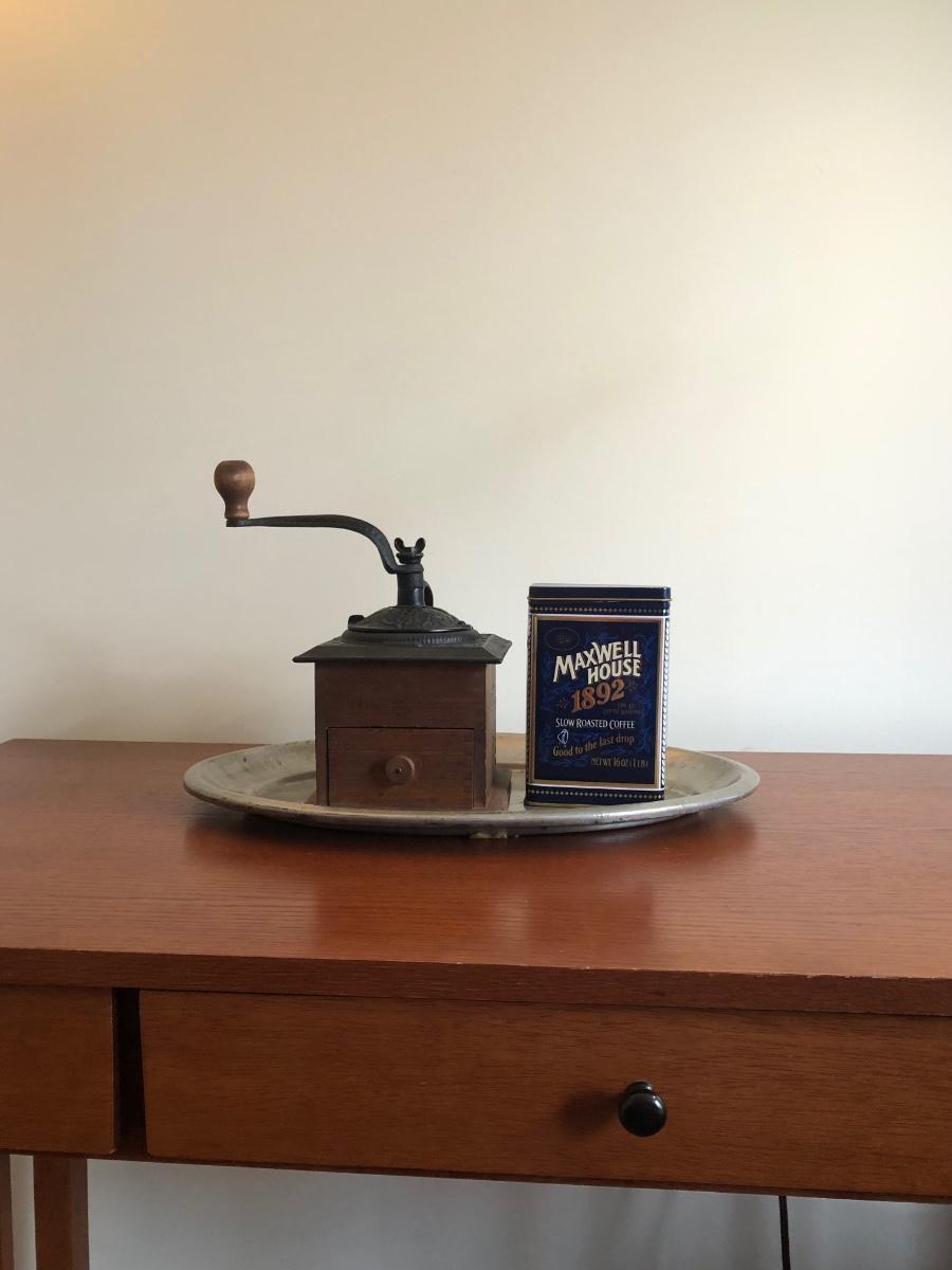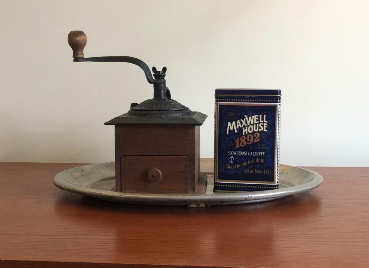Coffee grinder is made of wood with a metal handle and a working wooden drawer. The 16 ounce blue coffee tin says "Maxwell House 1892: Slow Roasted Coffee, Good to the last drop." Serving tray included.
