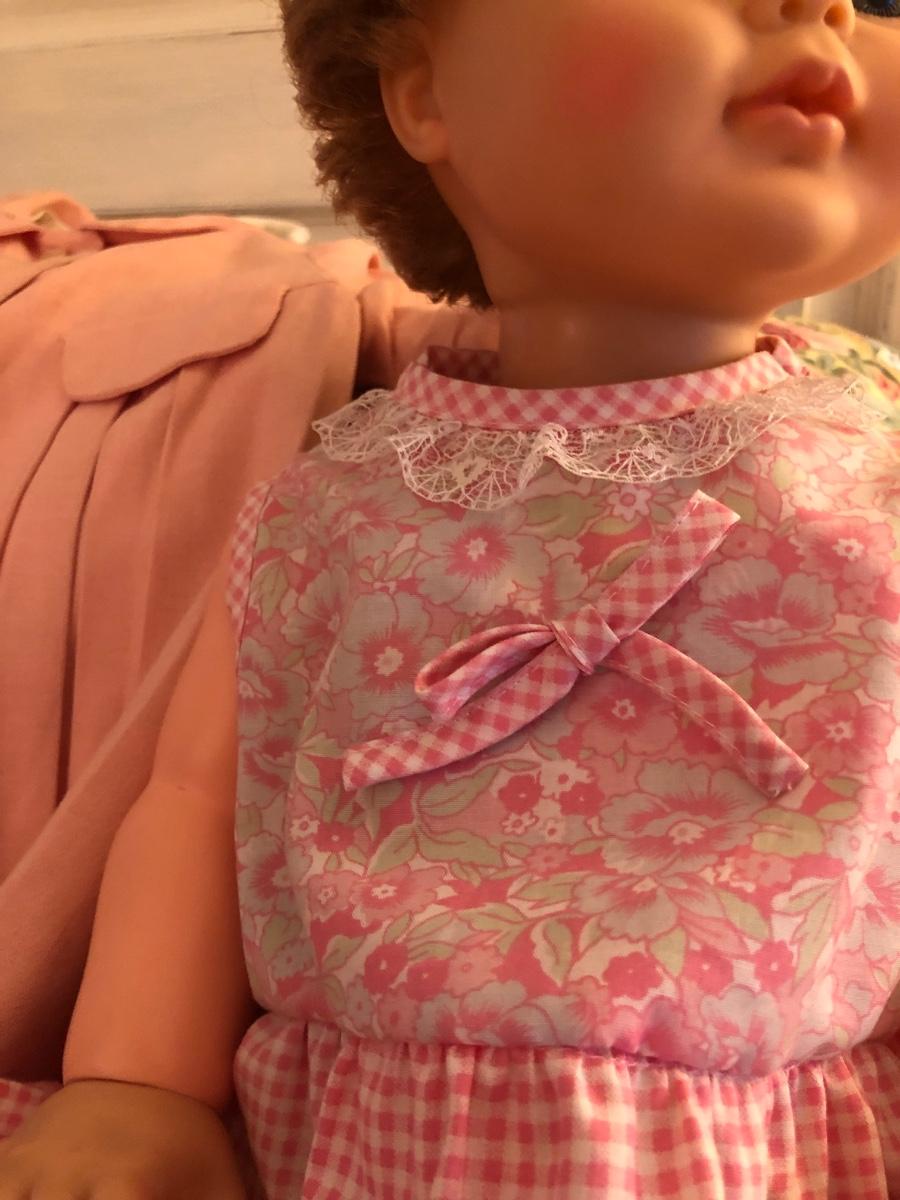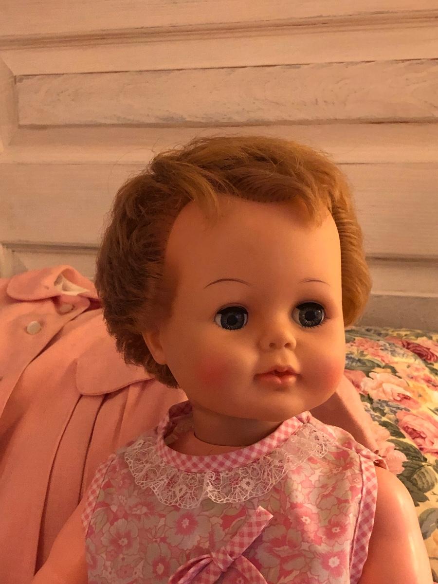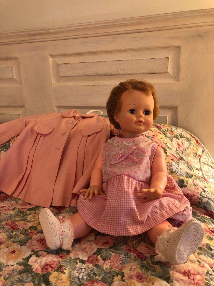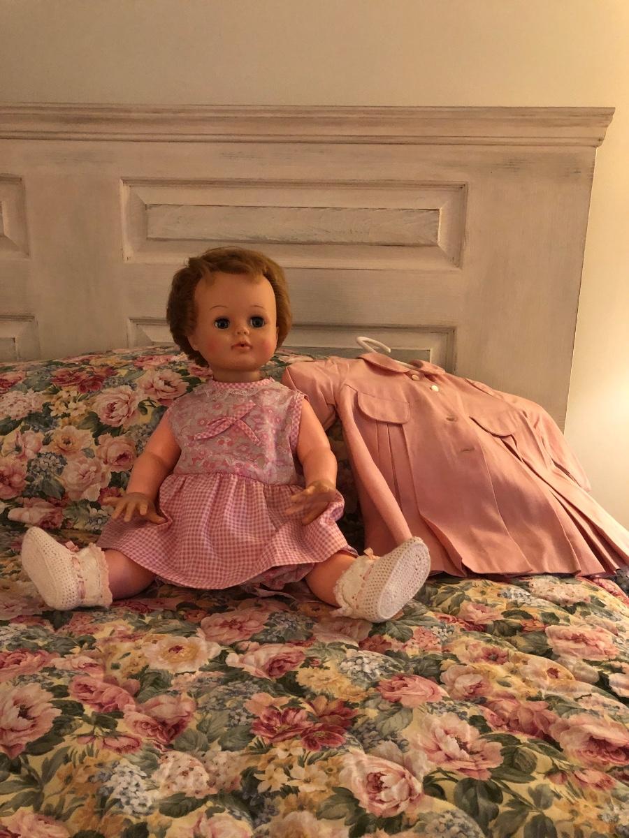 This 22 inch 1960s Kissy Doll is in fair condition with some noticeable wear. Her eyes still open and close as the doll is shifted up and down. She is in a pink outfit with gingham and floral prints and has crocheted white booties with pink ribbon. She includes a pink coat with a small stain on the collar (see photos).