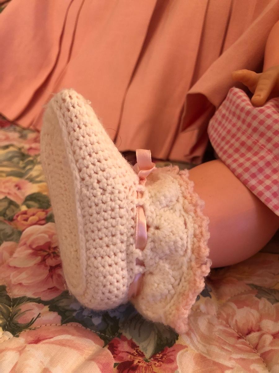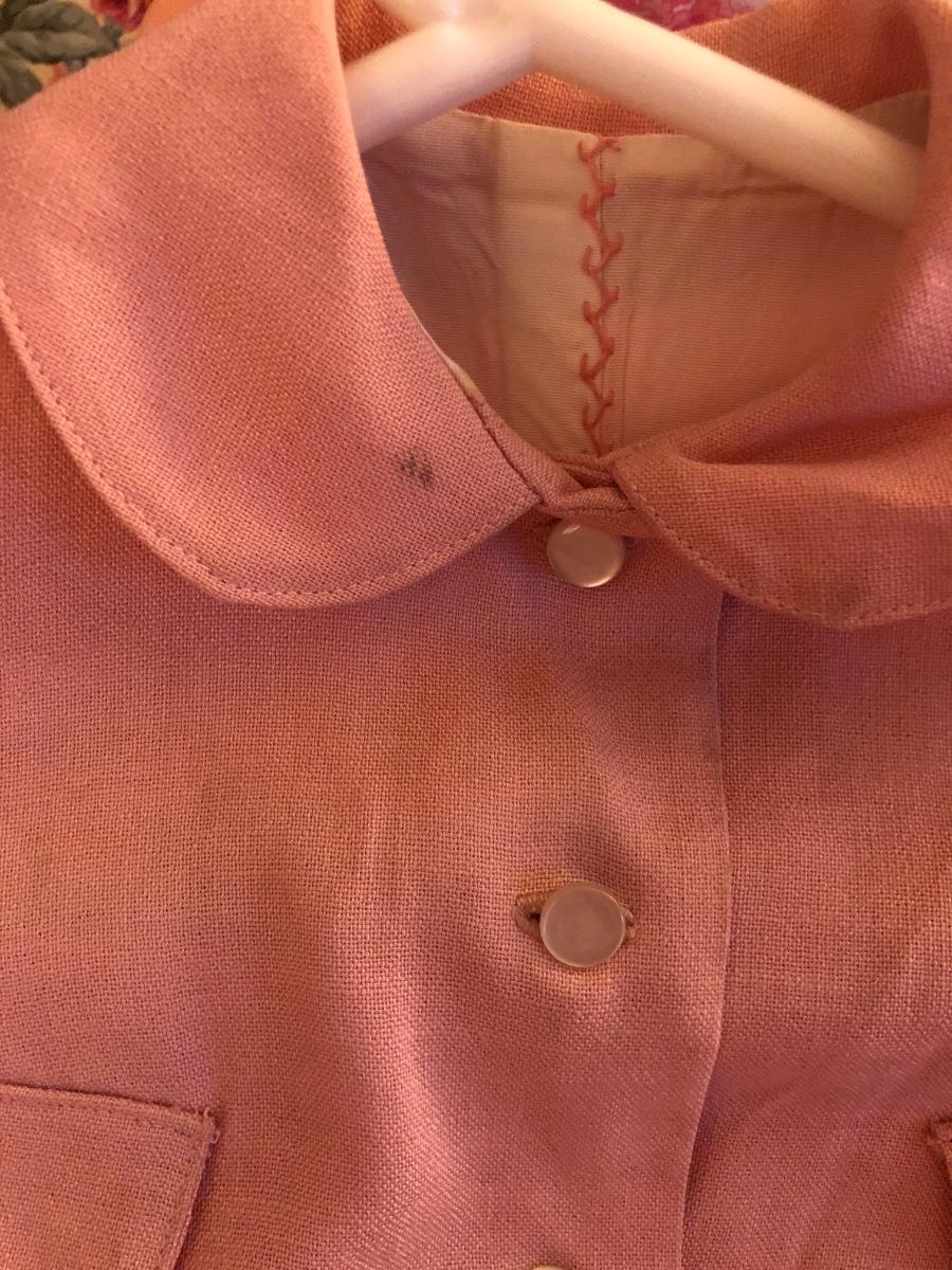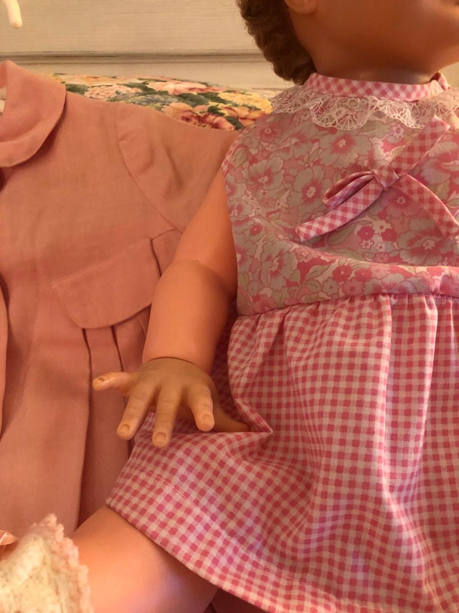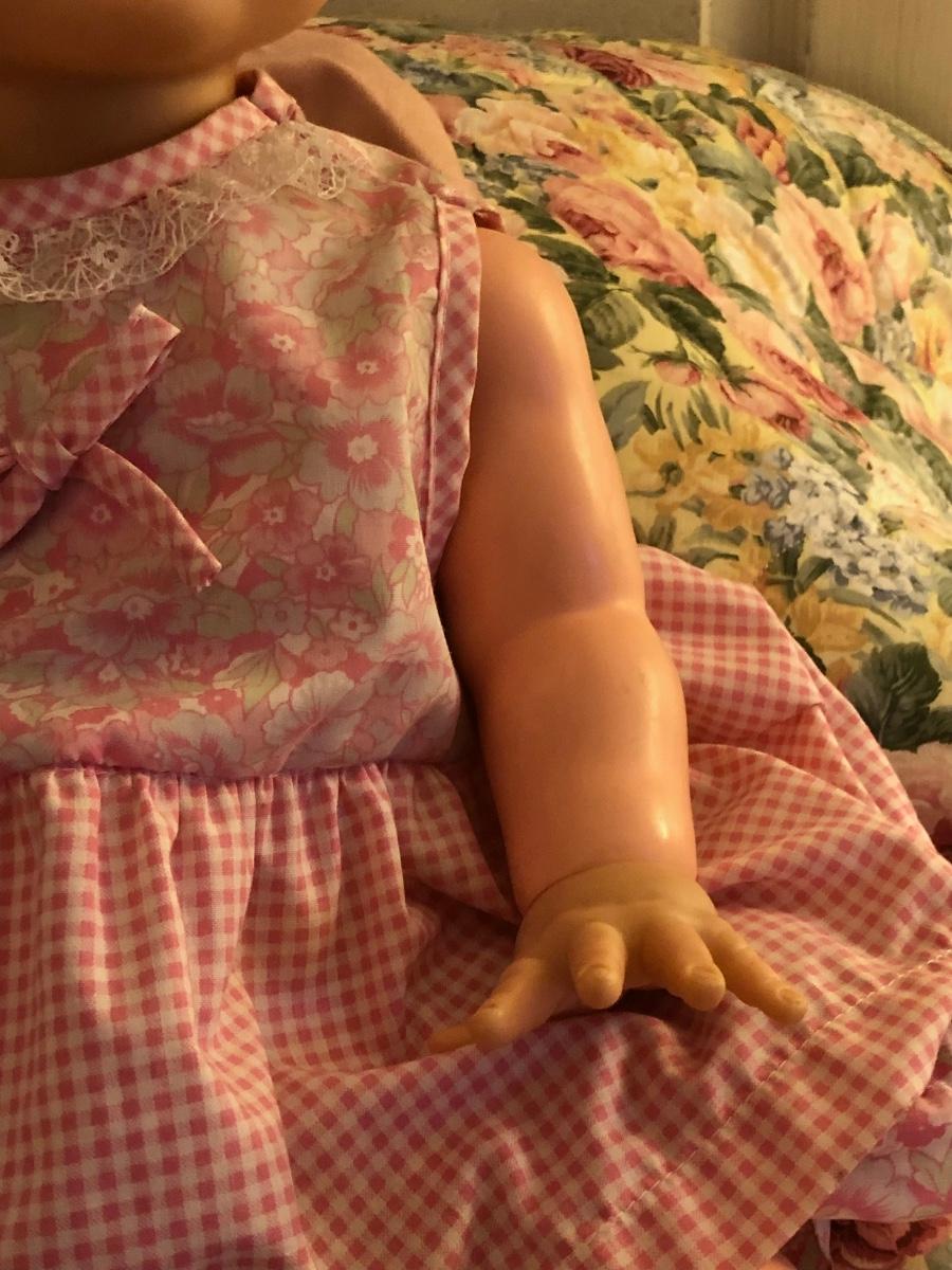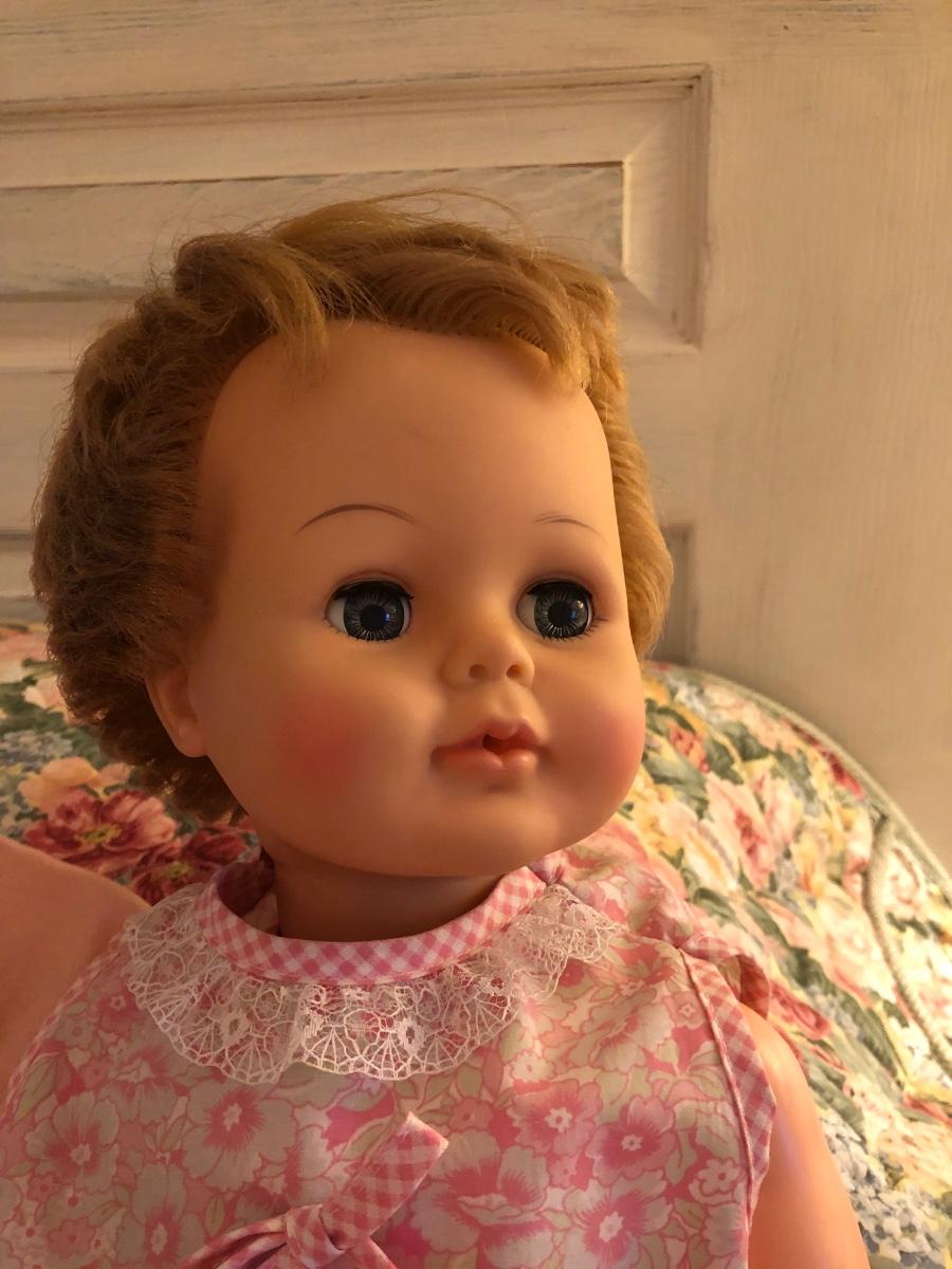 This 22 inch 1960s Kissy Doll is in fair condition with some noticeable wear. Her eyes still open and close as the doll is shifted up and down. She is in a pink outfit with gingham and floral prints and has crocheted white booties with pink ribbon. She includes a pink coat with a small stain on the collar (see photos).