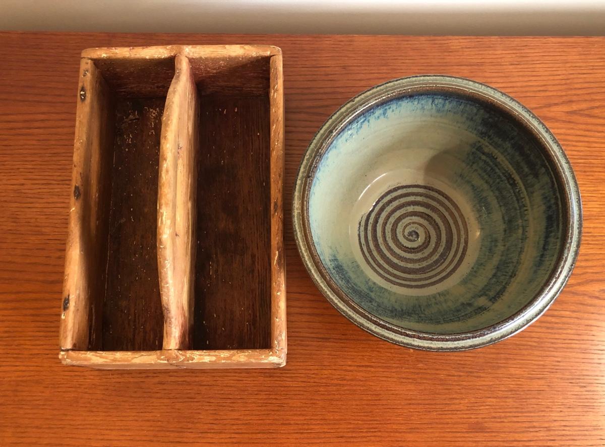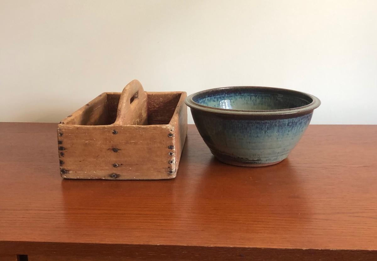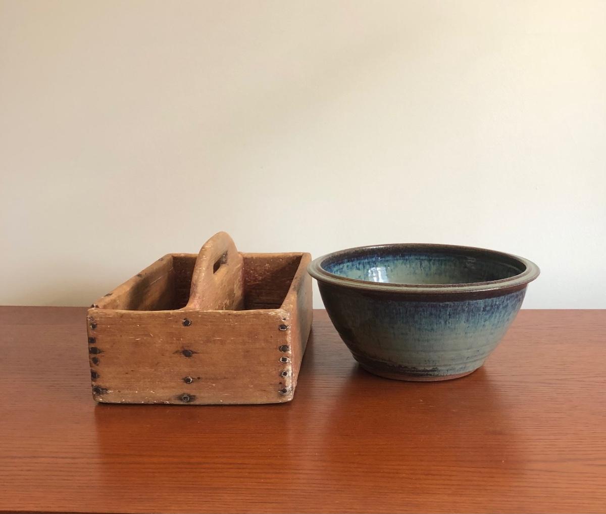 LOT74M: Handmade, Signed Pottery Bowl & Vintage Primitive Caddy