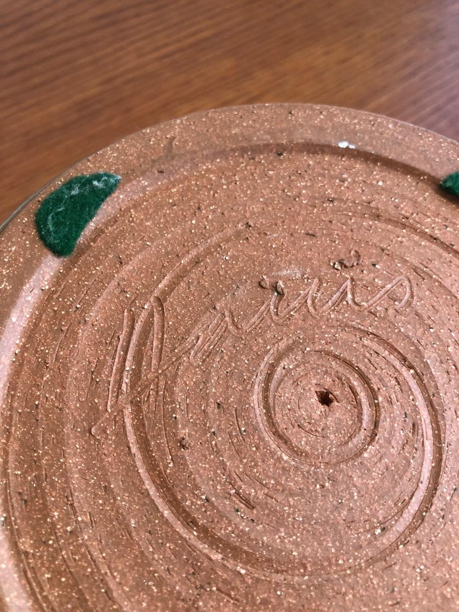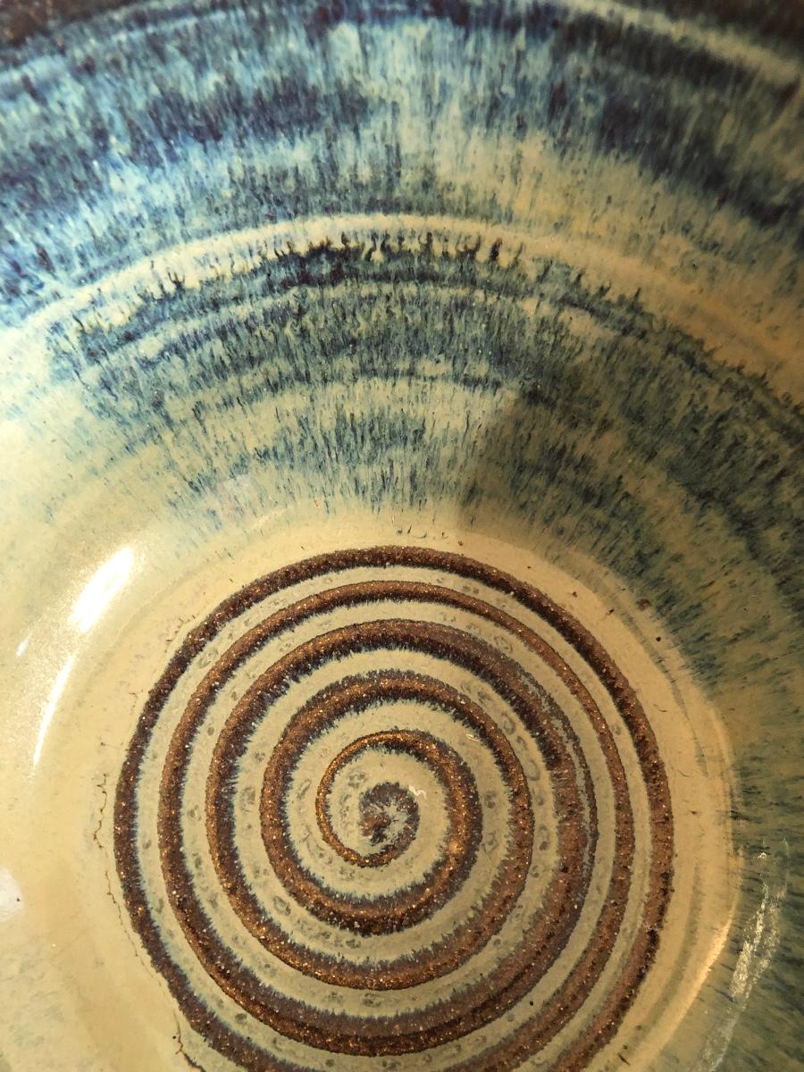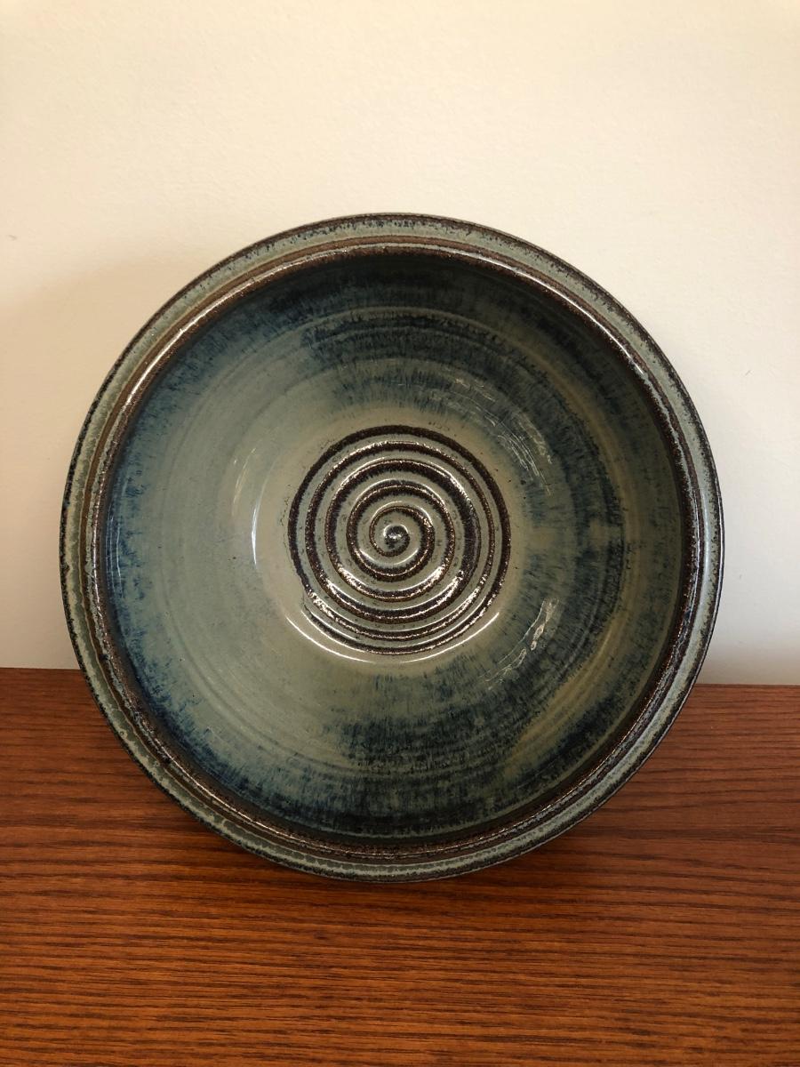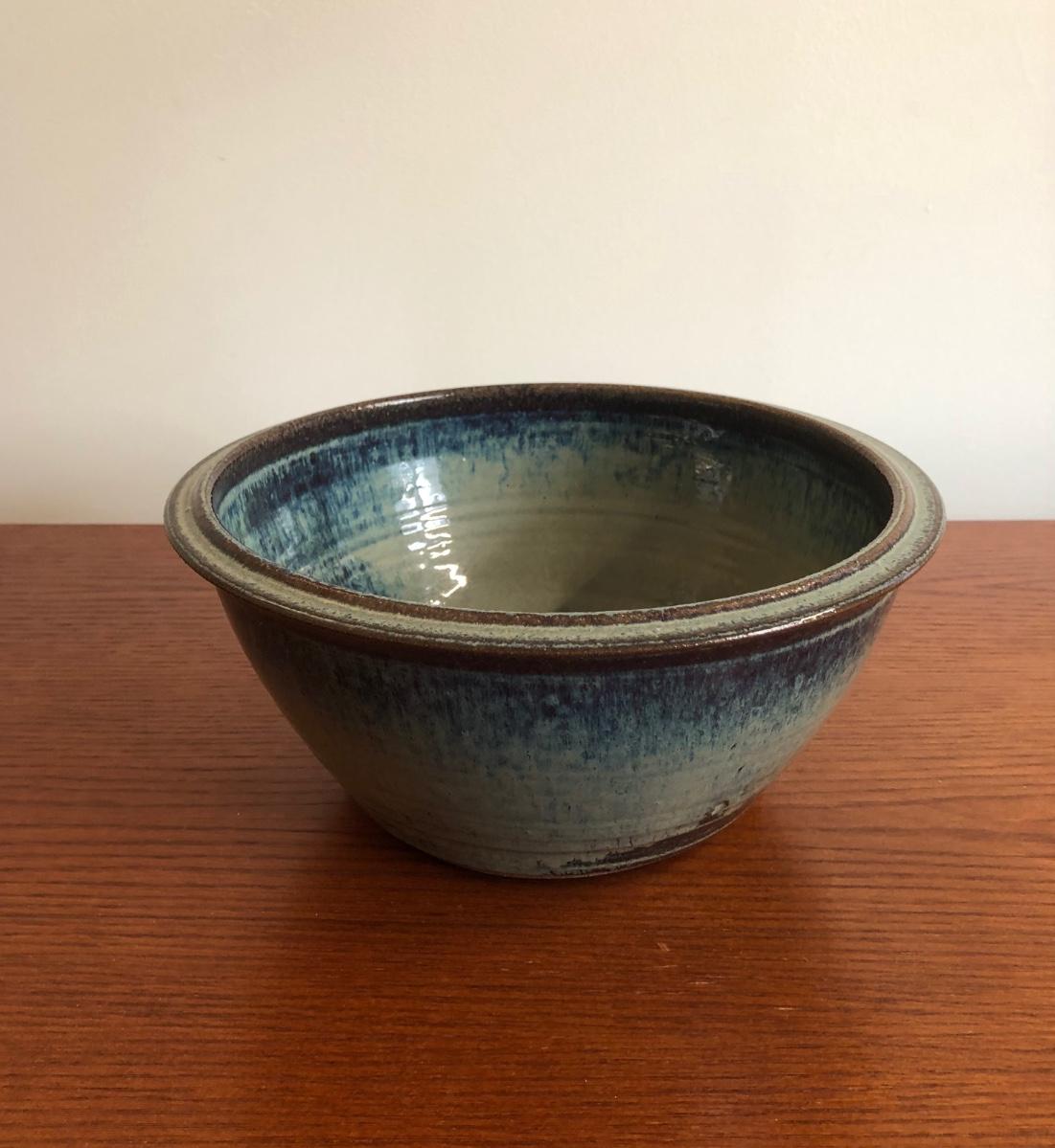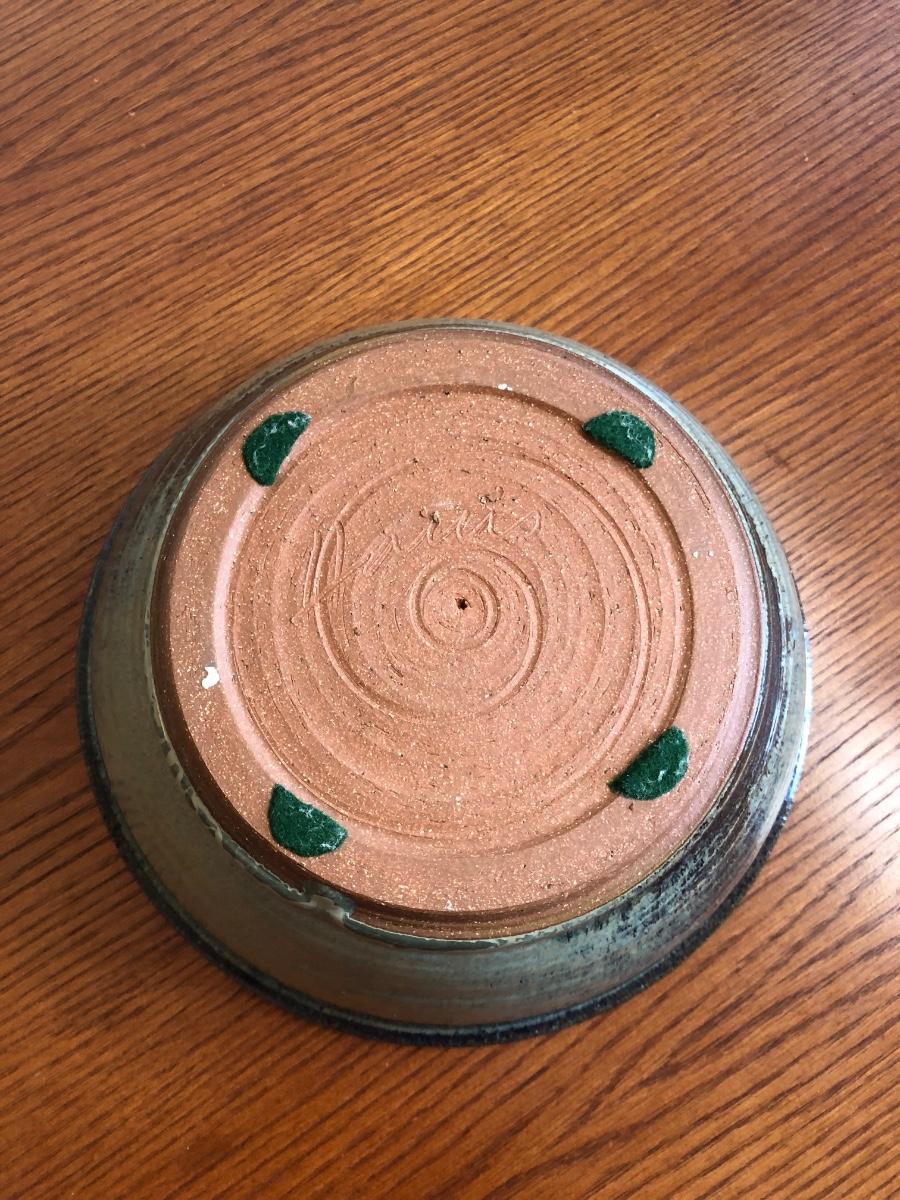The bowl is blue and green with brown accents and is signed "Harris" on the bottom. The carrier appears worn.
