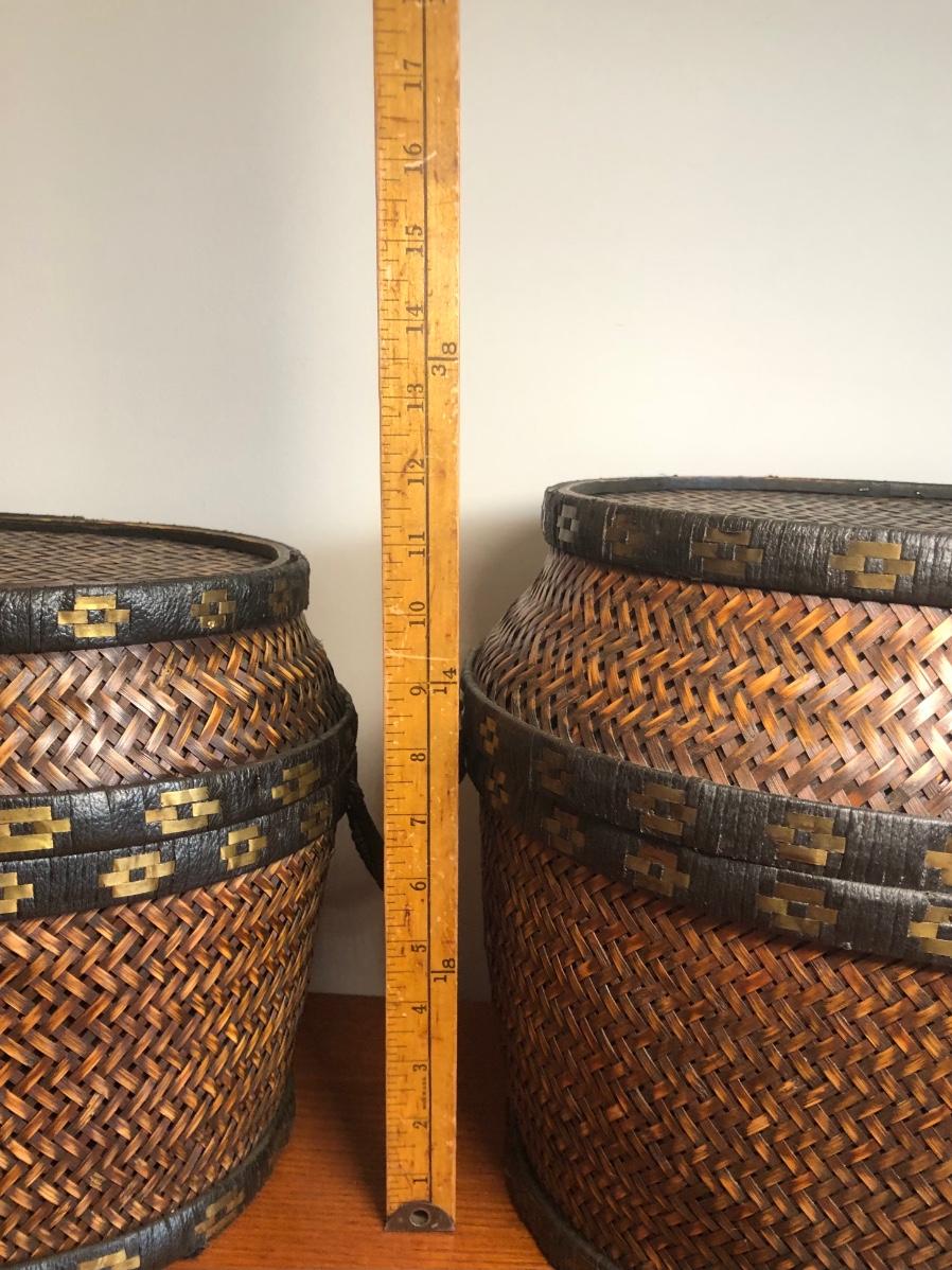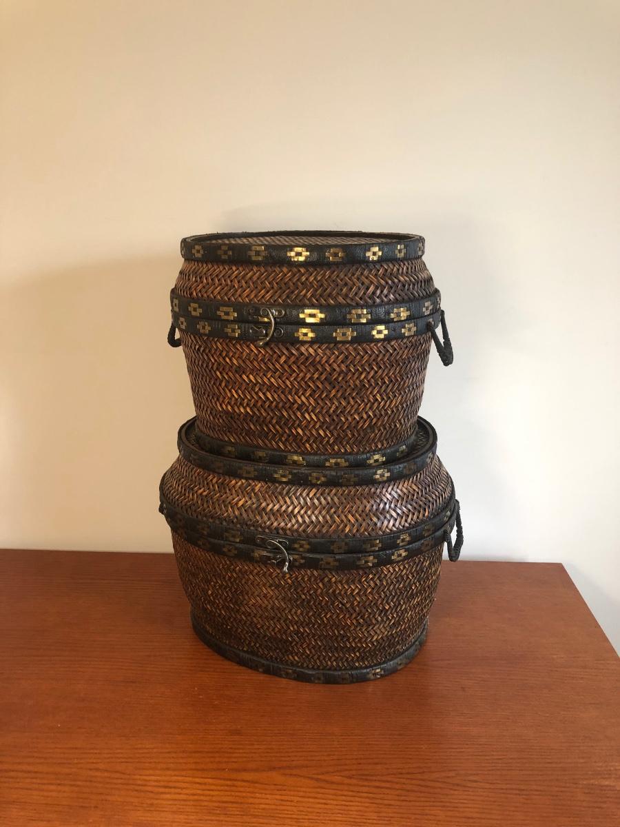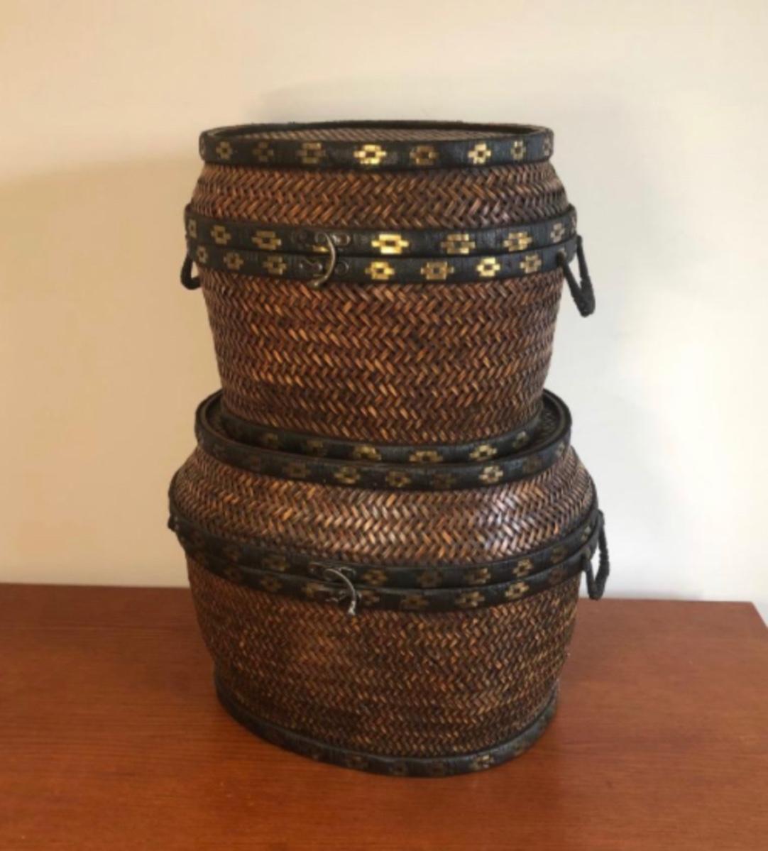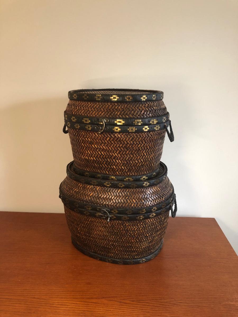 These baskets are a brown wicker with dark brown and gold accents. They have wicker handles and metal clasps. Contents of the baskets are included: 9 electric candles with 3 timers.