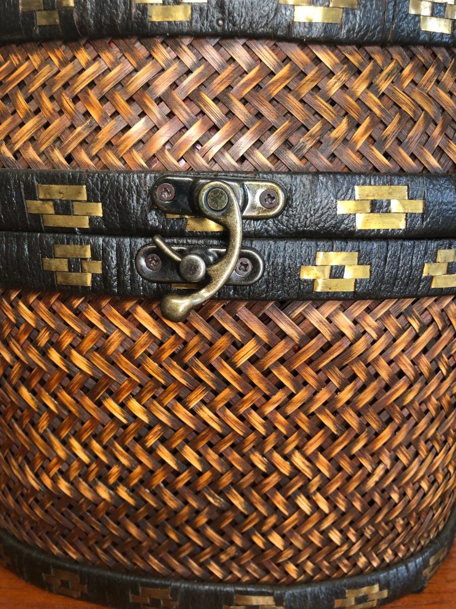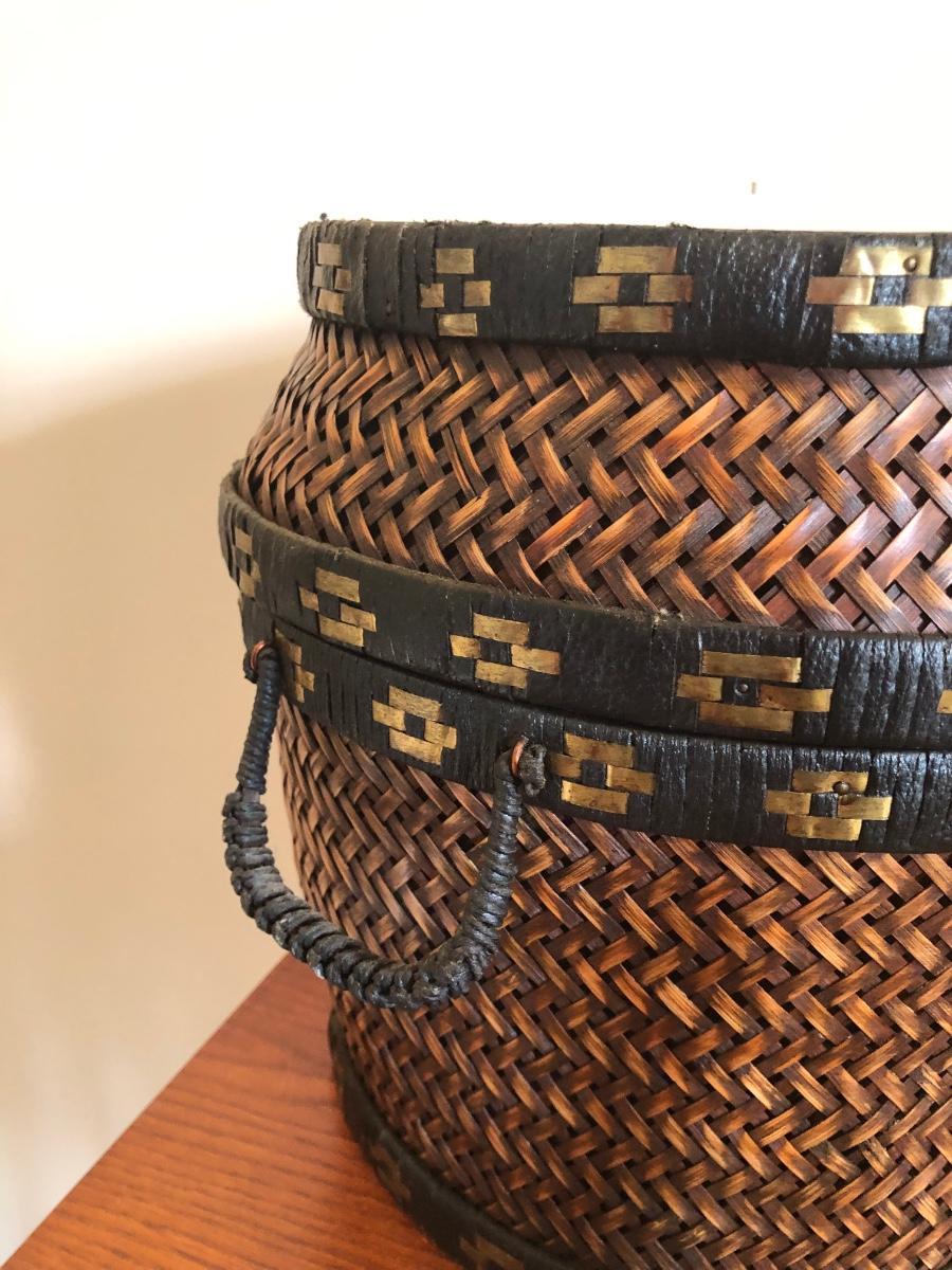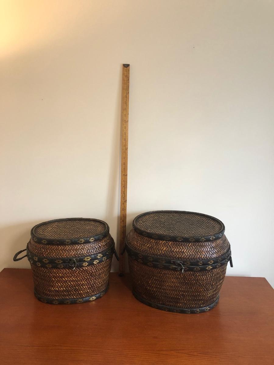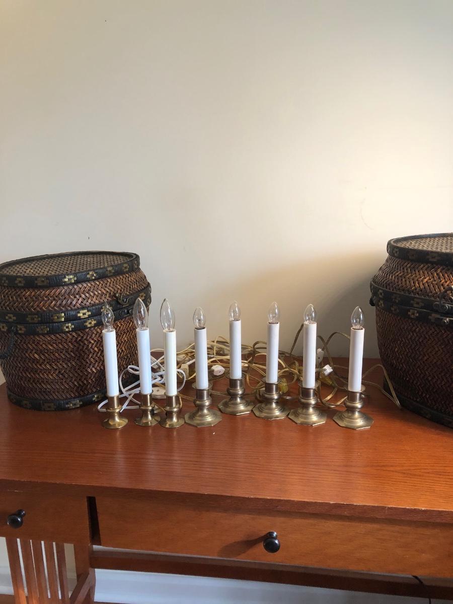 These baskets are a brown wicker with dark brown and gold accents. They have wicker handles and metal clasps. Contents of the baskets are included: 9 electric candles with 3 timers.