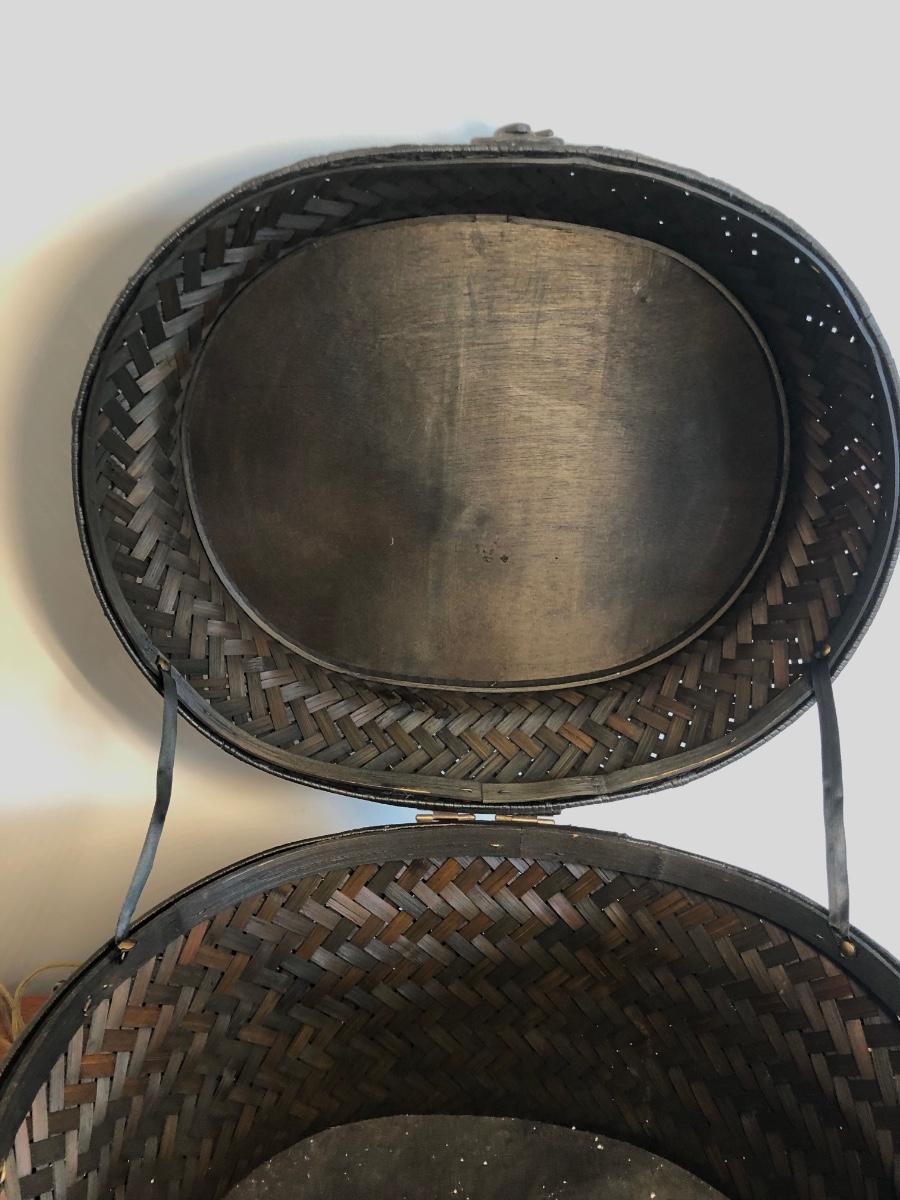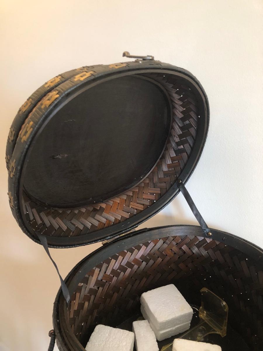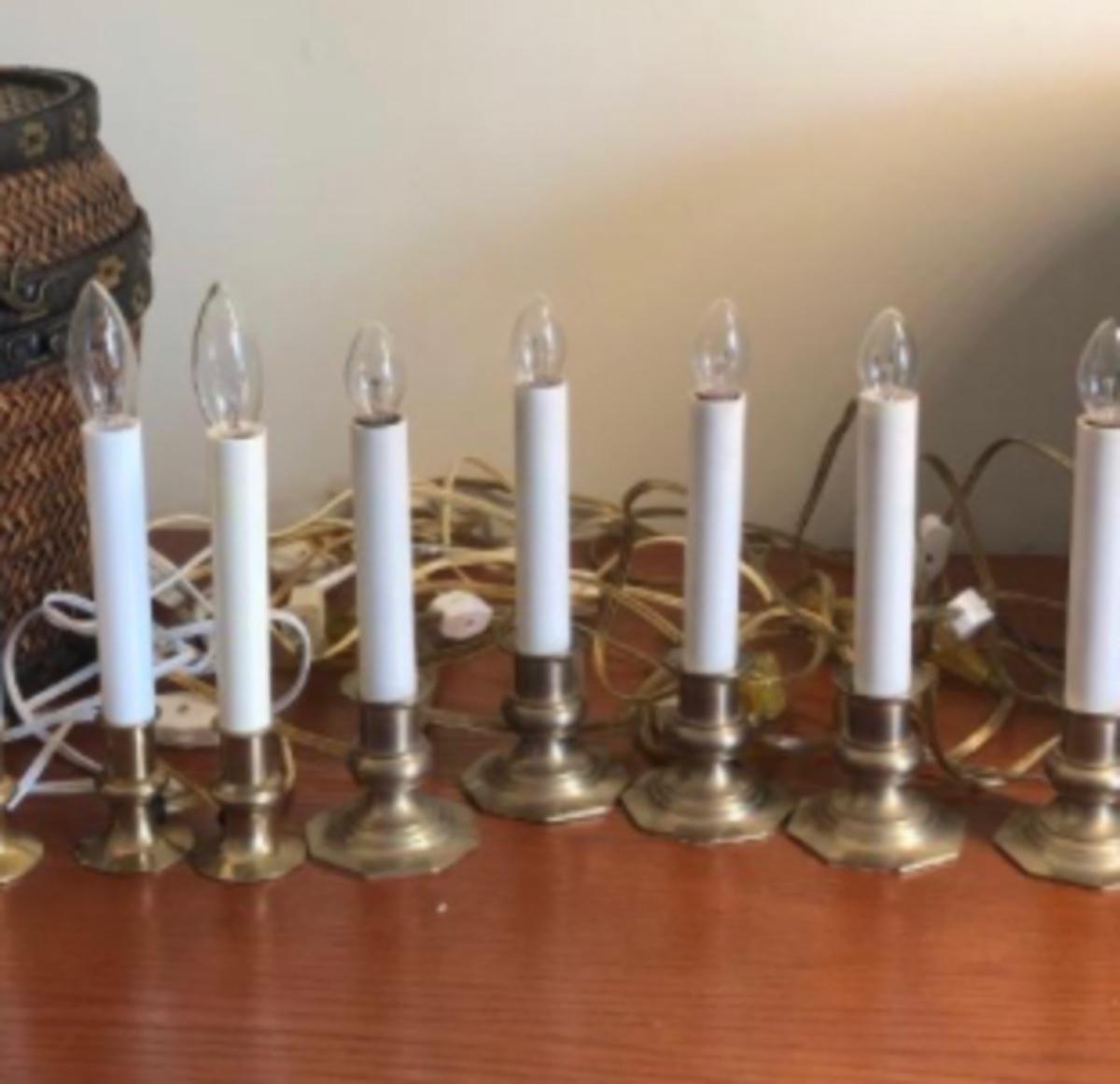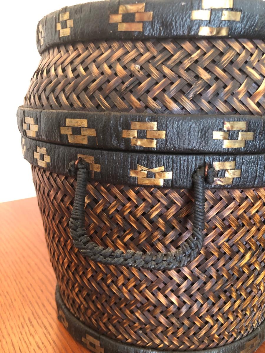 These baskets are a brown wicker with dark brown and gold accents. They have wicker handles and metal clasps. Contents of the baskets are included: 9 electric candles with 3 timers.